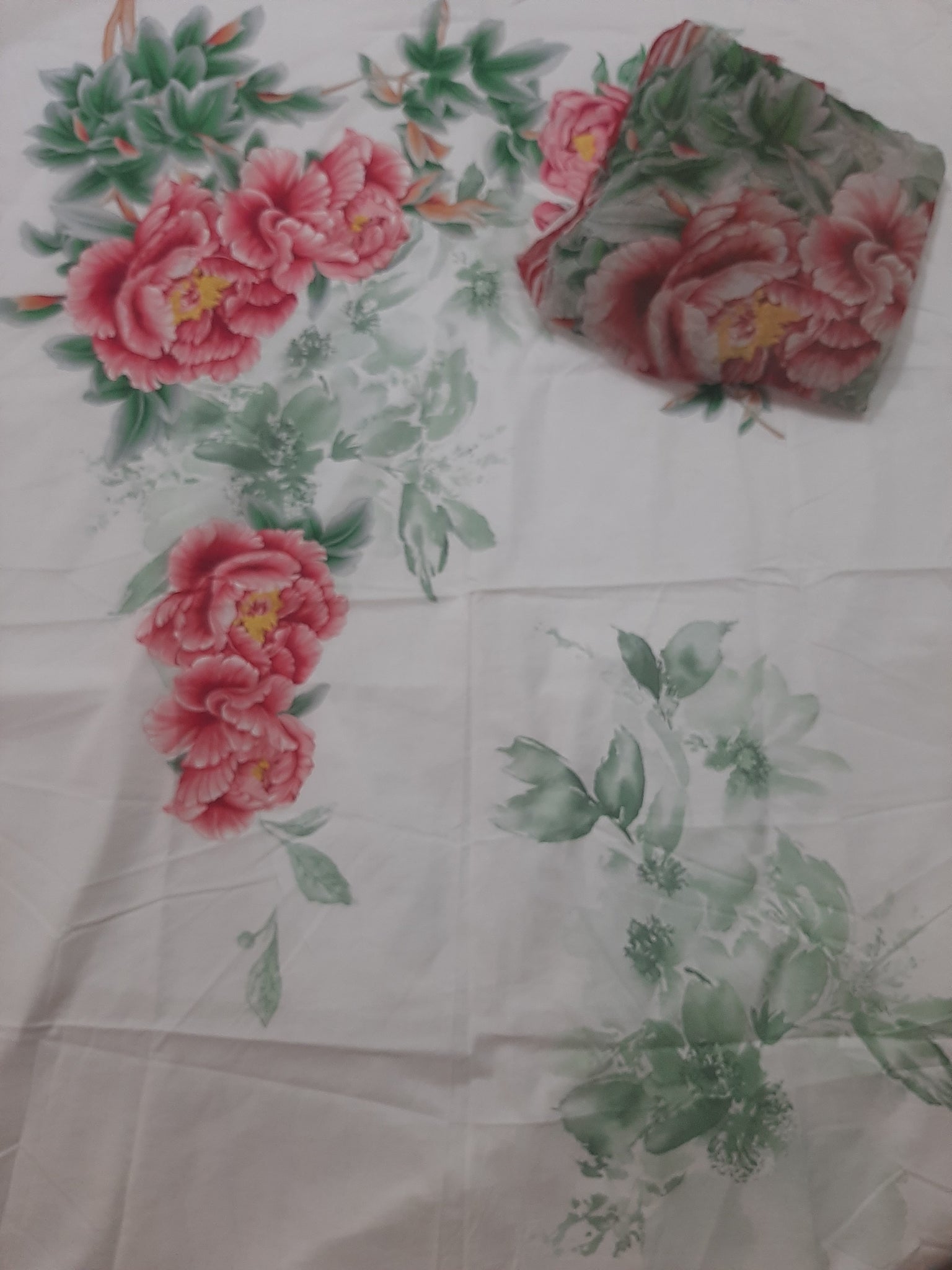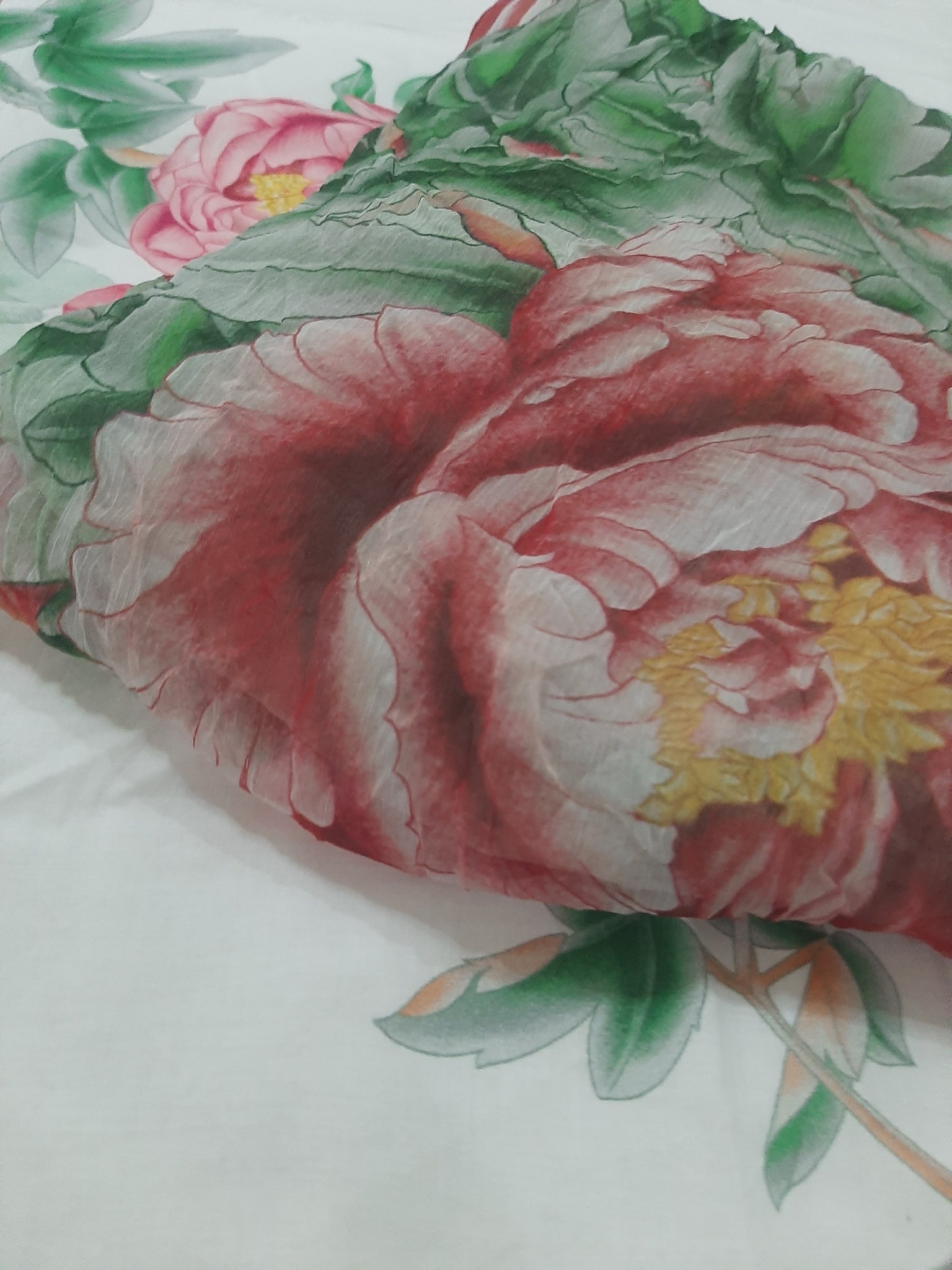 Fully  printed duppta on pure chiffon. Measurement of duppta is more than 2.5 yards with minor hole at border or kinari length wise in the center, easily adjustable in piko cutting.