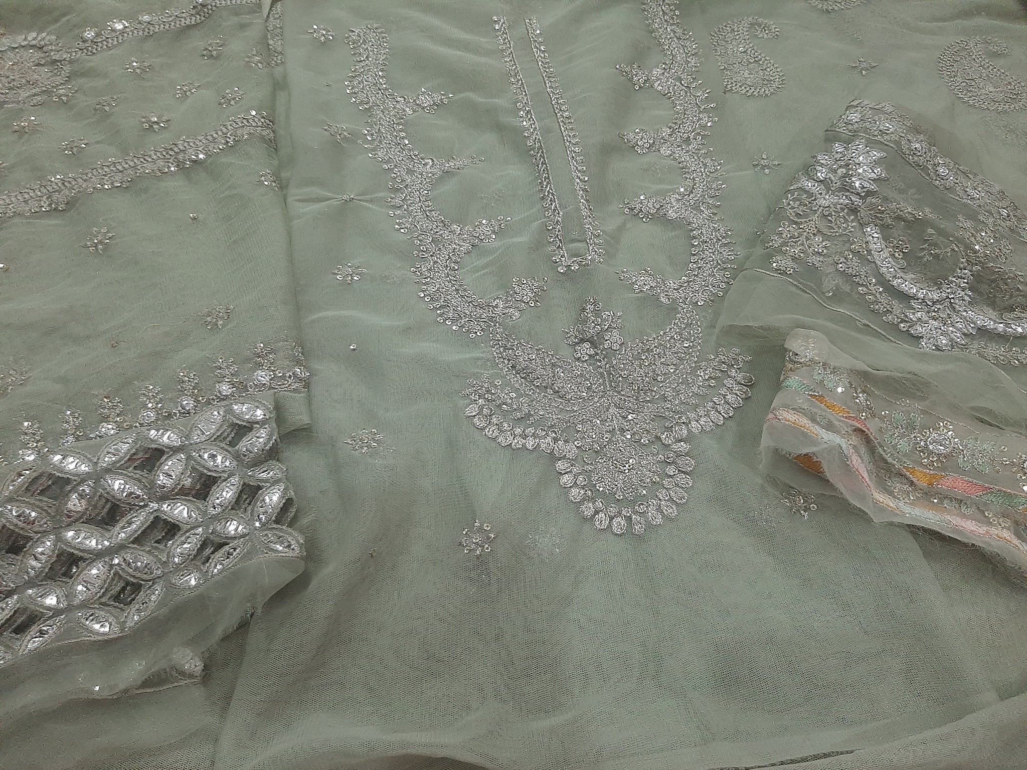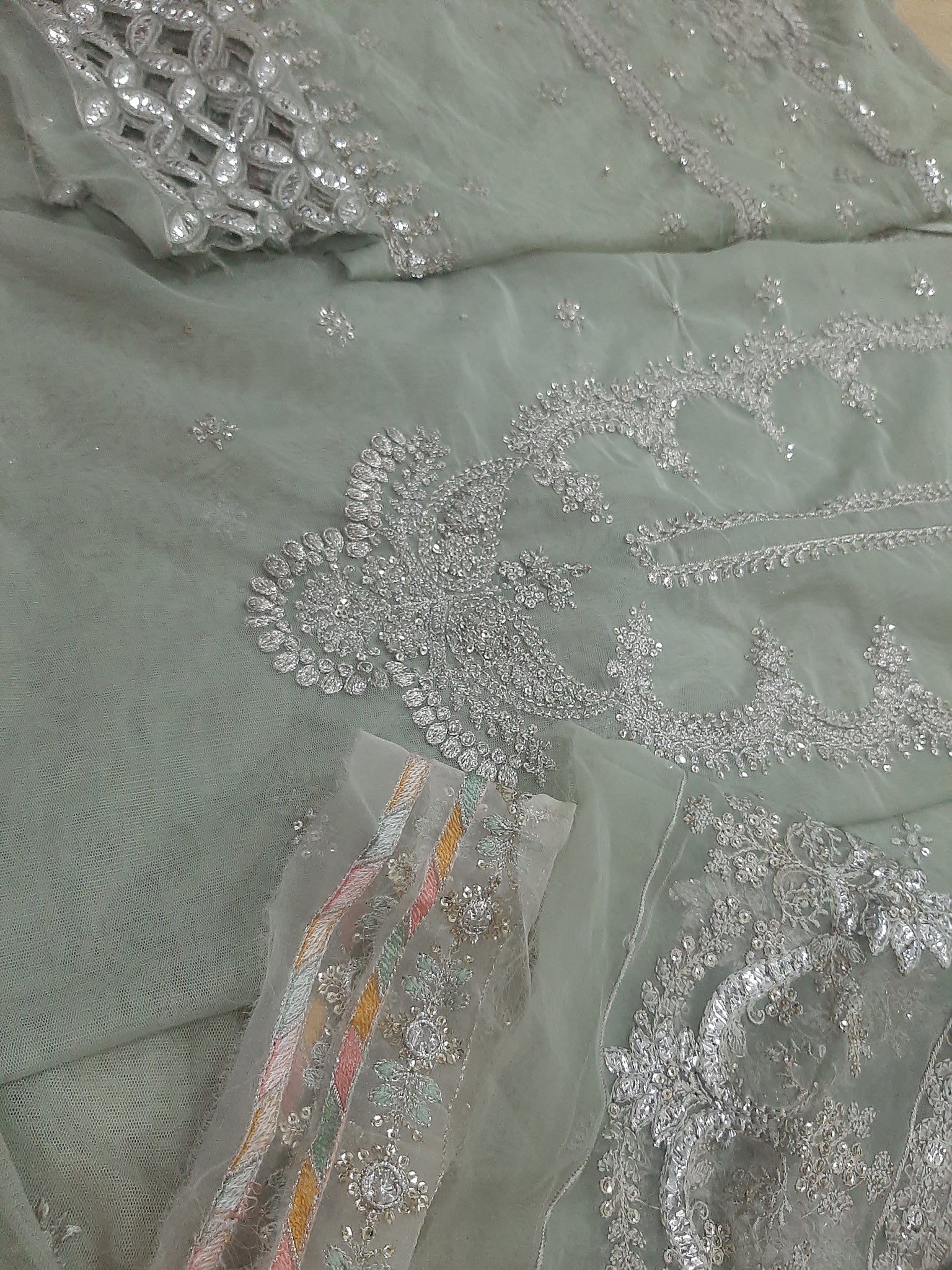Heavily thread and silver tilla embroidered embroidered with golden sequins embellishment sleeves pair standard Size.