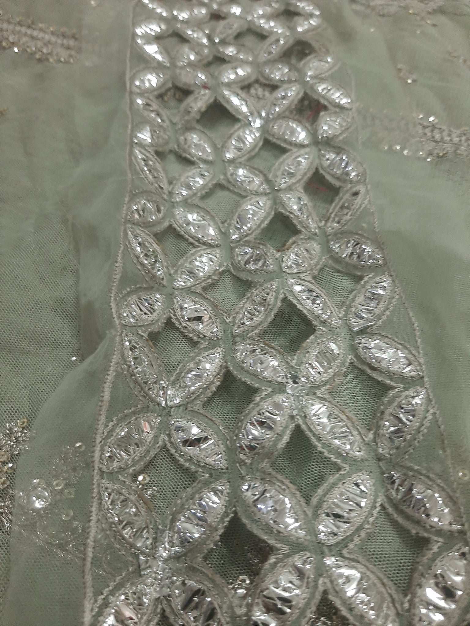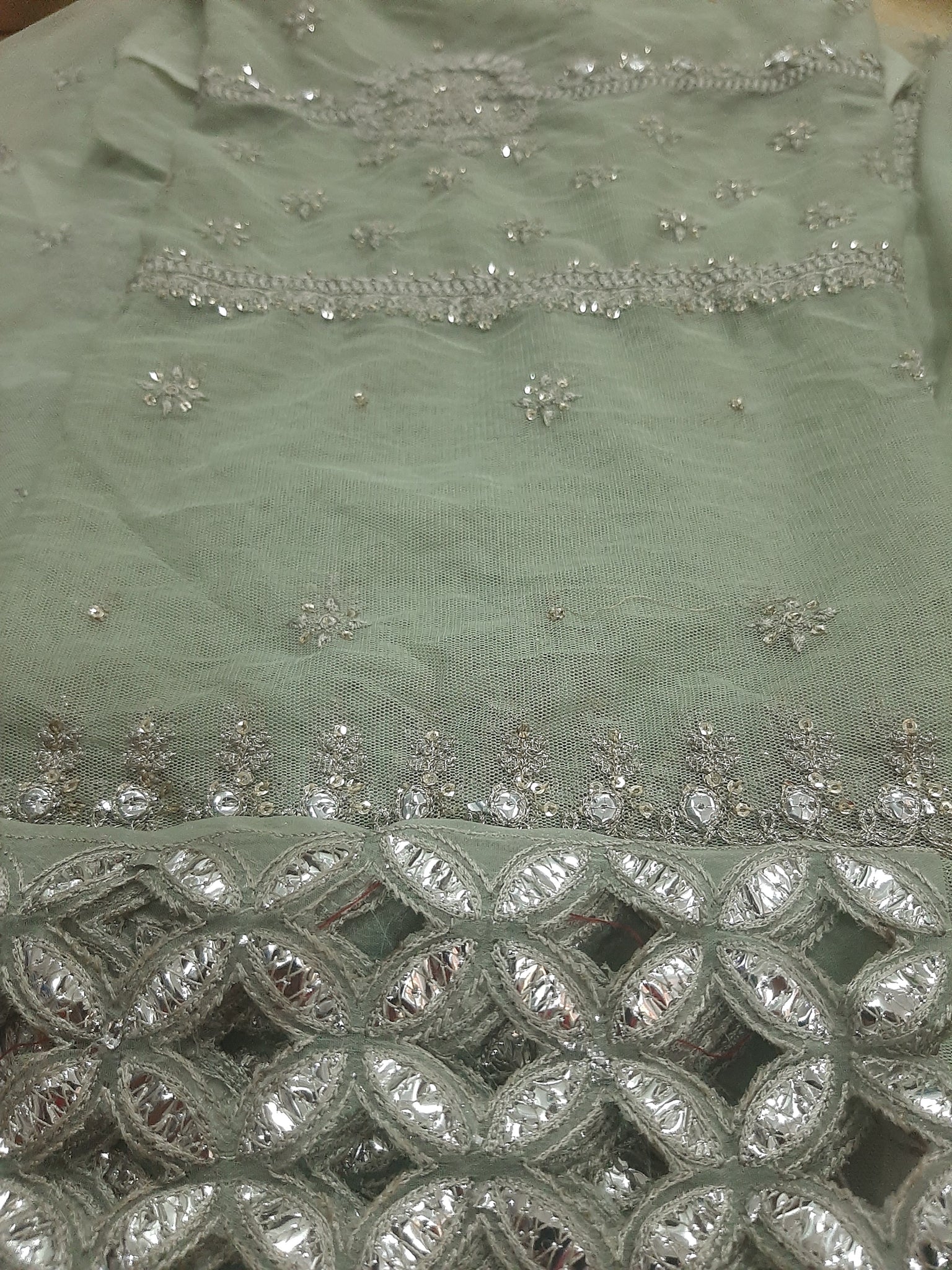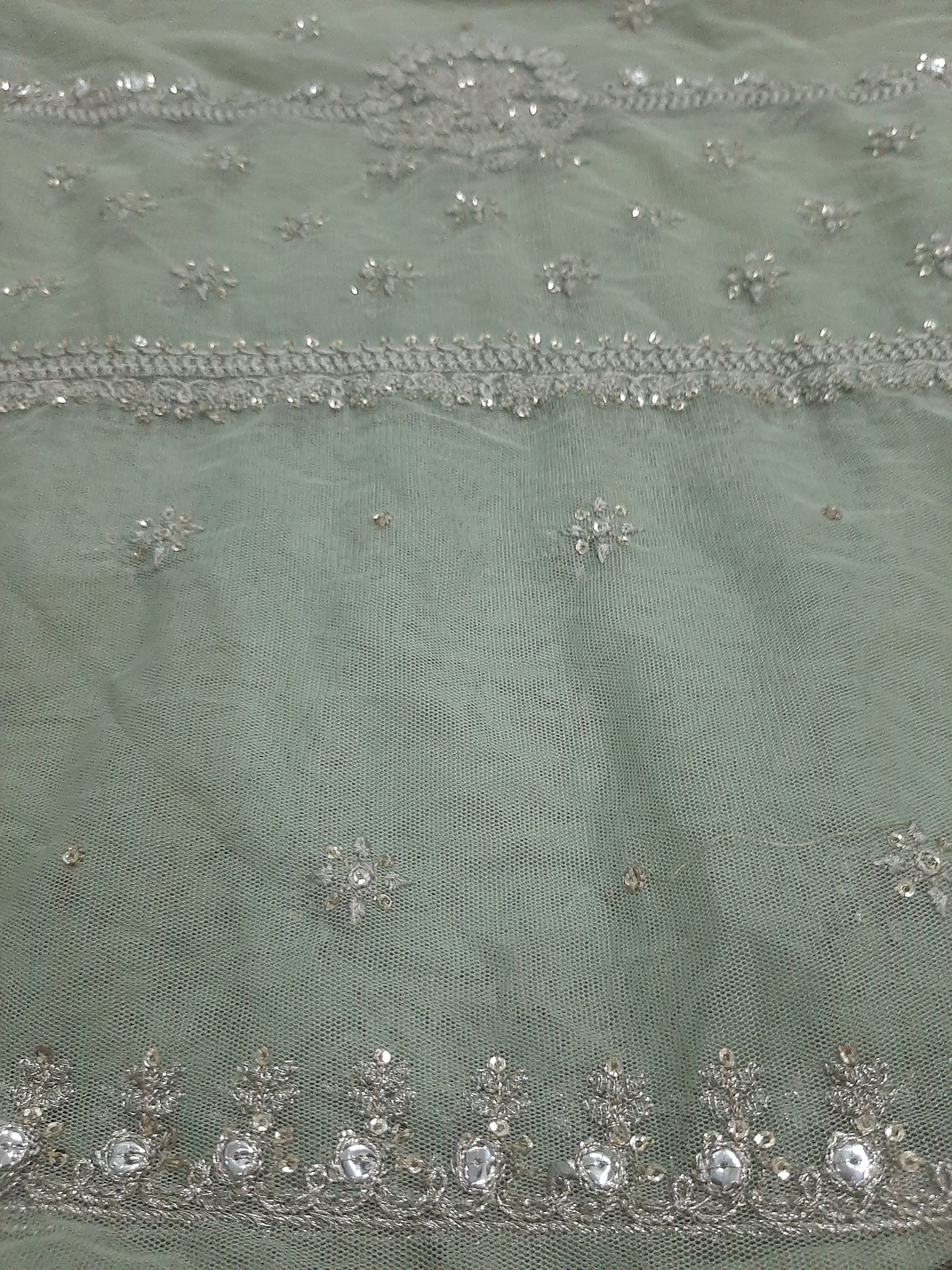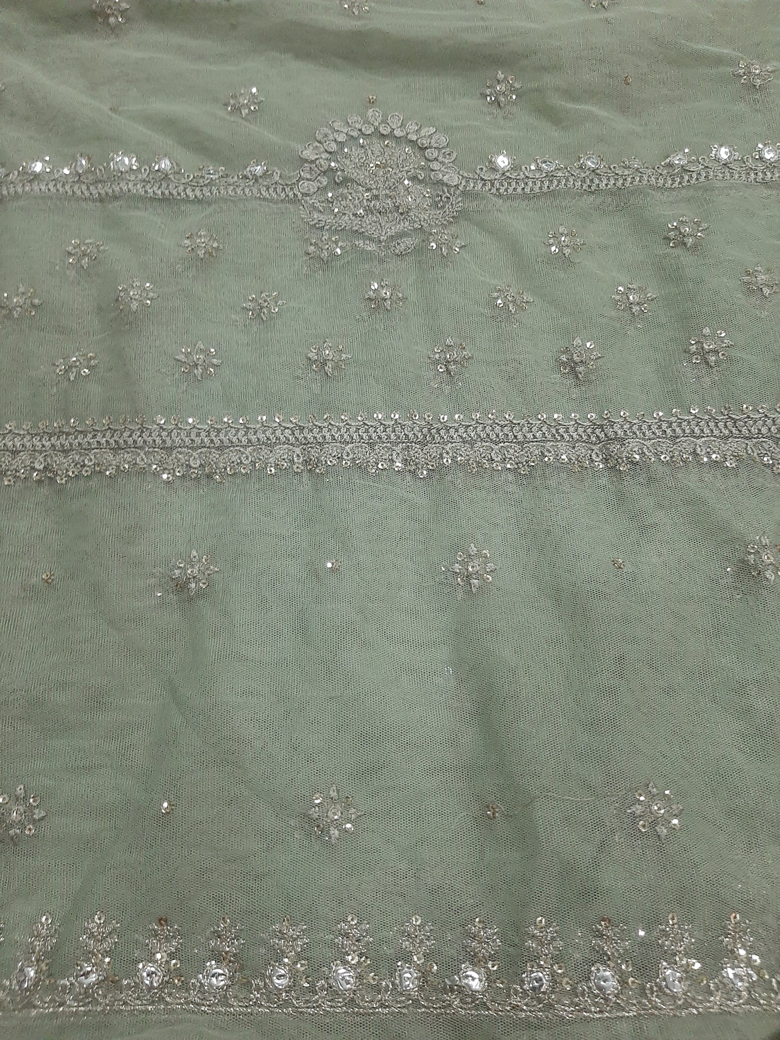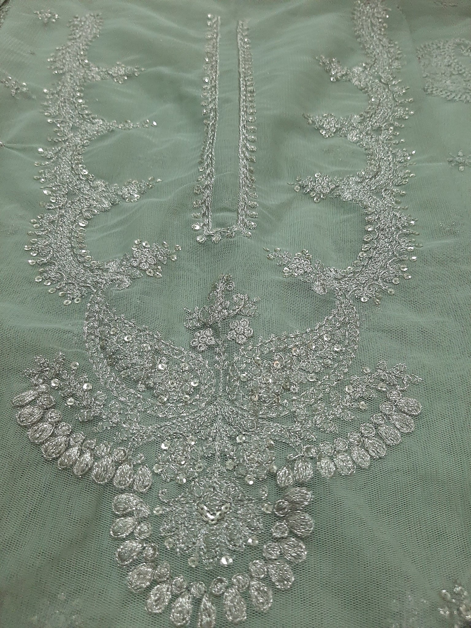 One silver tilla embroidered with light golden sequins embellishment Chester neckline length 17 width 26 inches.