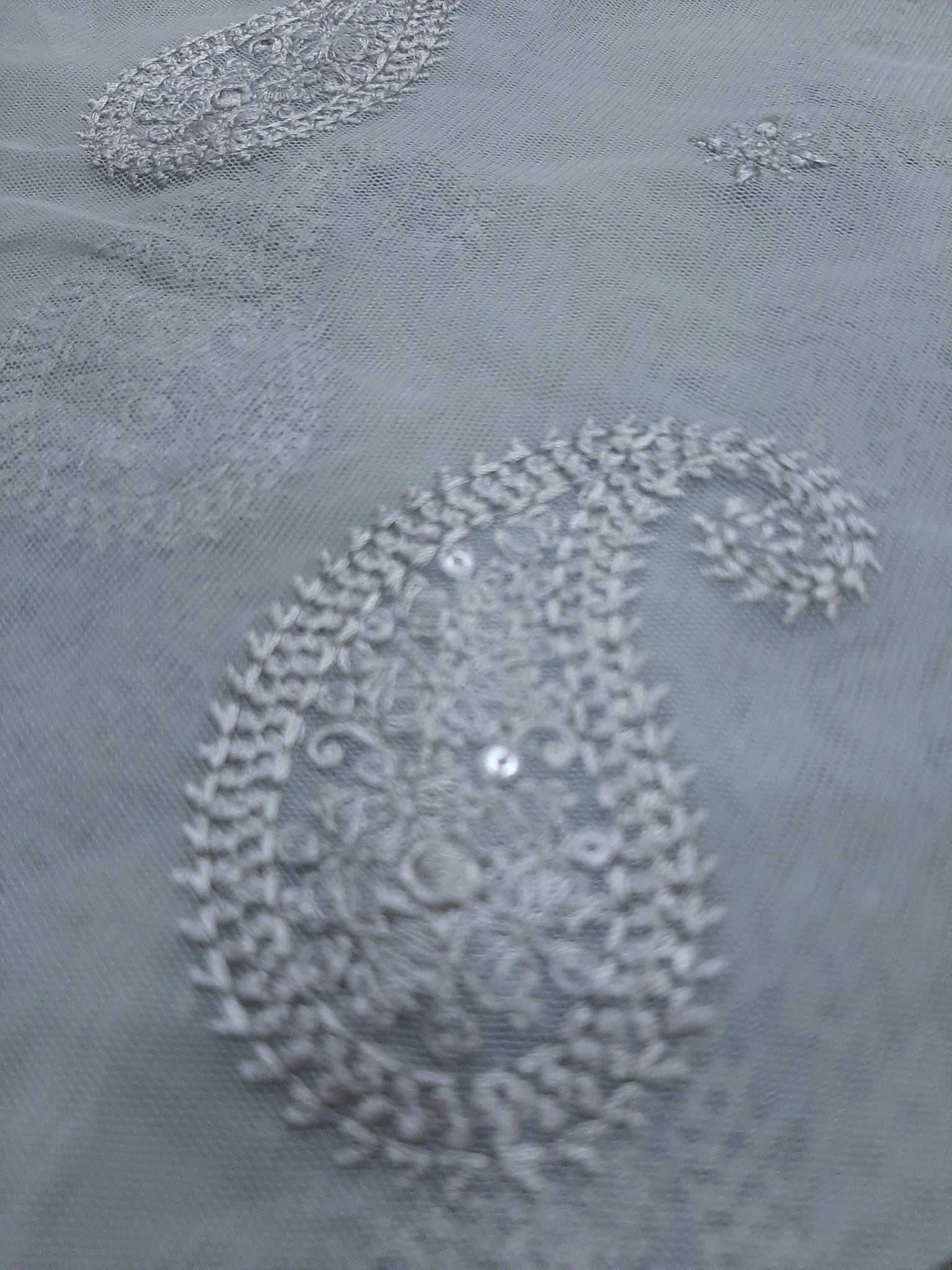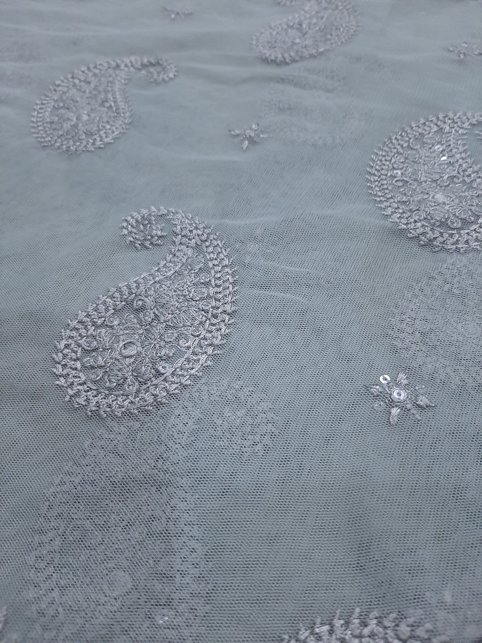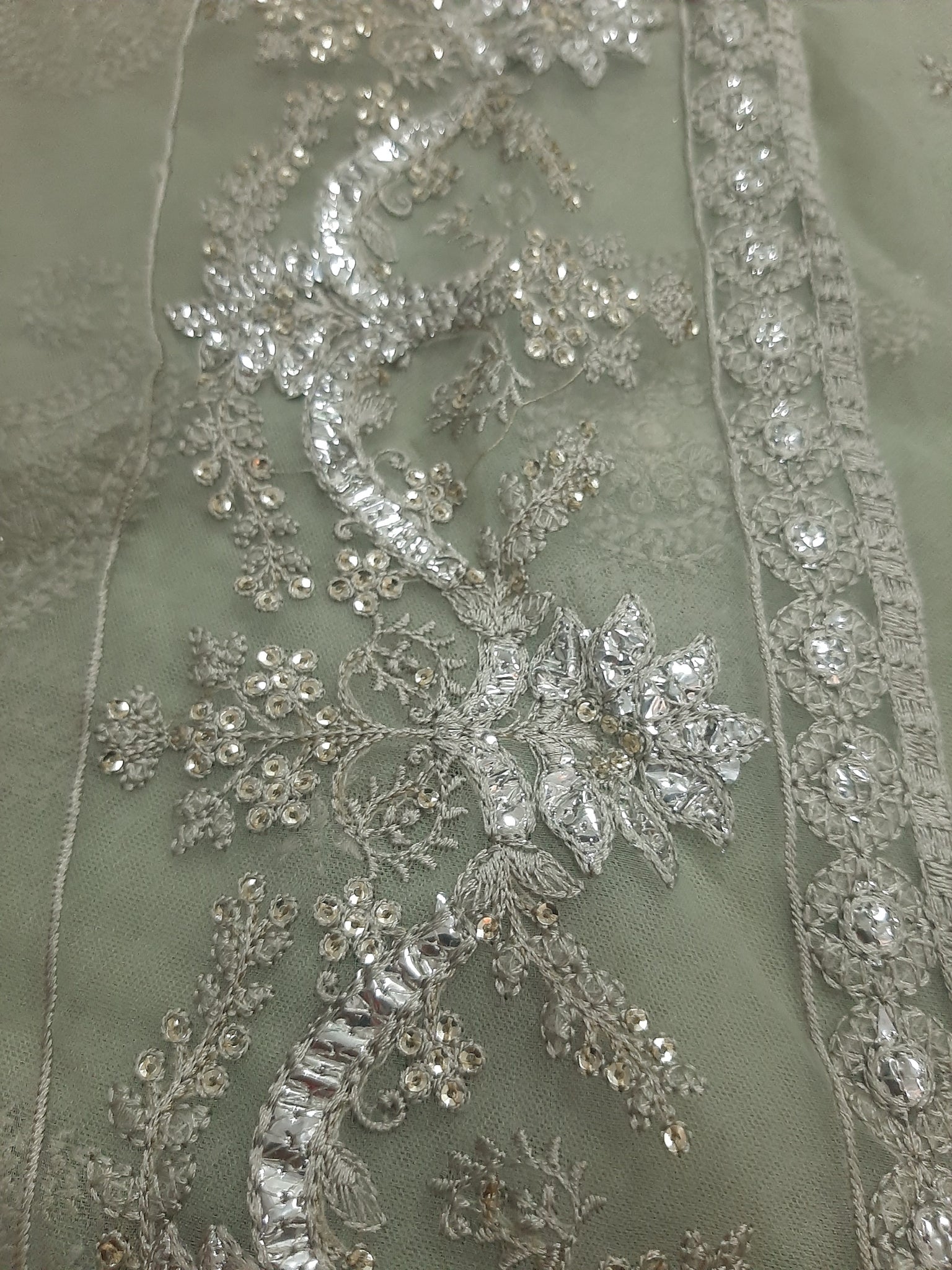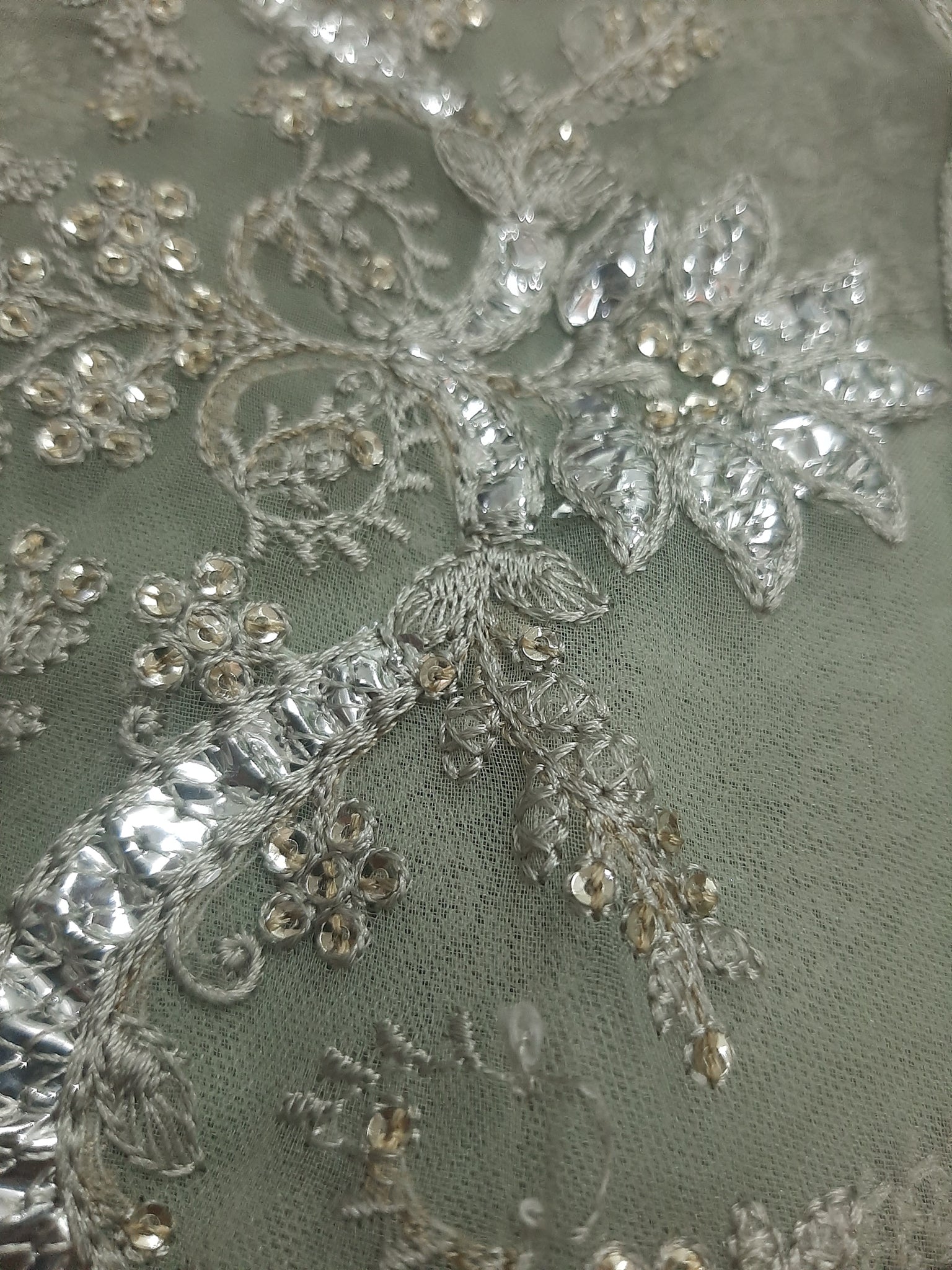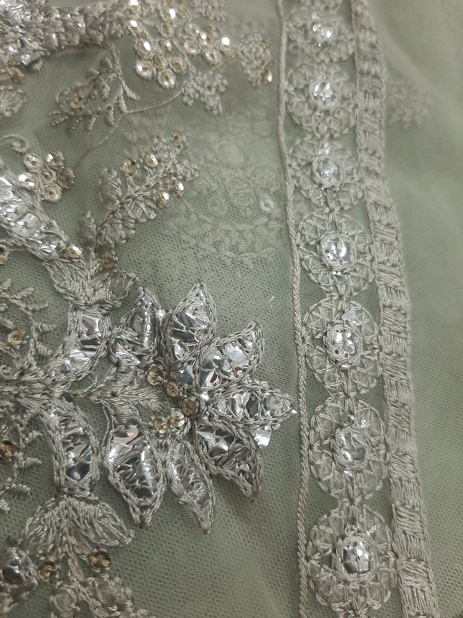 One silver tilla embroidered with light golden sequins embellishment Chester neckline length 17 width 26 inches.