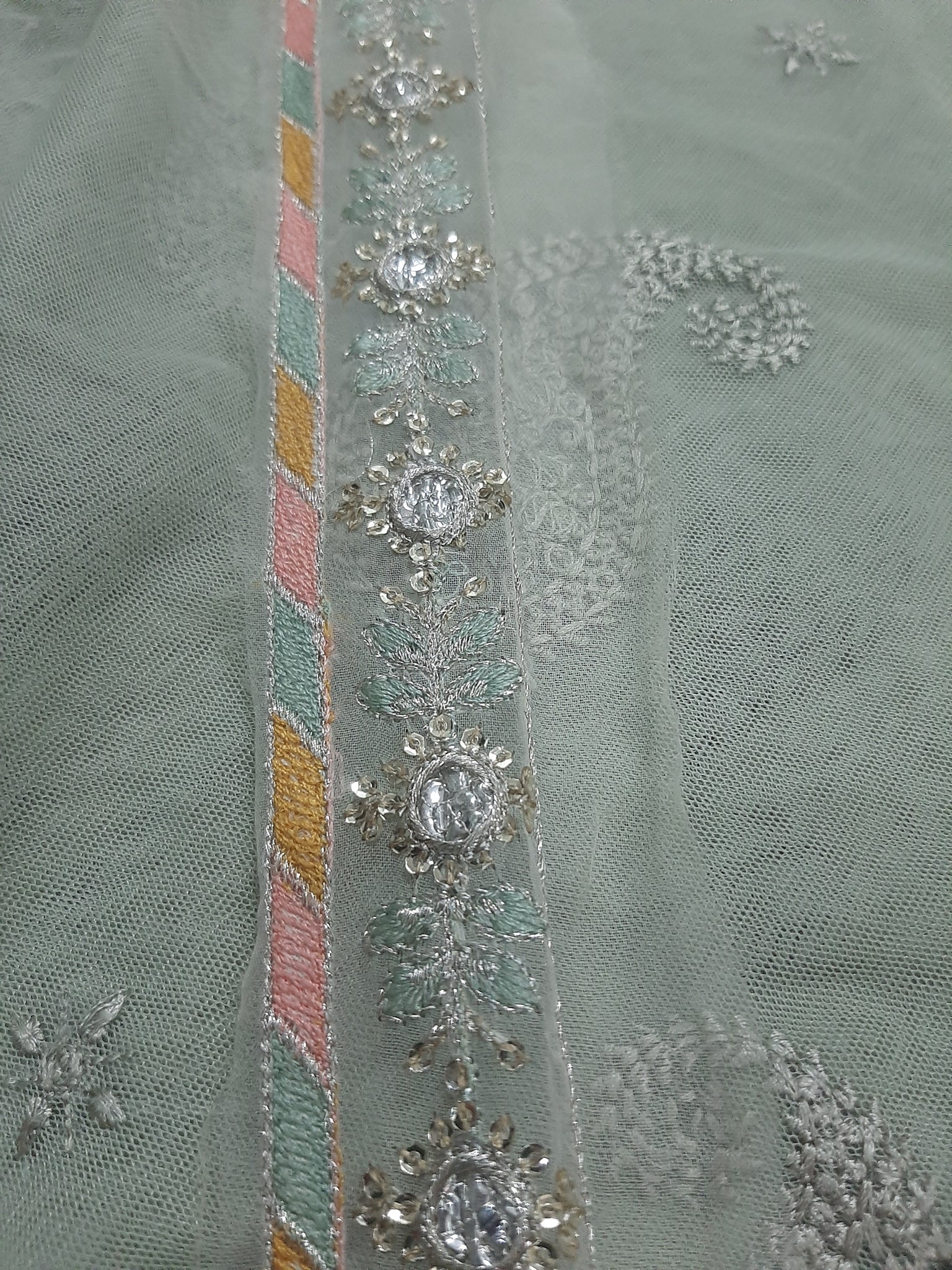 Duppta fabric in lurex (jacquard), Multi embroidered pallus, thin 2 patches for corners edges of duppta length almost 3.75 yards each.
