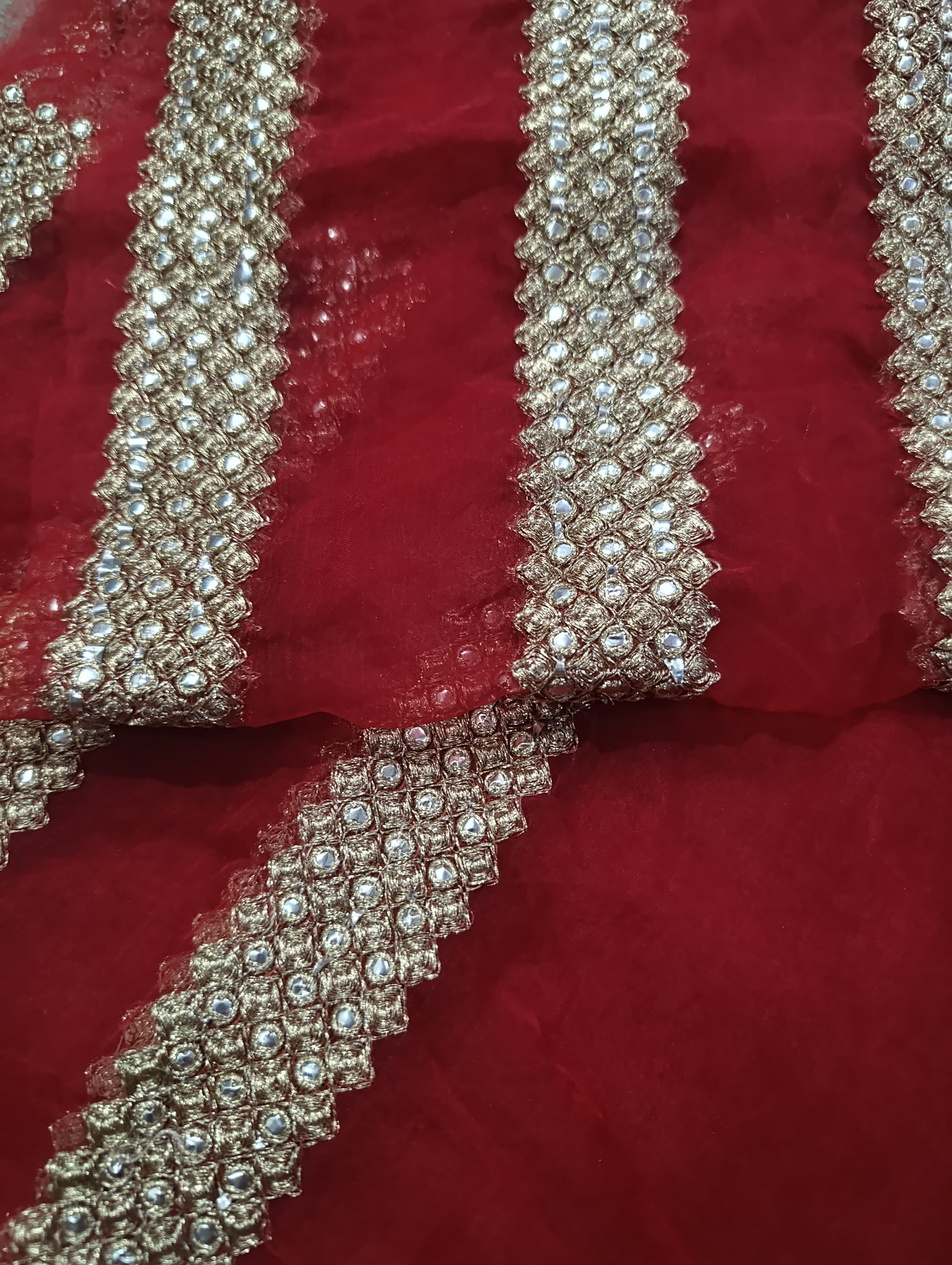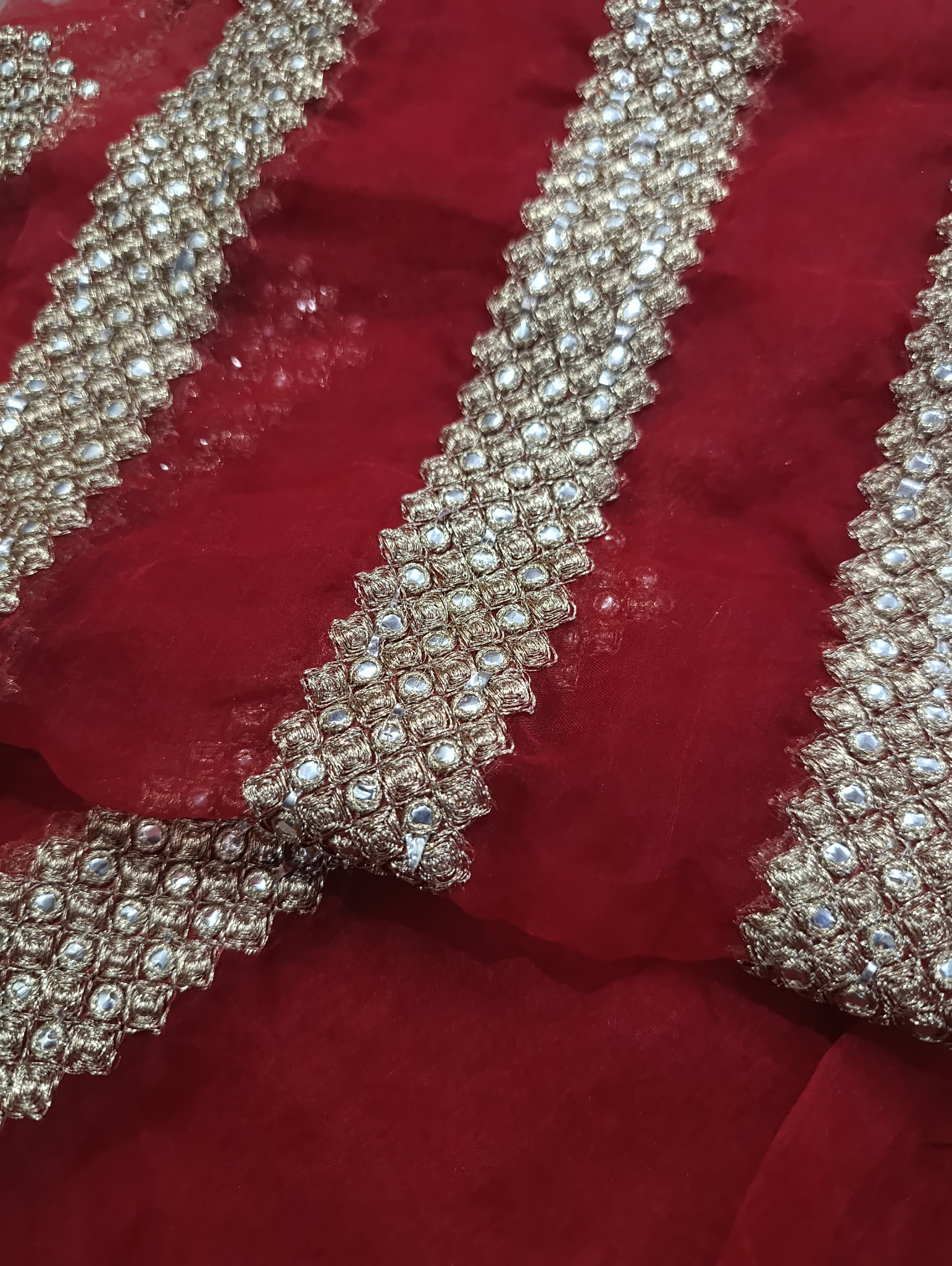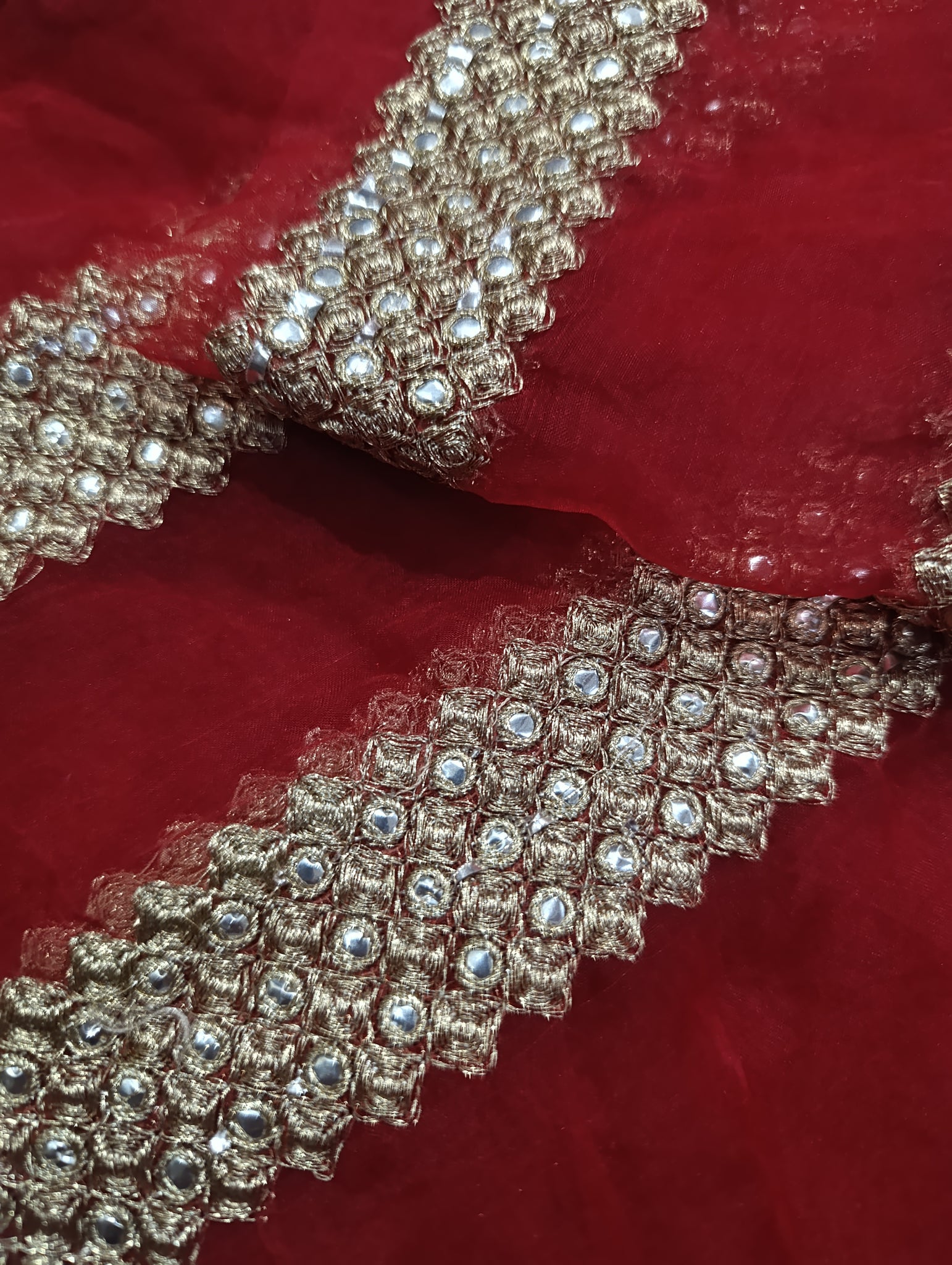 Fully thread embroidered with golden tilla and silver foil work.