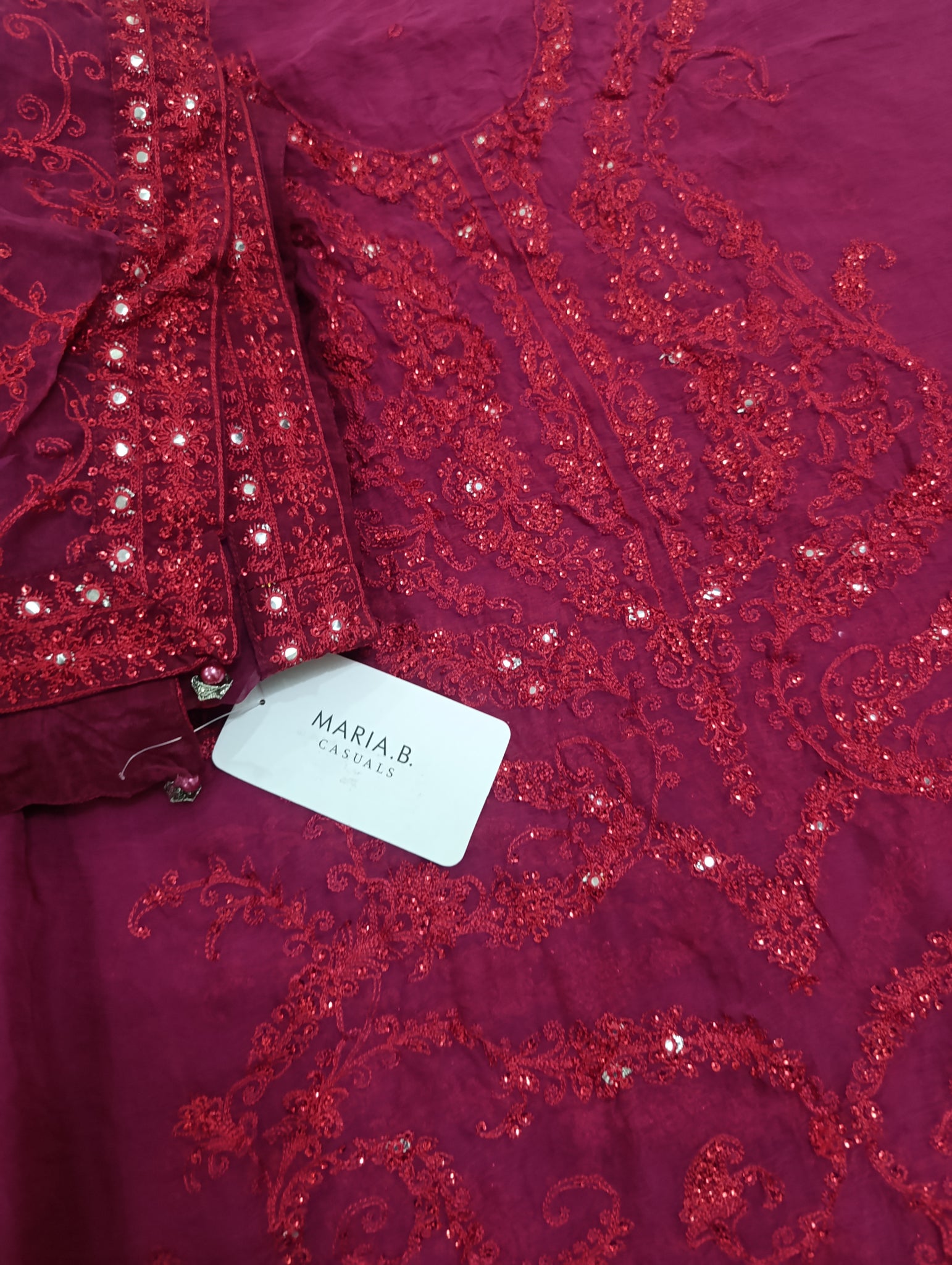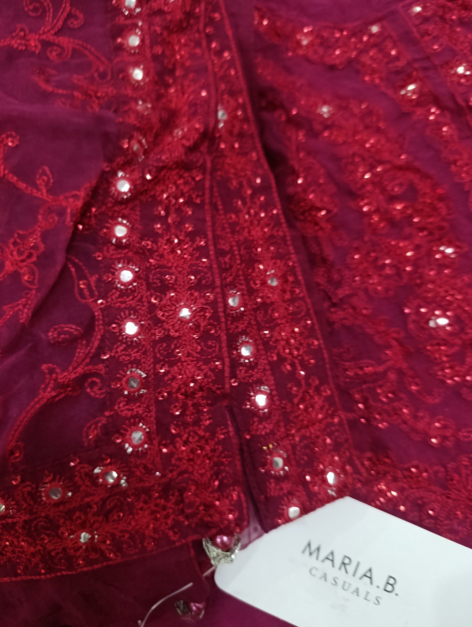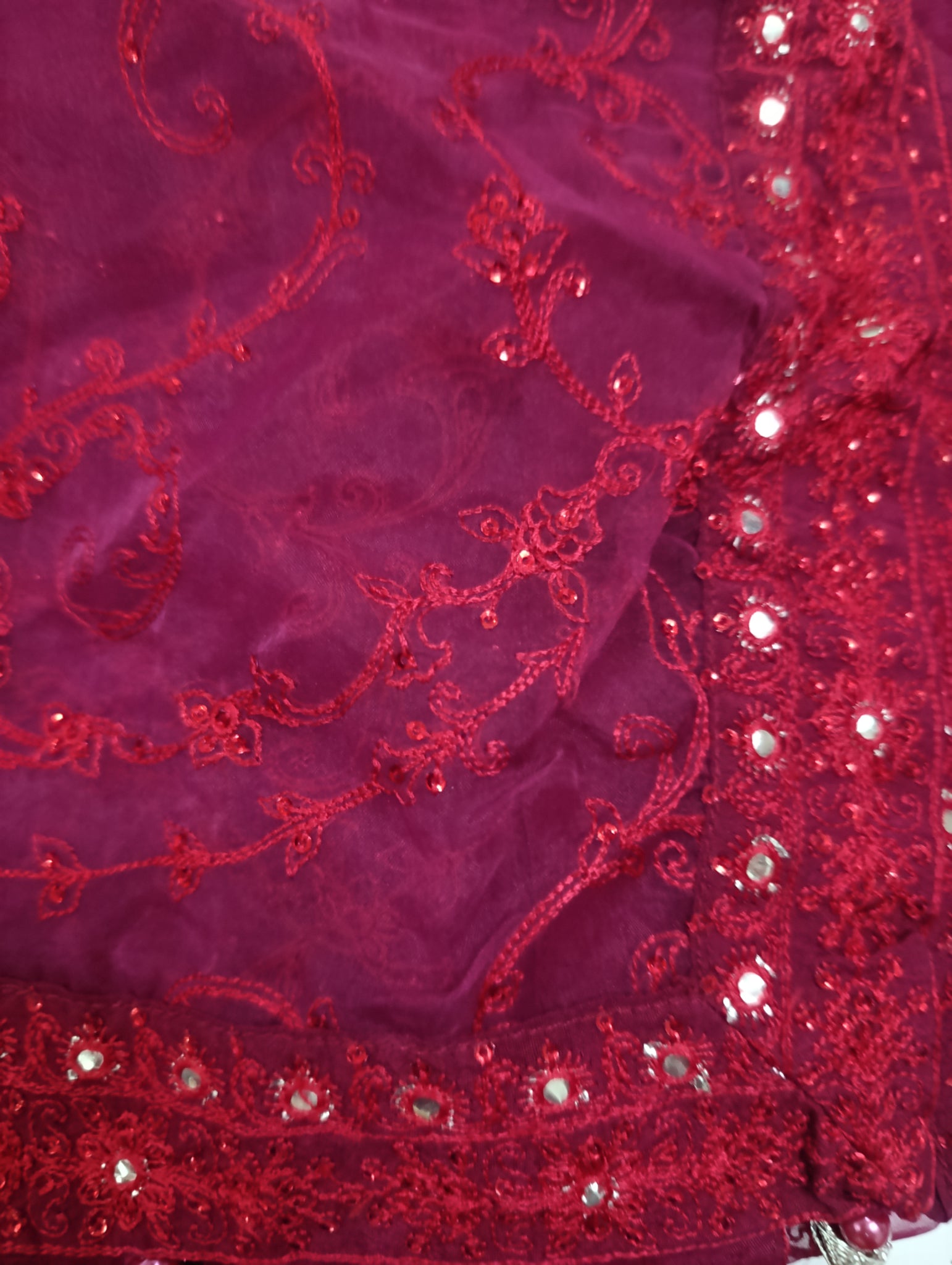 Aar (Adda work) style or chain stitch embroidered with red colour sequins embellishment on chiffon fabric.