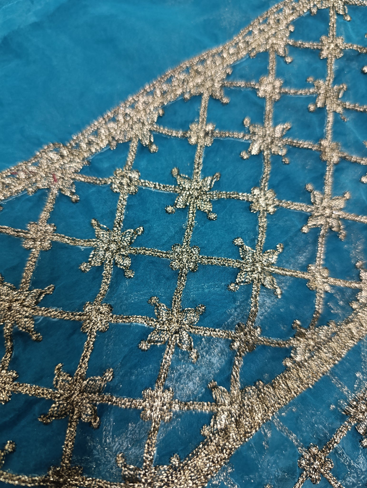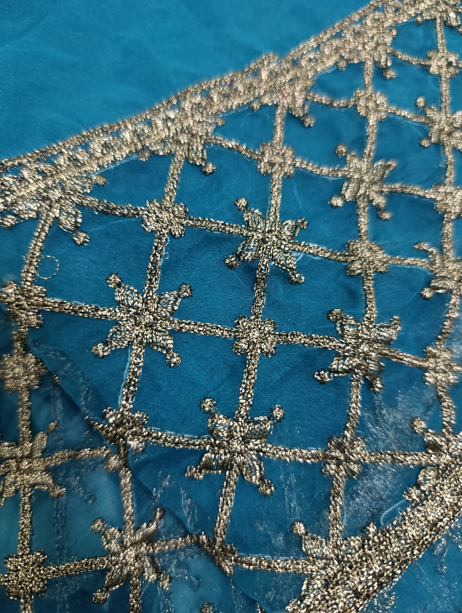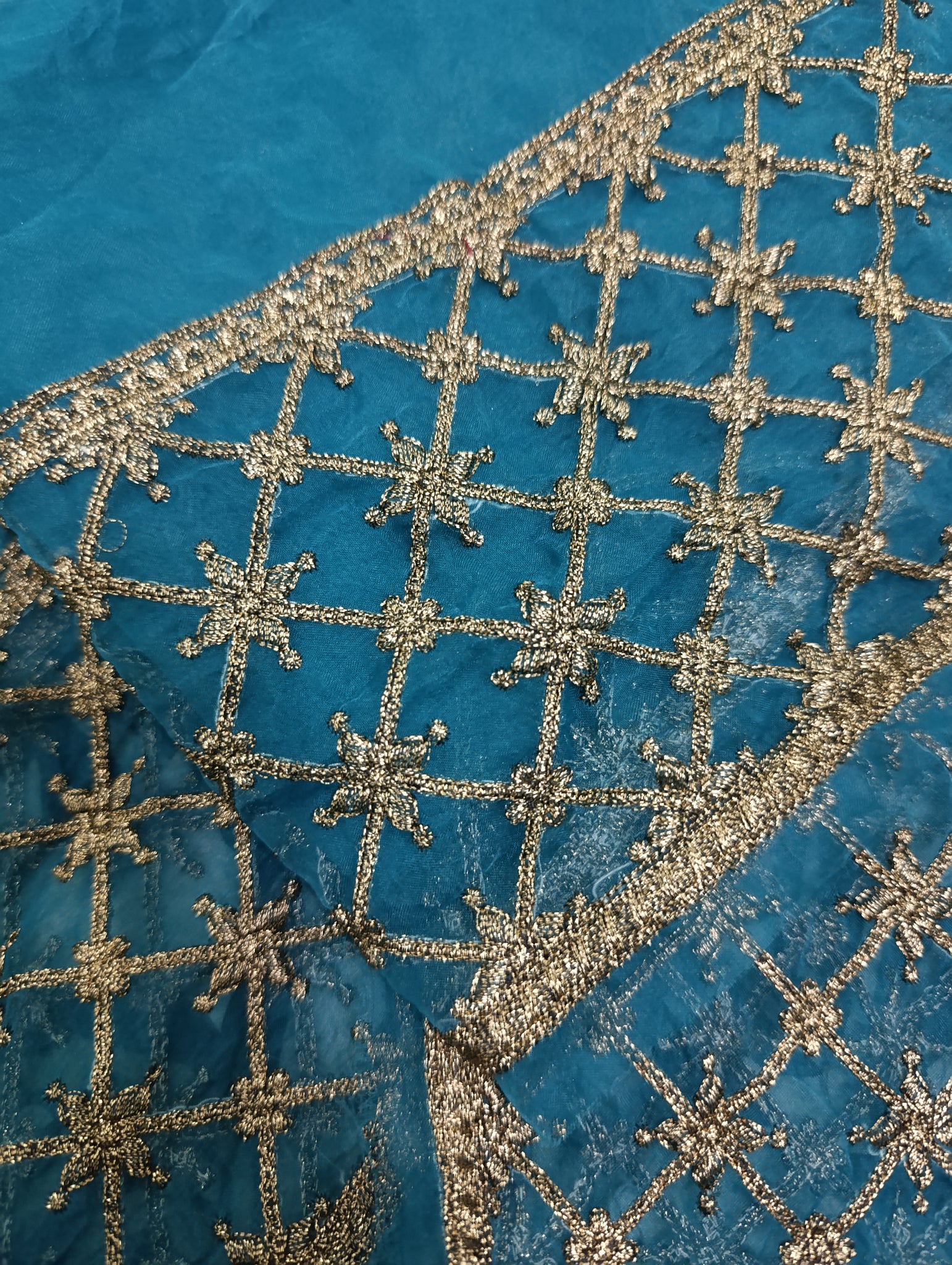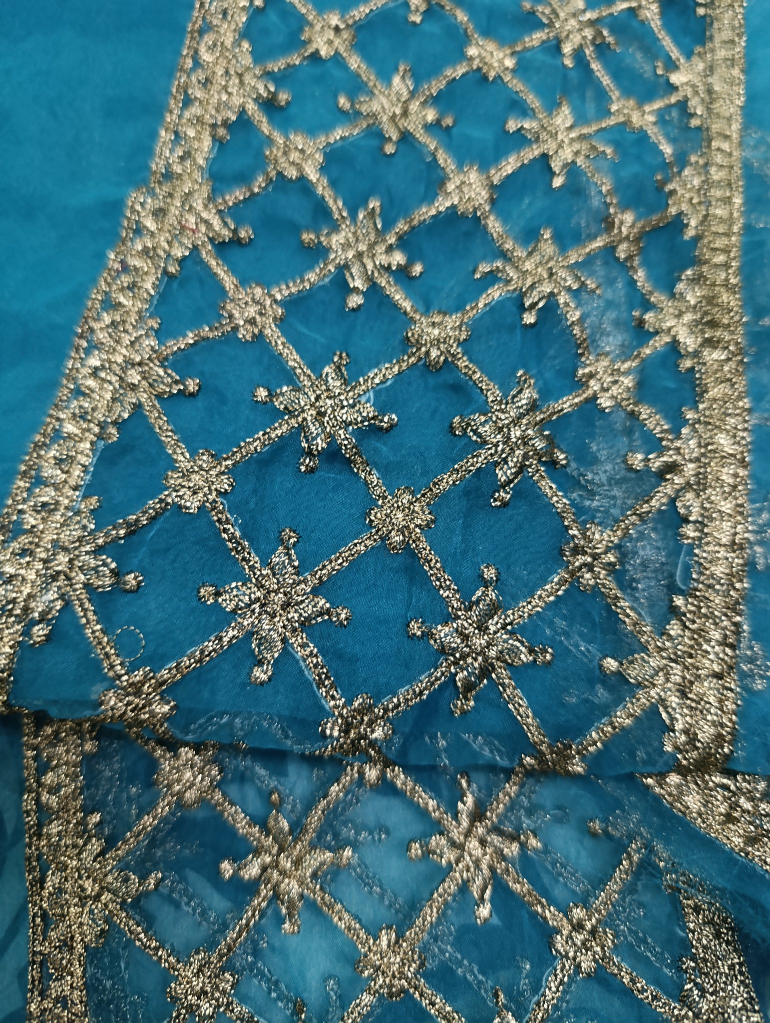 Fully copper gold tilla embroidered in checkered style.