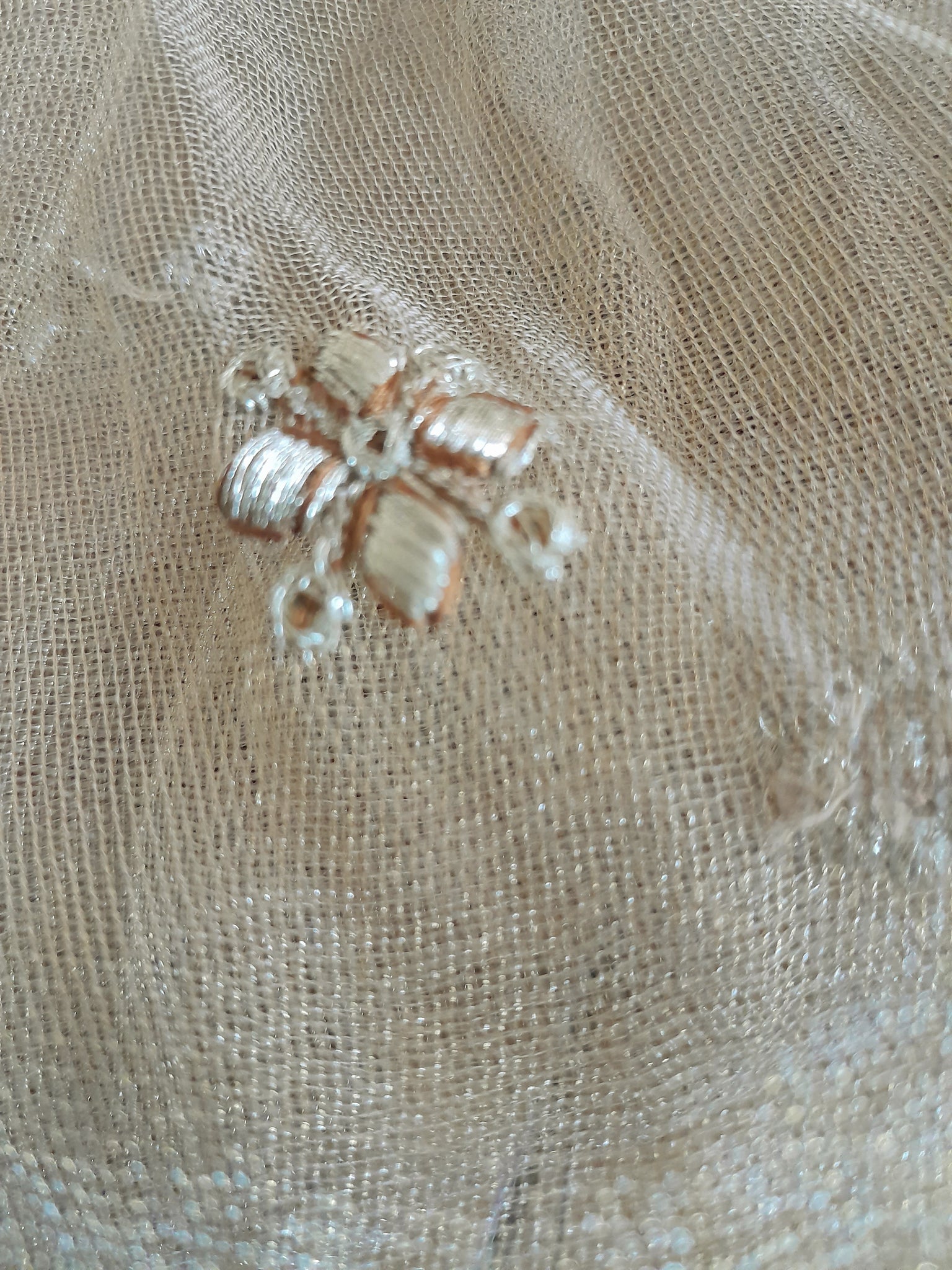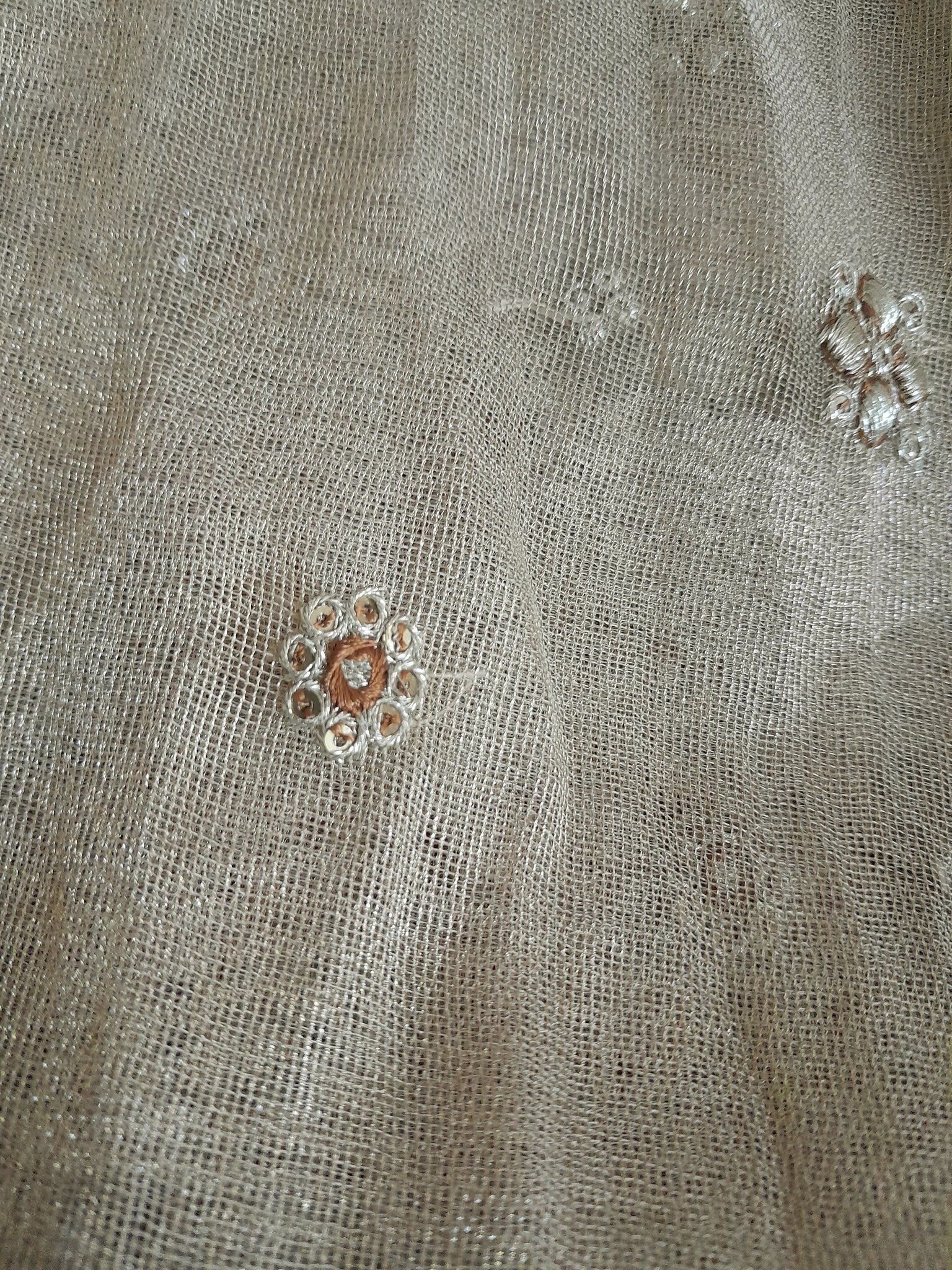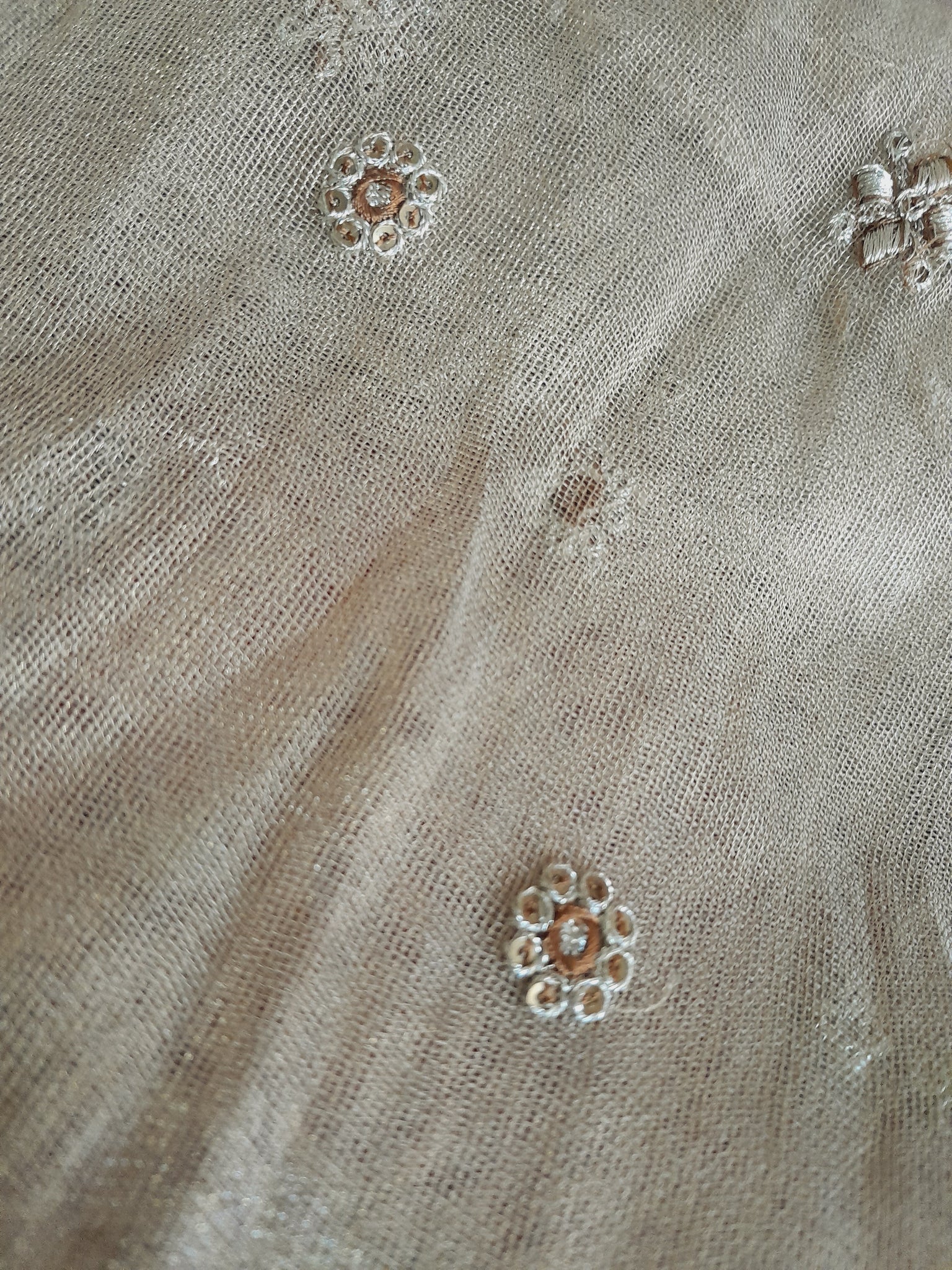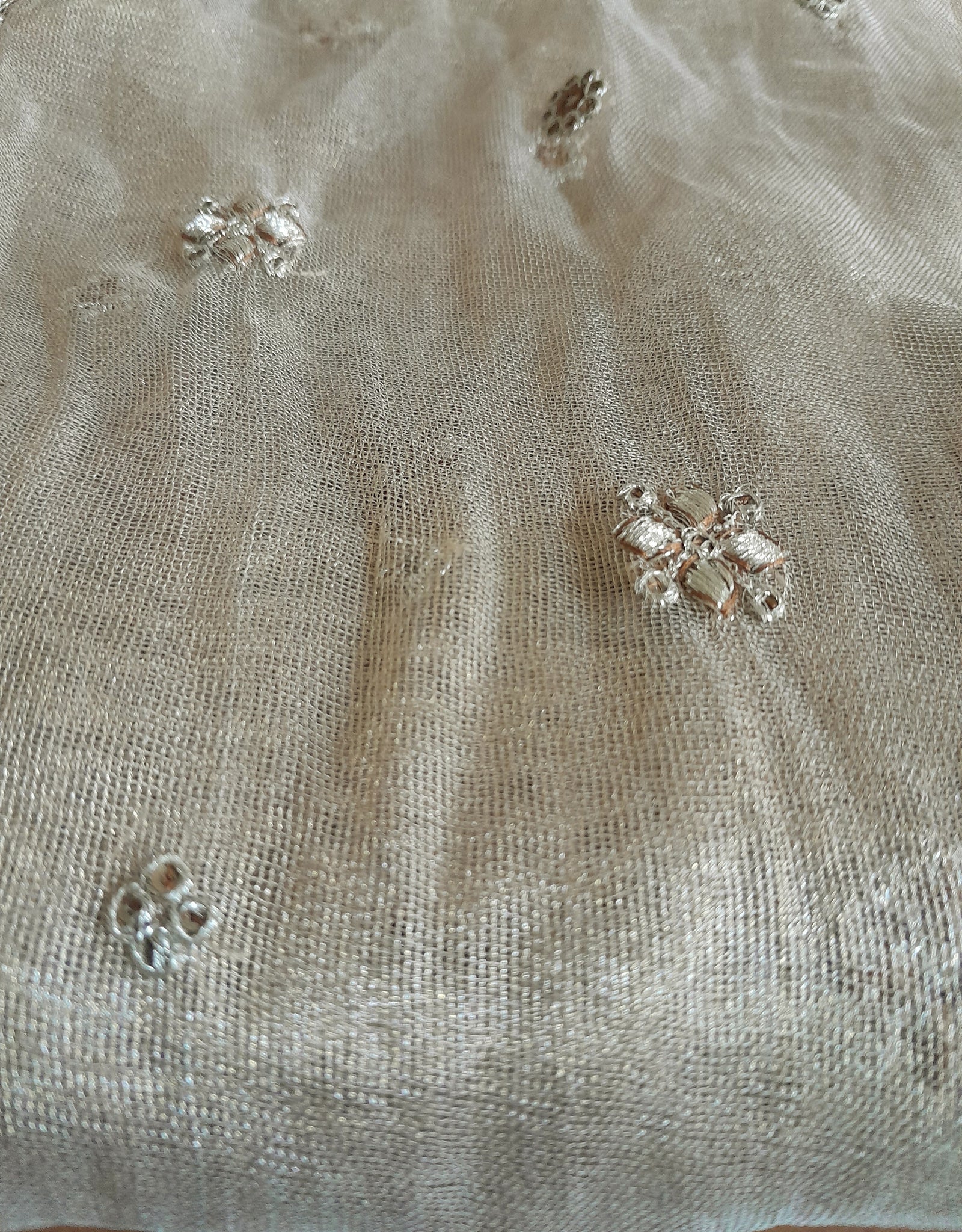 Fully embroidered in two design regular motives on shimmery/ zari cotton net fabric.