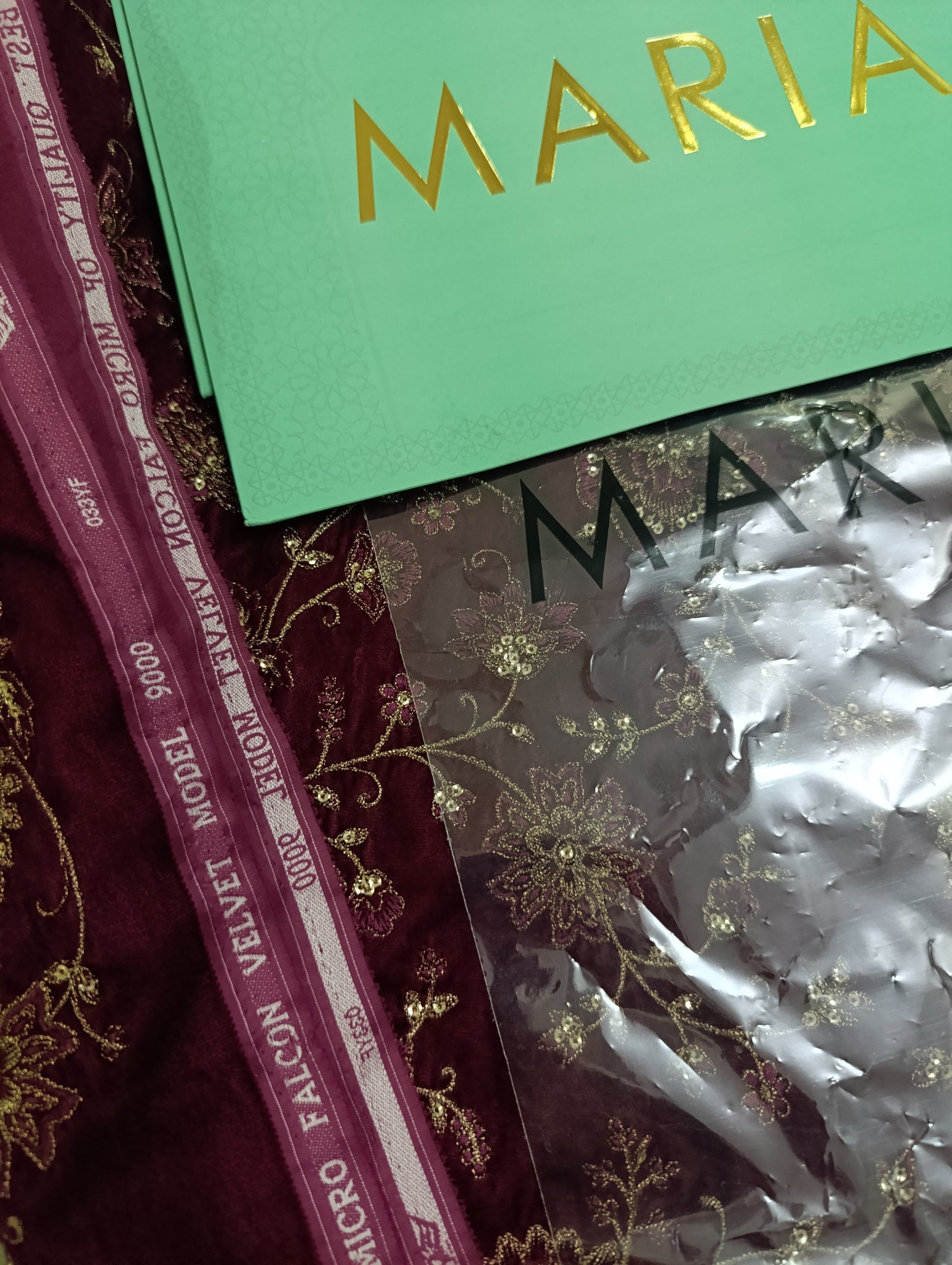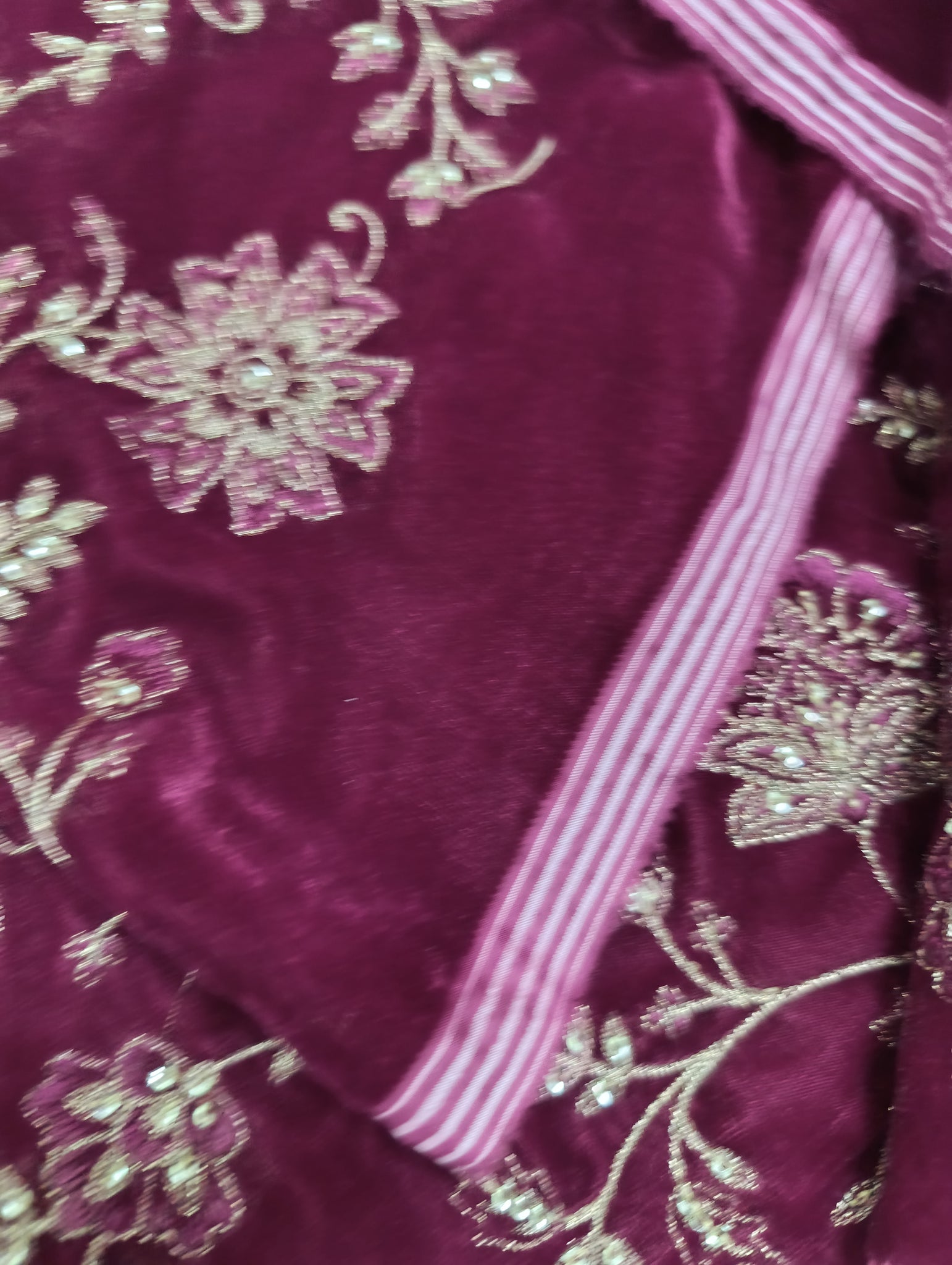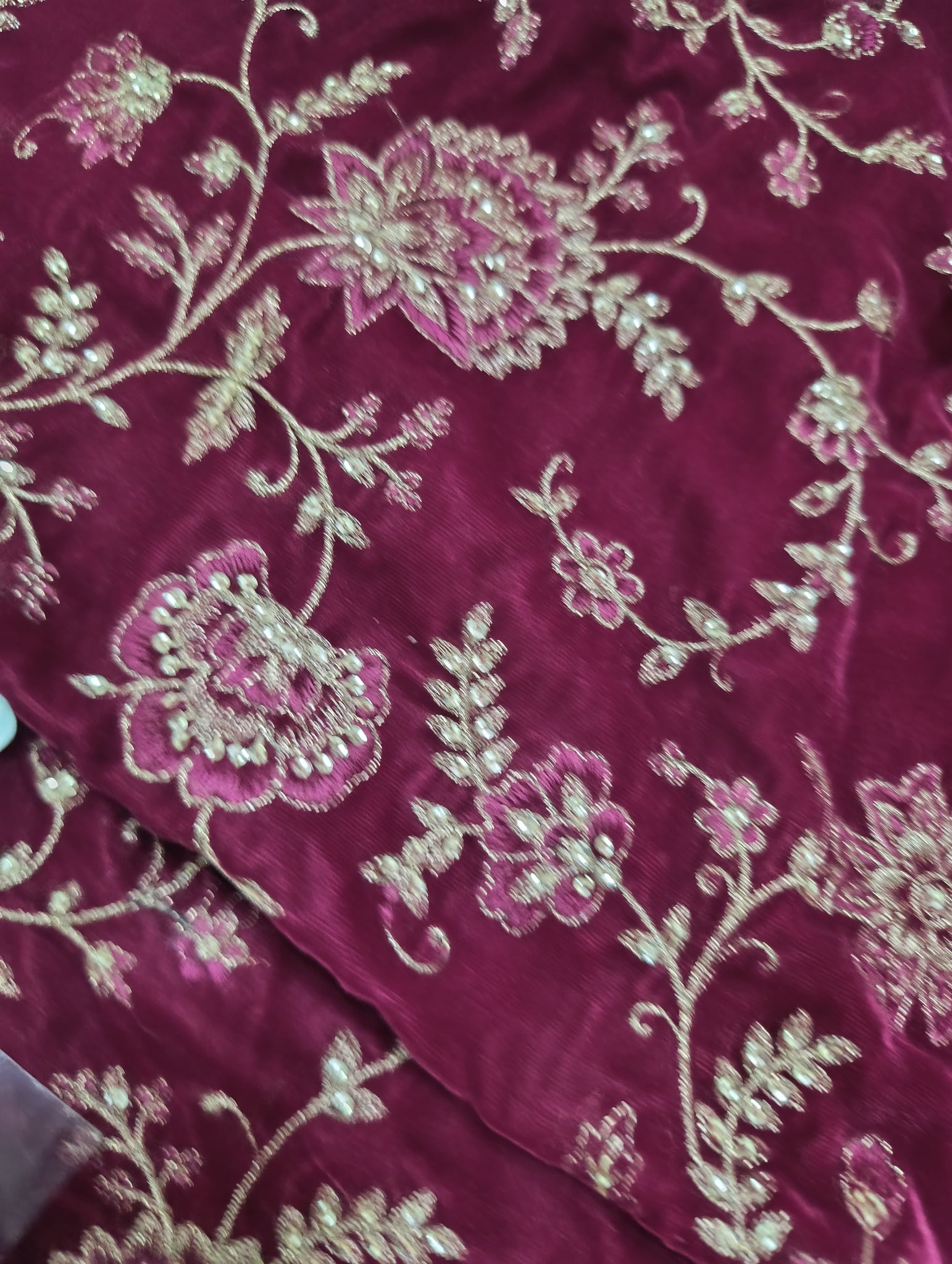 Wine Red Velvet Fabric Embroidered with Tilla and Sequins.