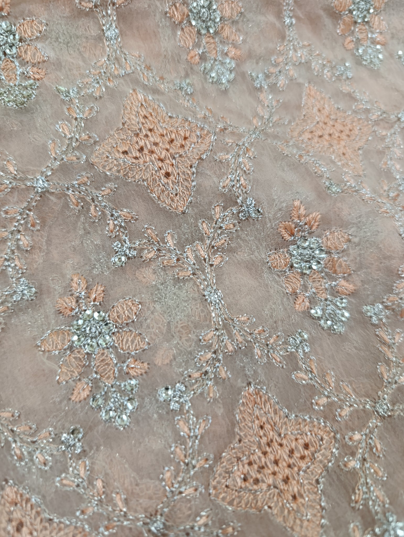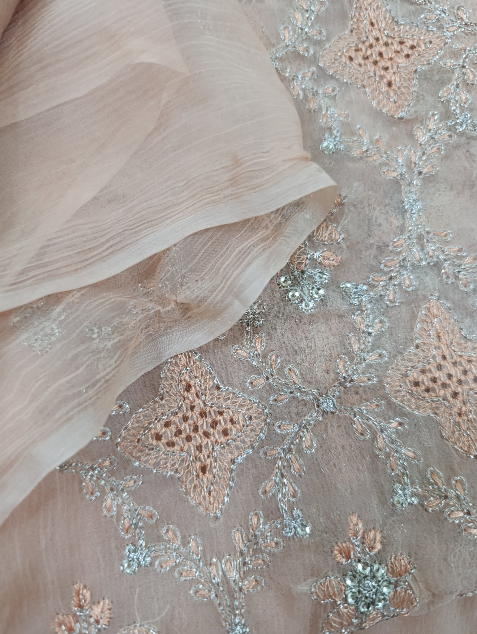 Heavily thread and lightest golden tilla embroidered with lightest golden sequins embellishments like silver in overall Jall style with chicken kari styles regular motives.
