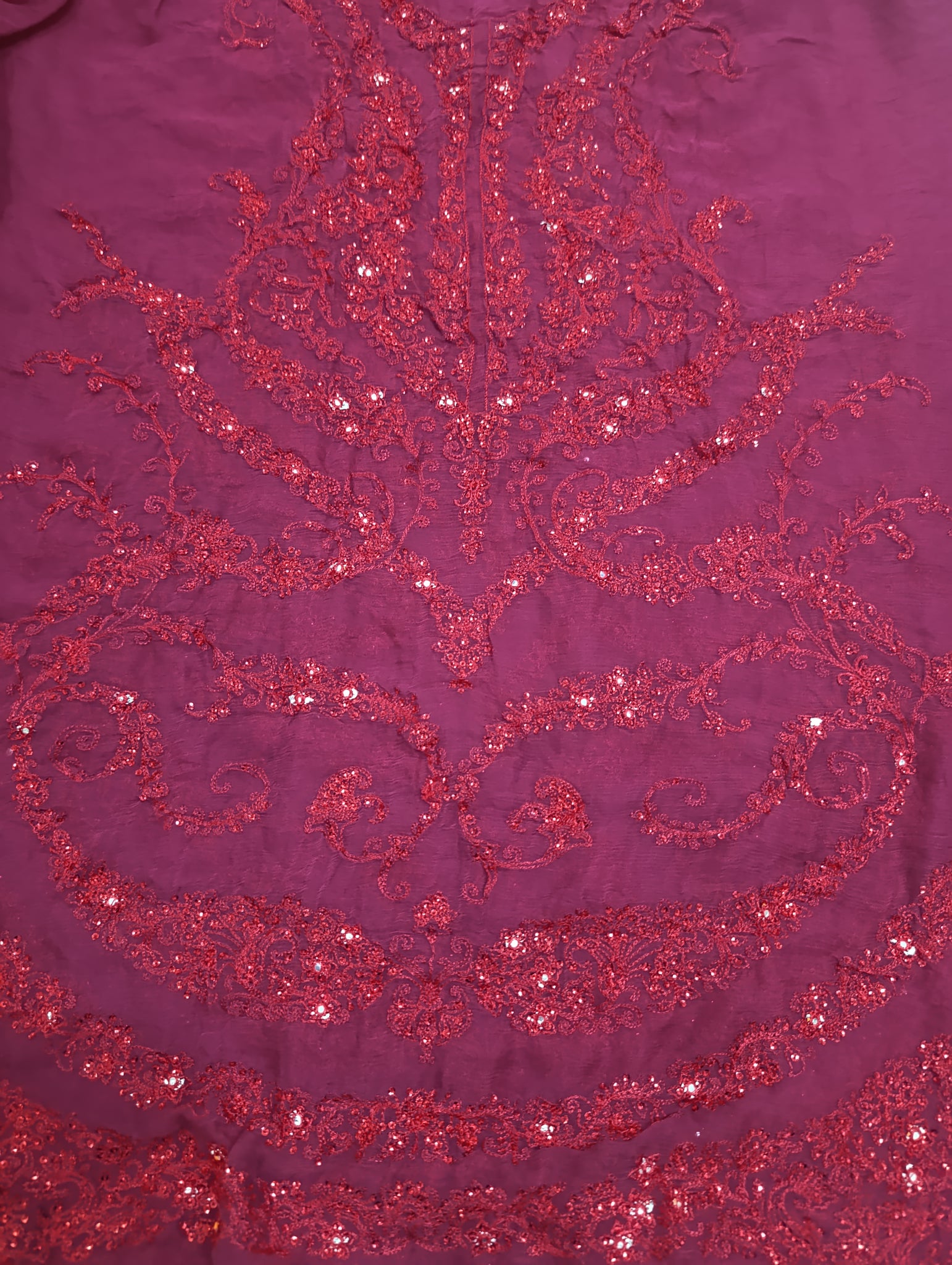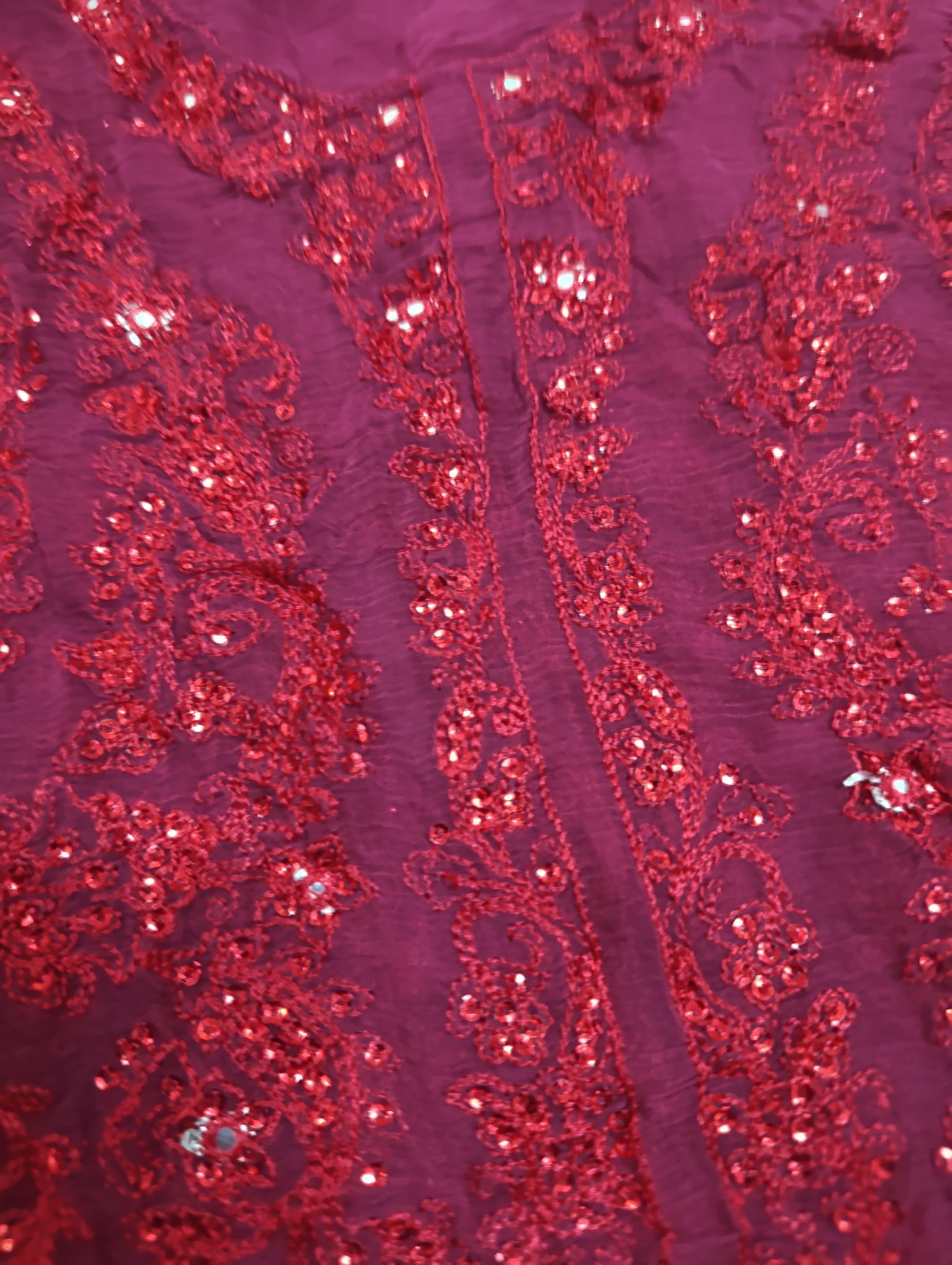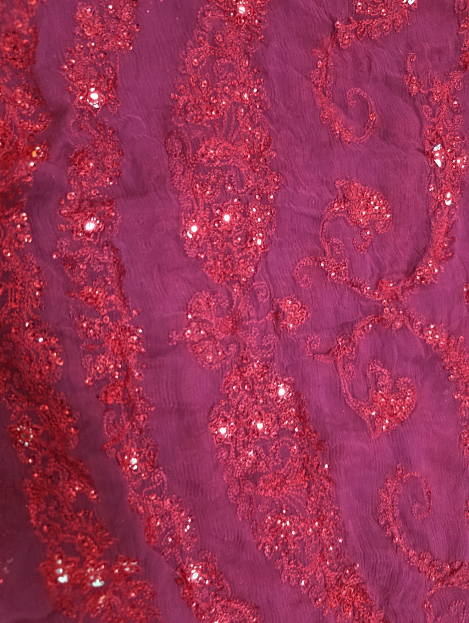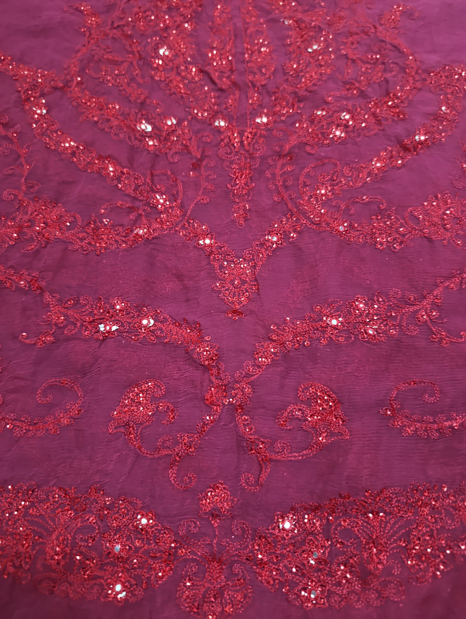 Aar (Adda work) style or chain stitch embroidered with red colour sequins embellishment on chiffon fabric.