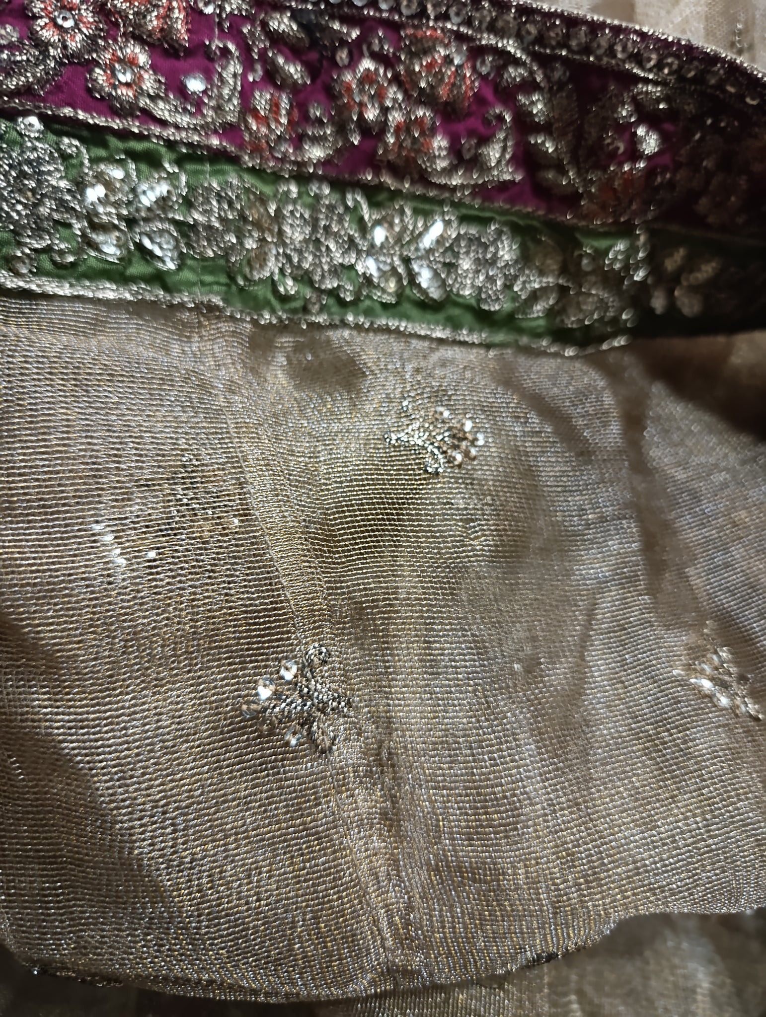 Copper gold tilla embroidered with golden sequins embellishment in two designs patch in contrast colour fabric on embroidered zari net fabric regular motives style.