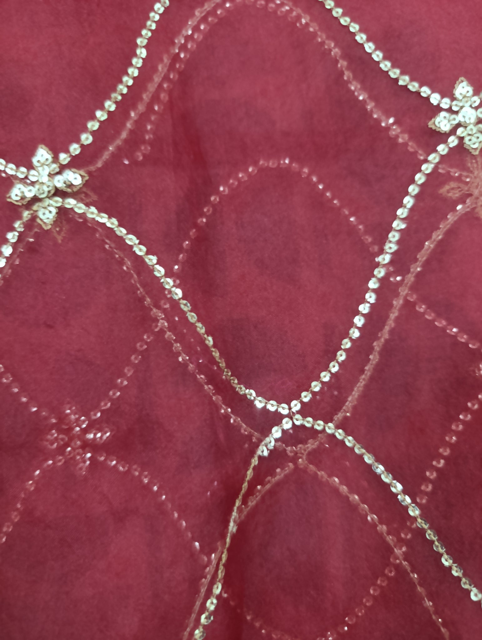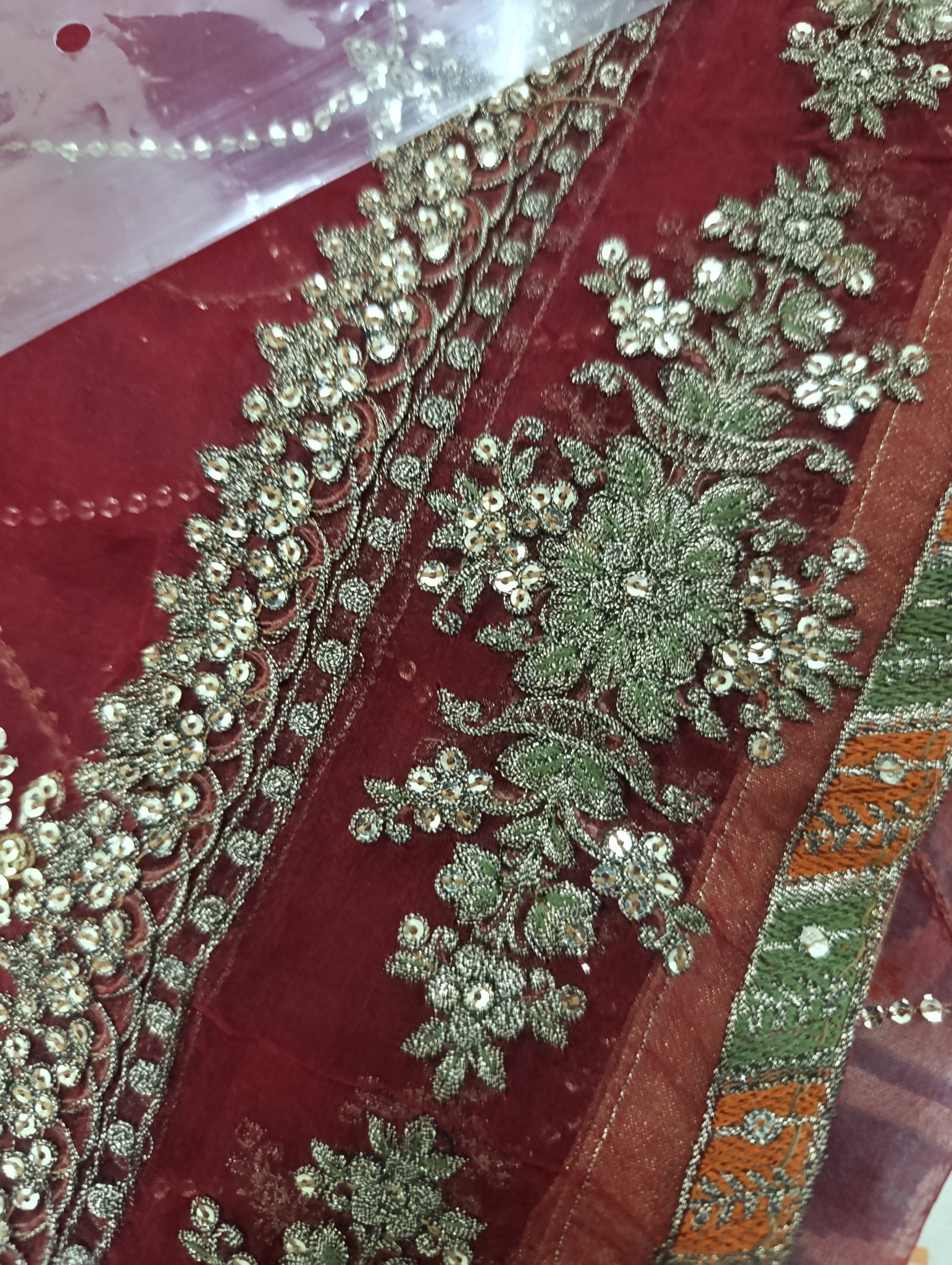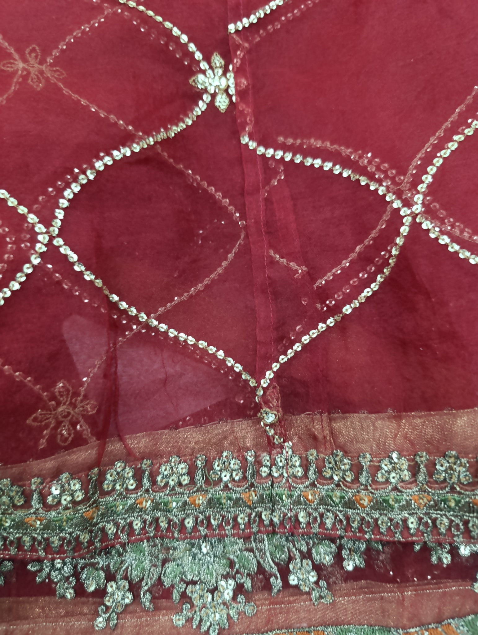 Thin & broad patch on four sides of dupatta with thread and copper gold tilla & golden sequins embellishment in chatta Patti style.