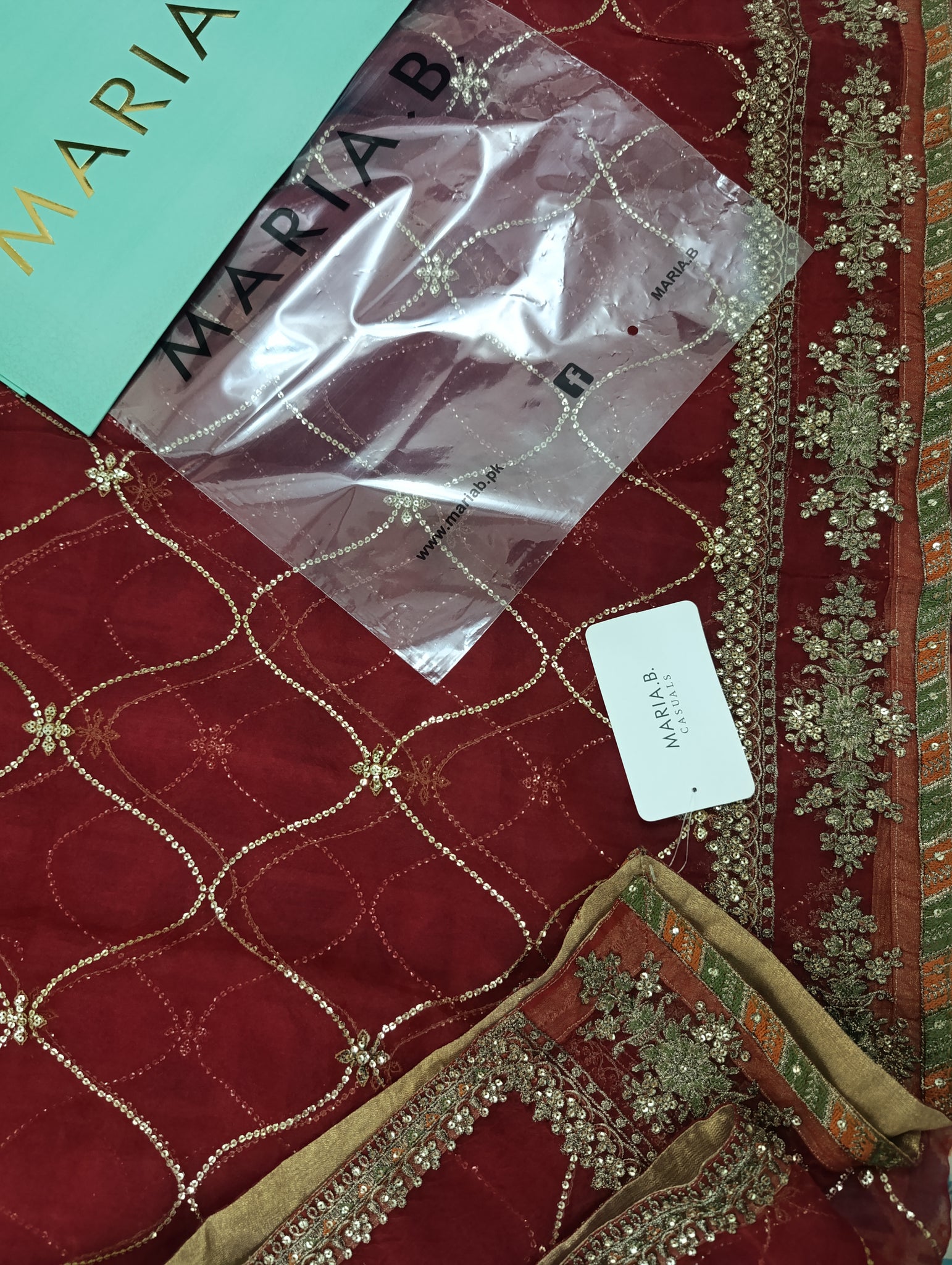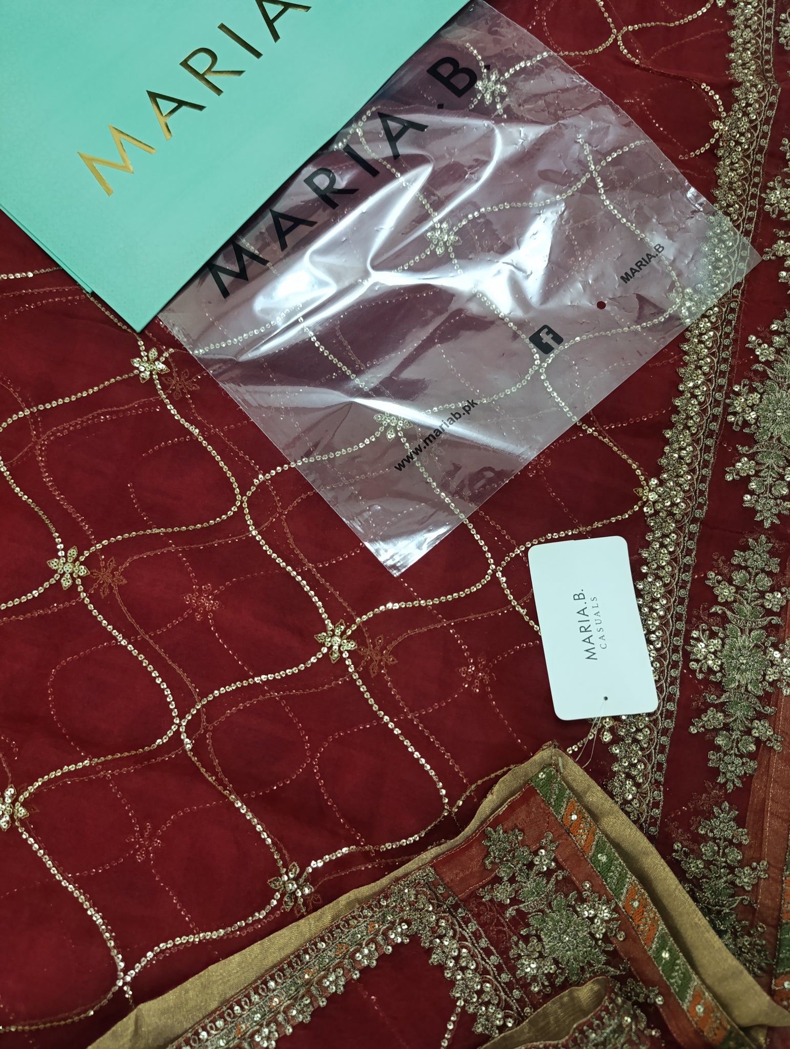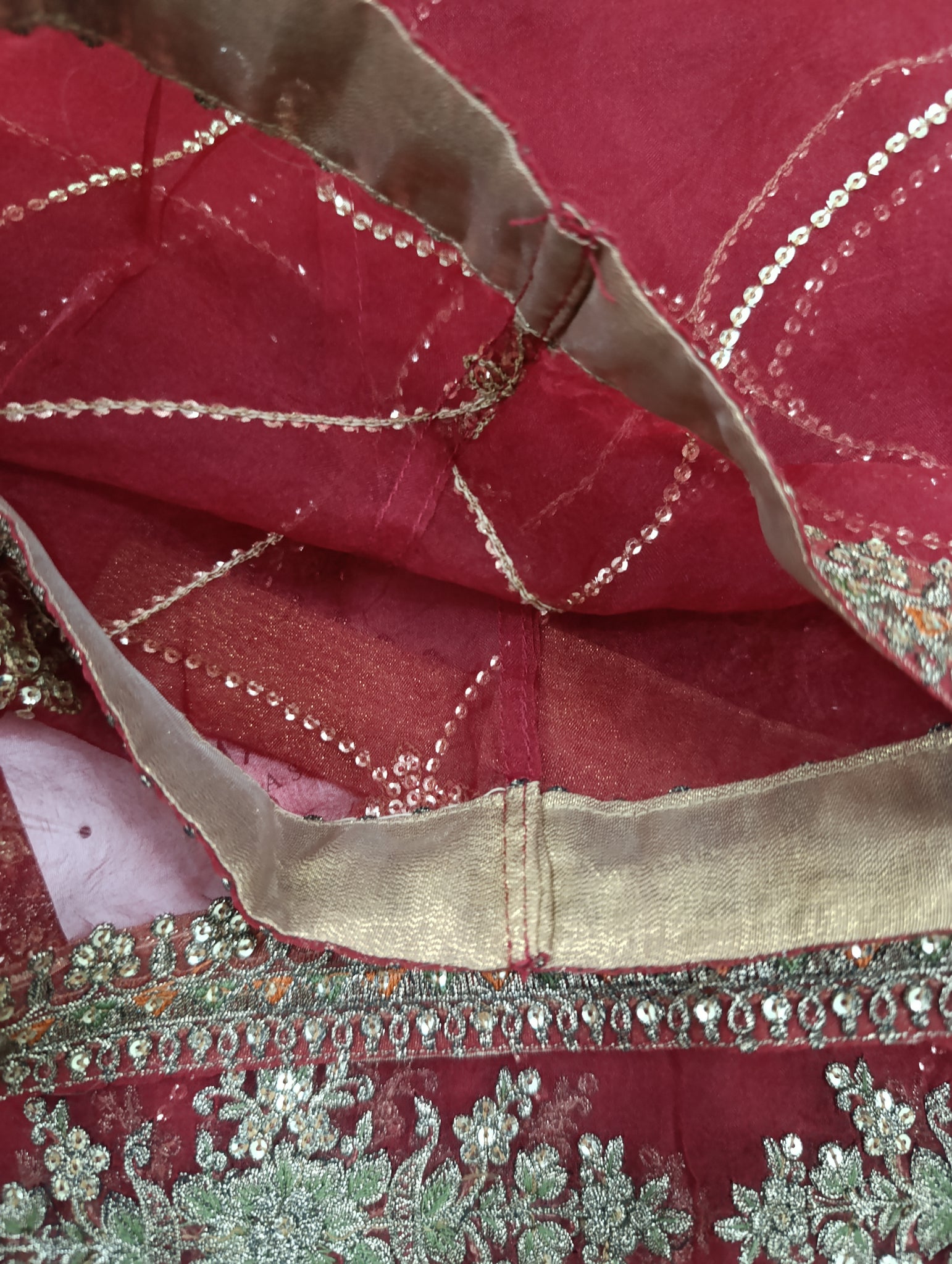 Thin & broad patch on four sides of dupatta with thread and copper gold tilla & golden sequins embellishment in chatta Patti style.