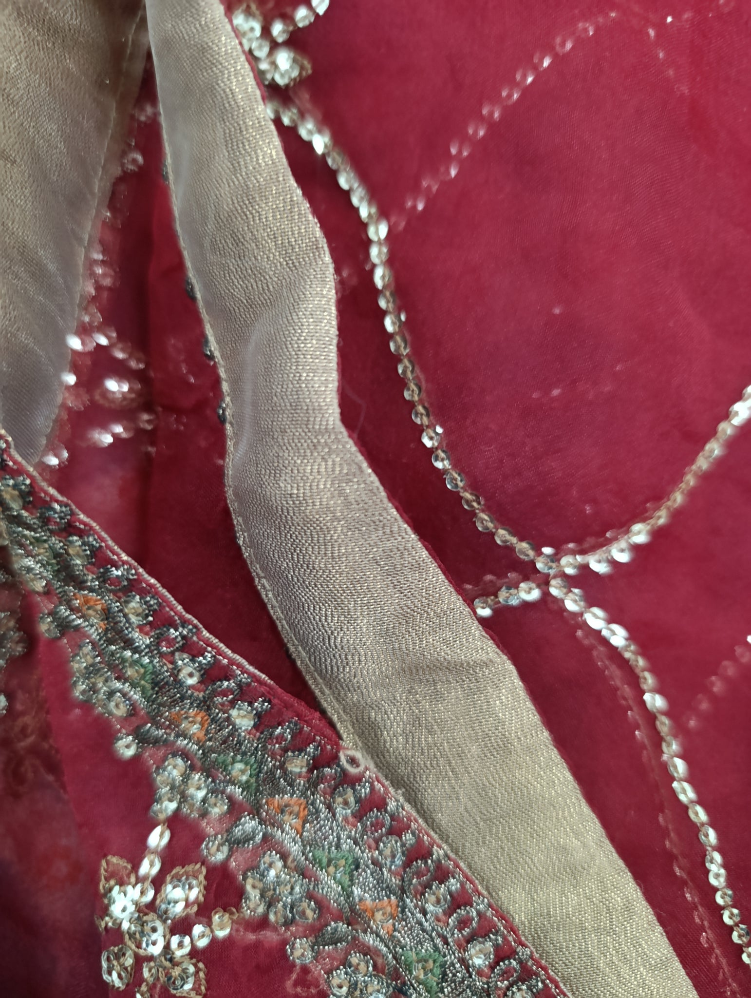 Heavily thread and copper gold tilla embroidered with golden sequins embellishments. Four sided velvet patch finished/stitched with tissue masori fabric and regular jaal & motives design with sequins embedded with thread.
