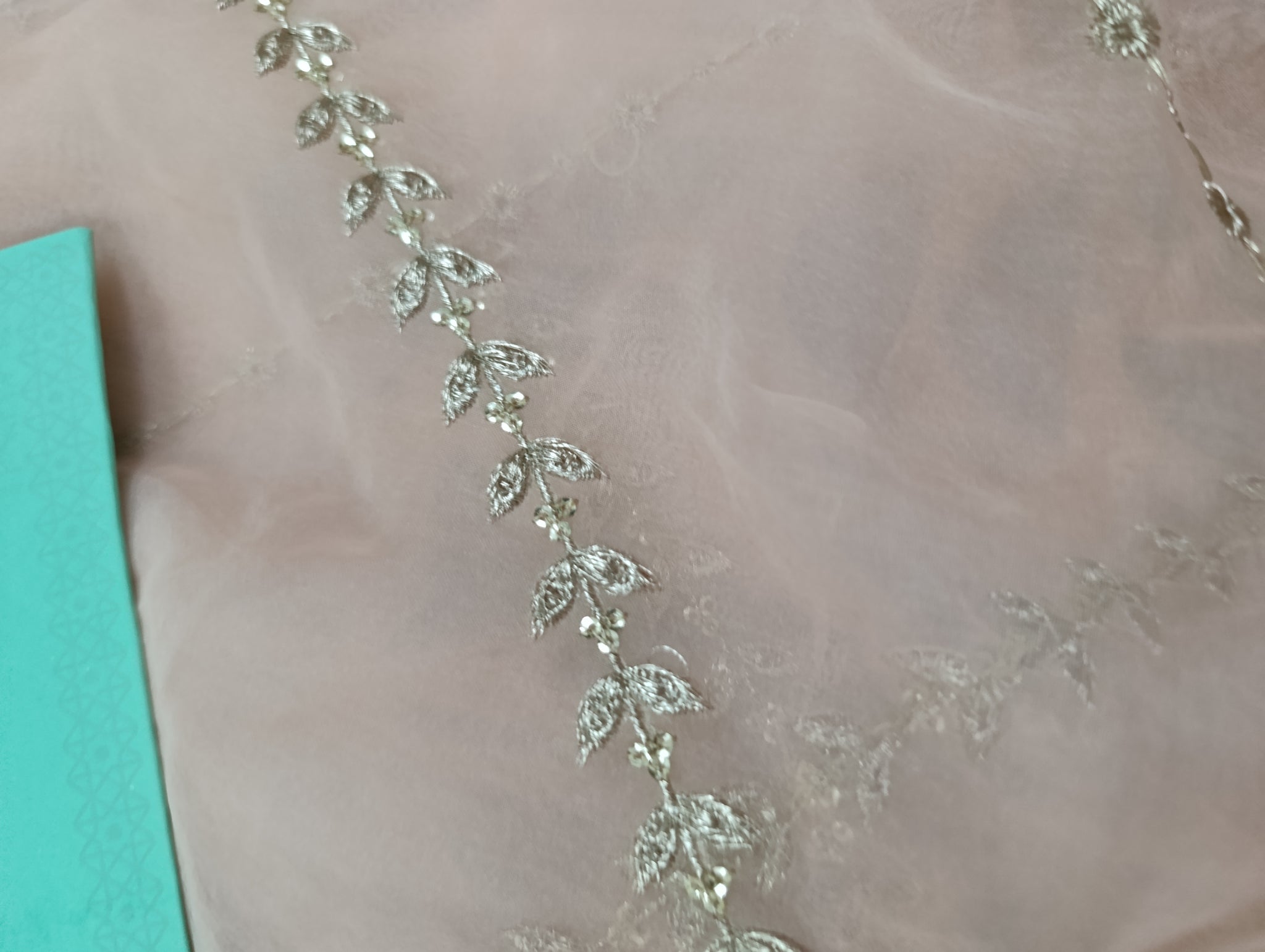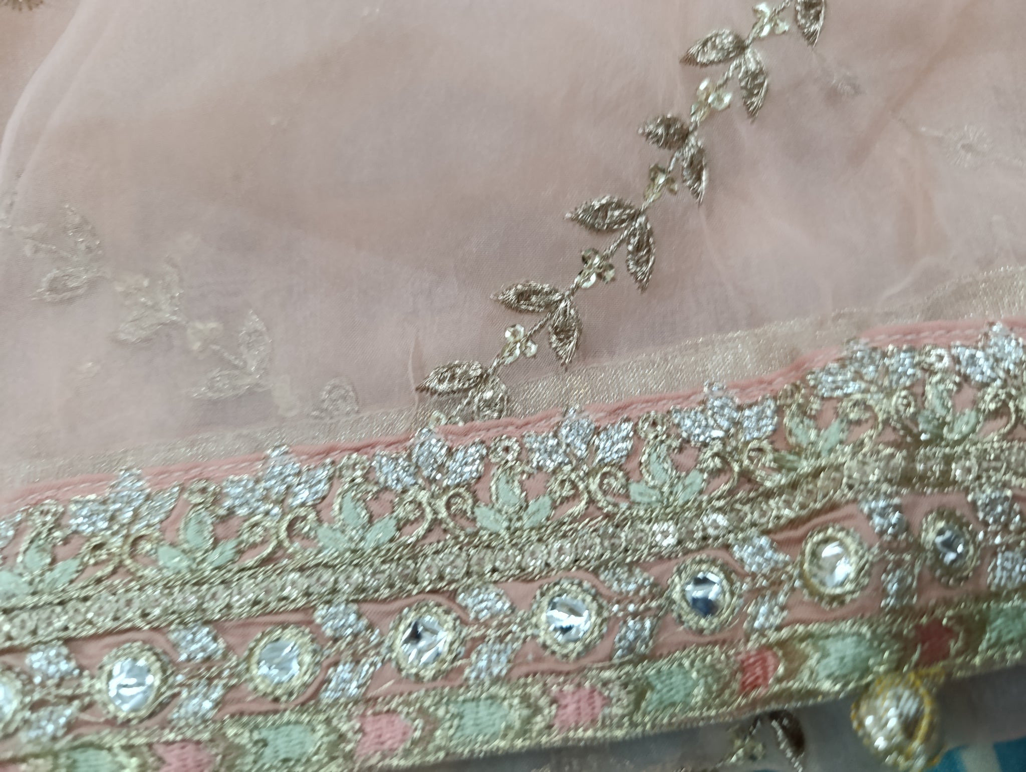 Heavily thread and golden with silver tilla embroidered, glitery golden sequins and foil work embellishments patch is stitched on four sides of the duppta corners edges. Center part of the duppta is fully golden tilla embroidered with golden sequins embellishments in diagonal lines designing. Gotta tussels are hanged on the pallu of the duppta and back side is stitched/finished with golden masori for neat look.