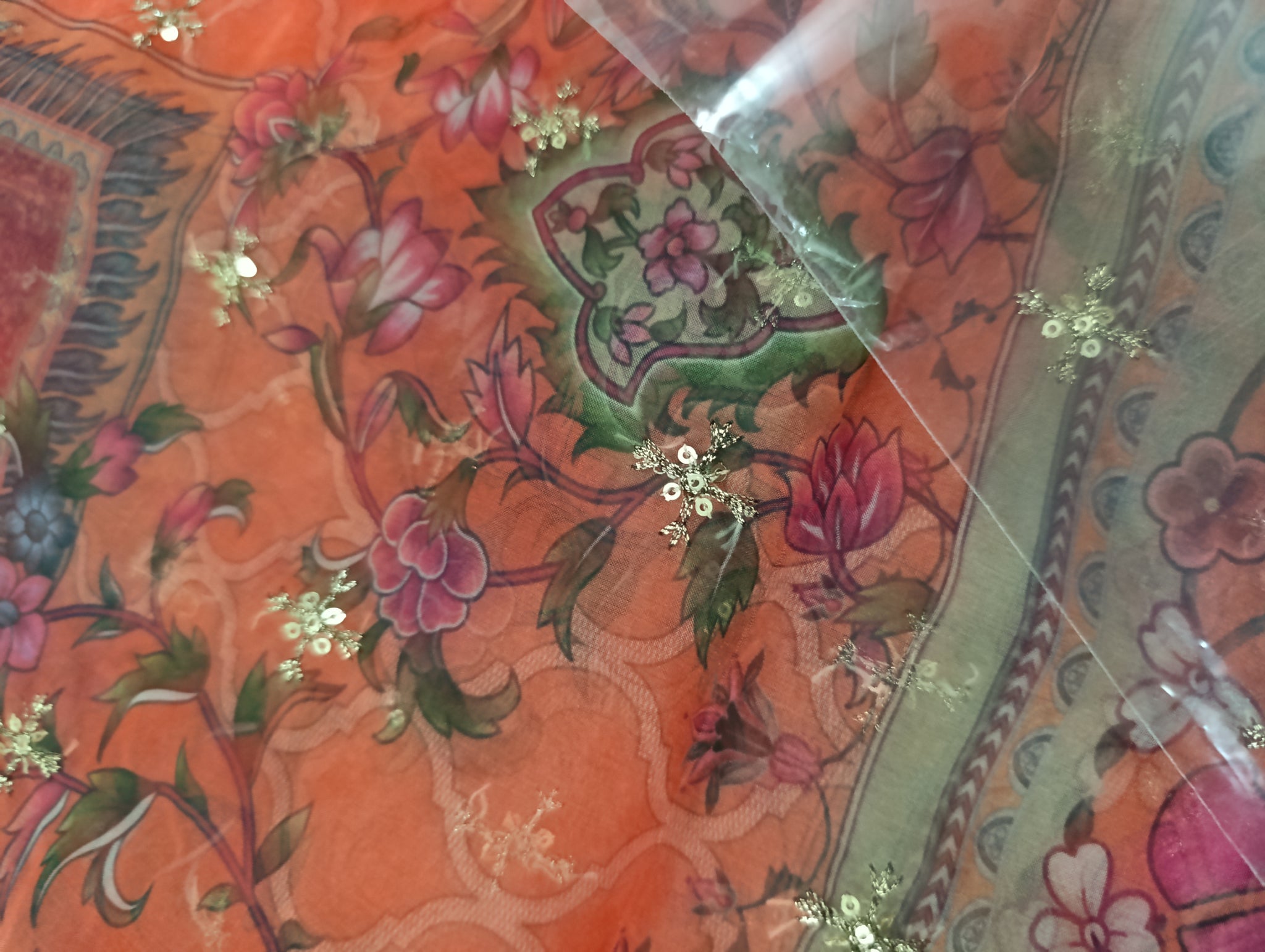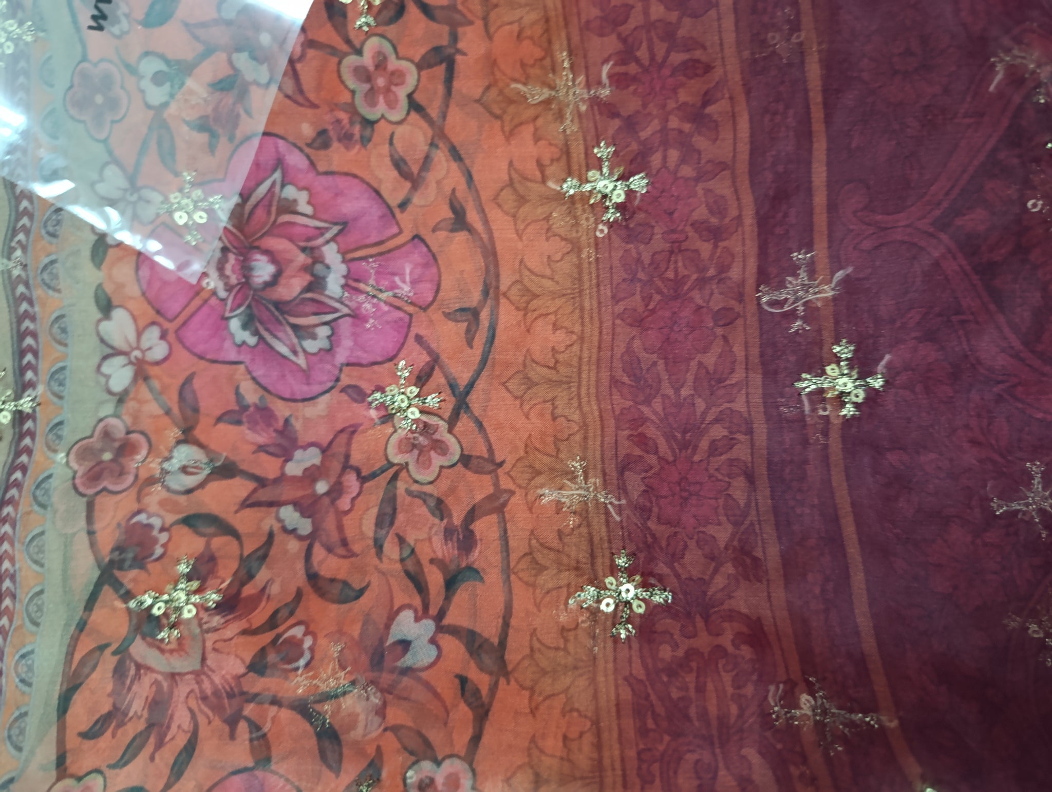 Fully thread and copper gold tilla embroidered with golden sequins embellishment regular motives and four sided patching on printed duppta in floral designing with partition at the center and borders at the corner.