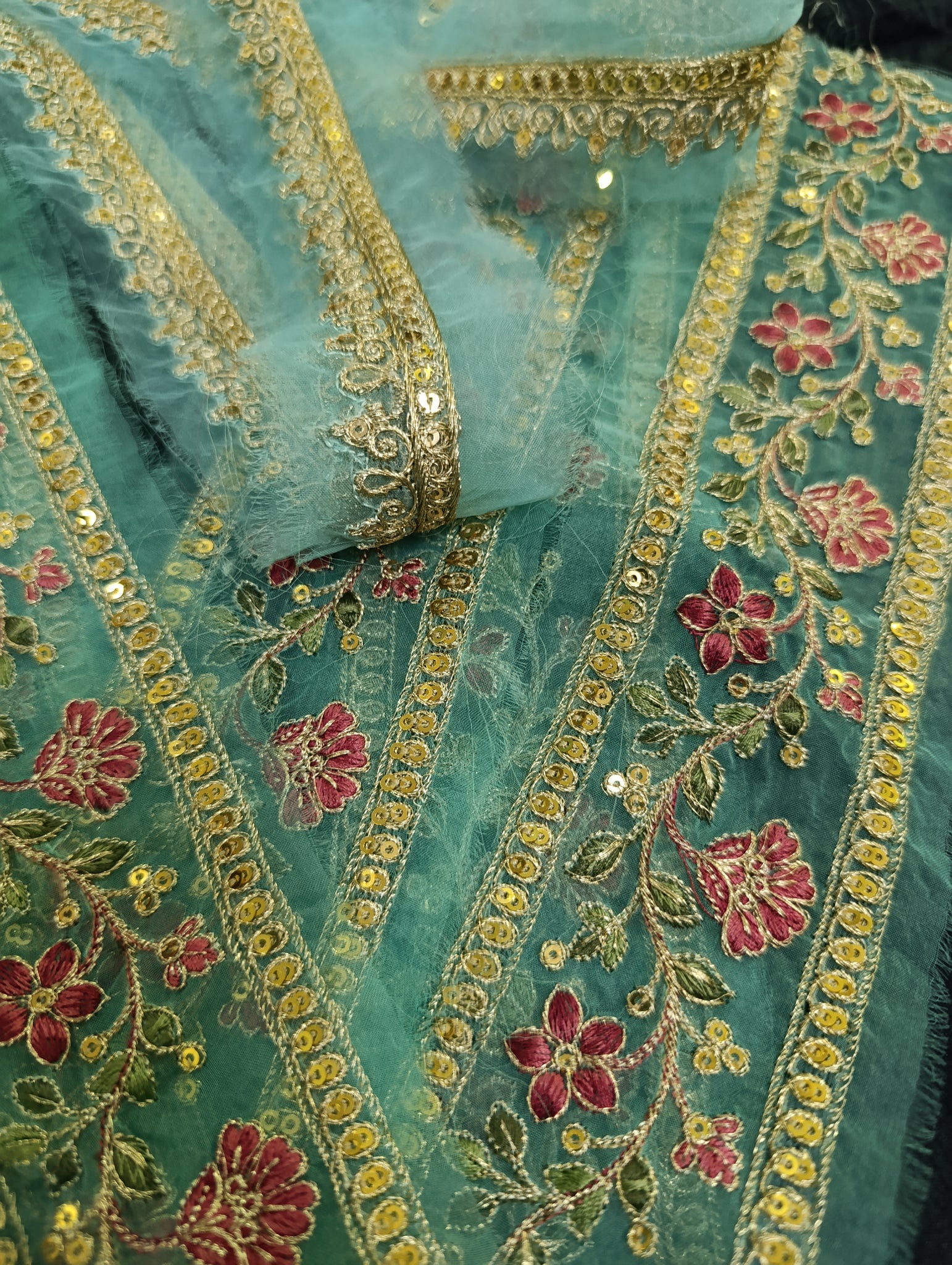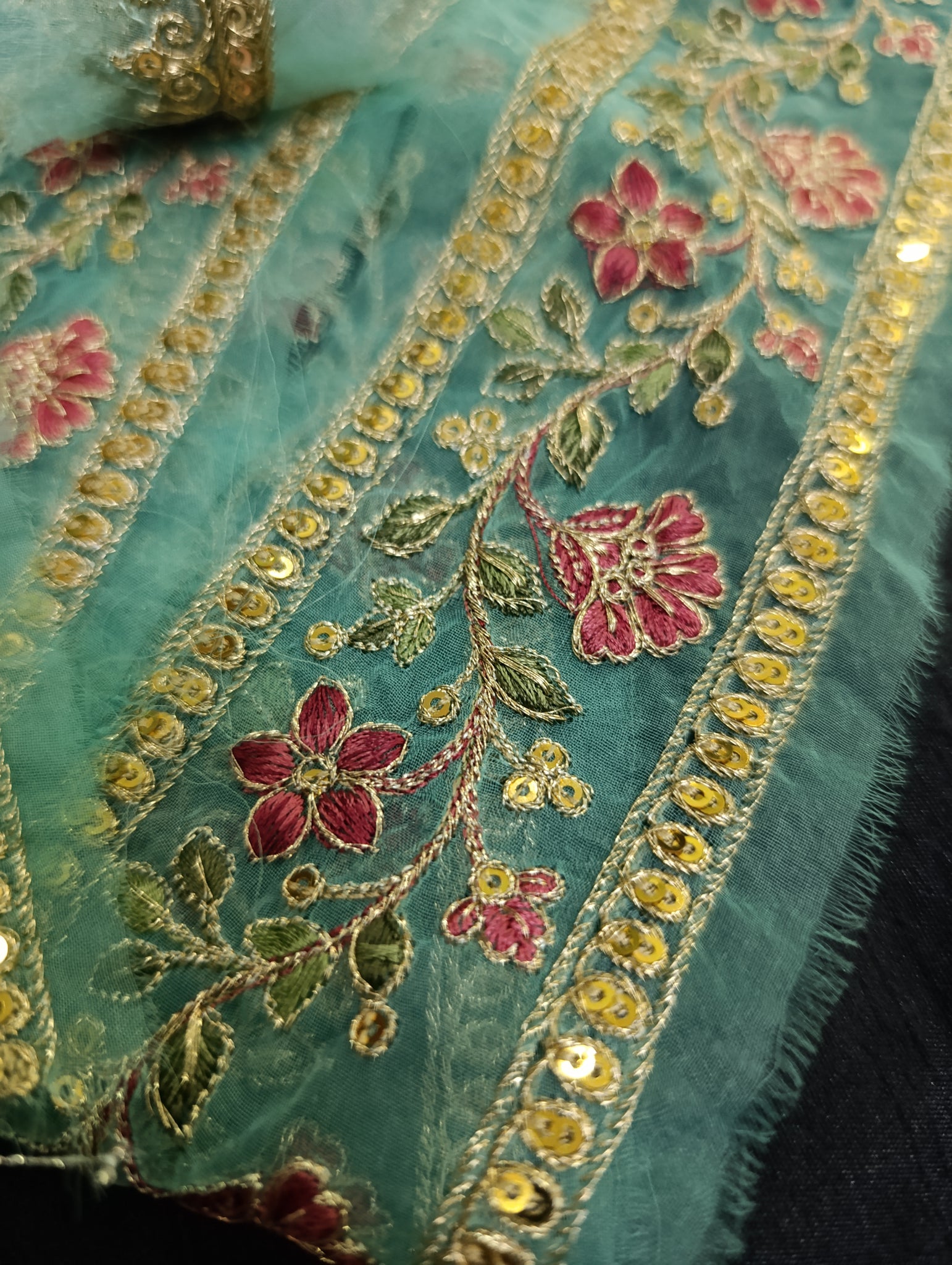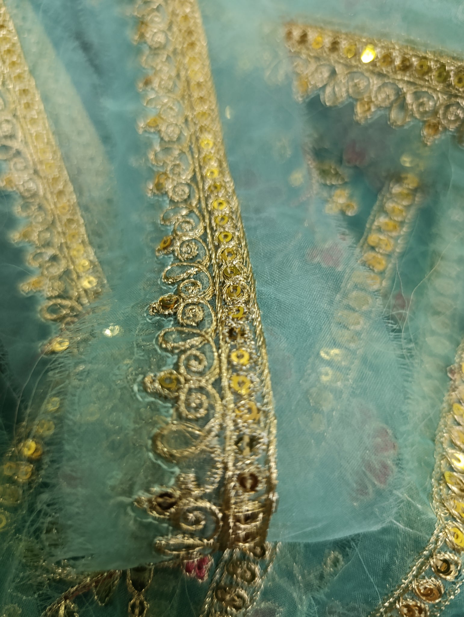 Heavily thread and golden tilla embroidered with golden sequins embellishments broad 2 patches: one patch length more than 1.5 yards width 2.5 inches. Second patch semi stitched length 30 inches width 2.5 inches
