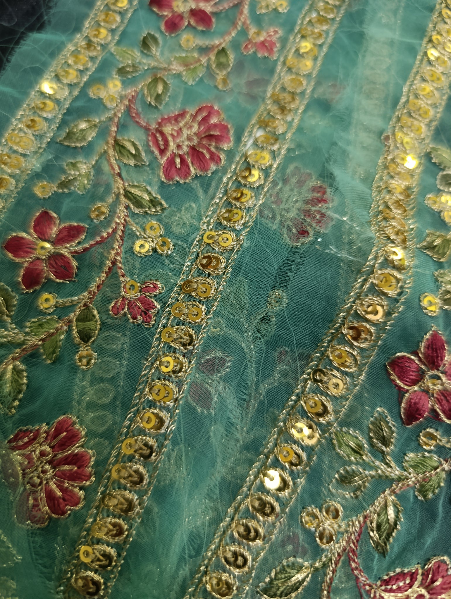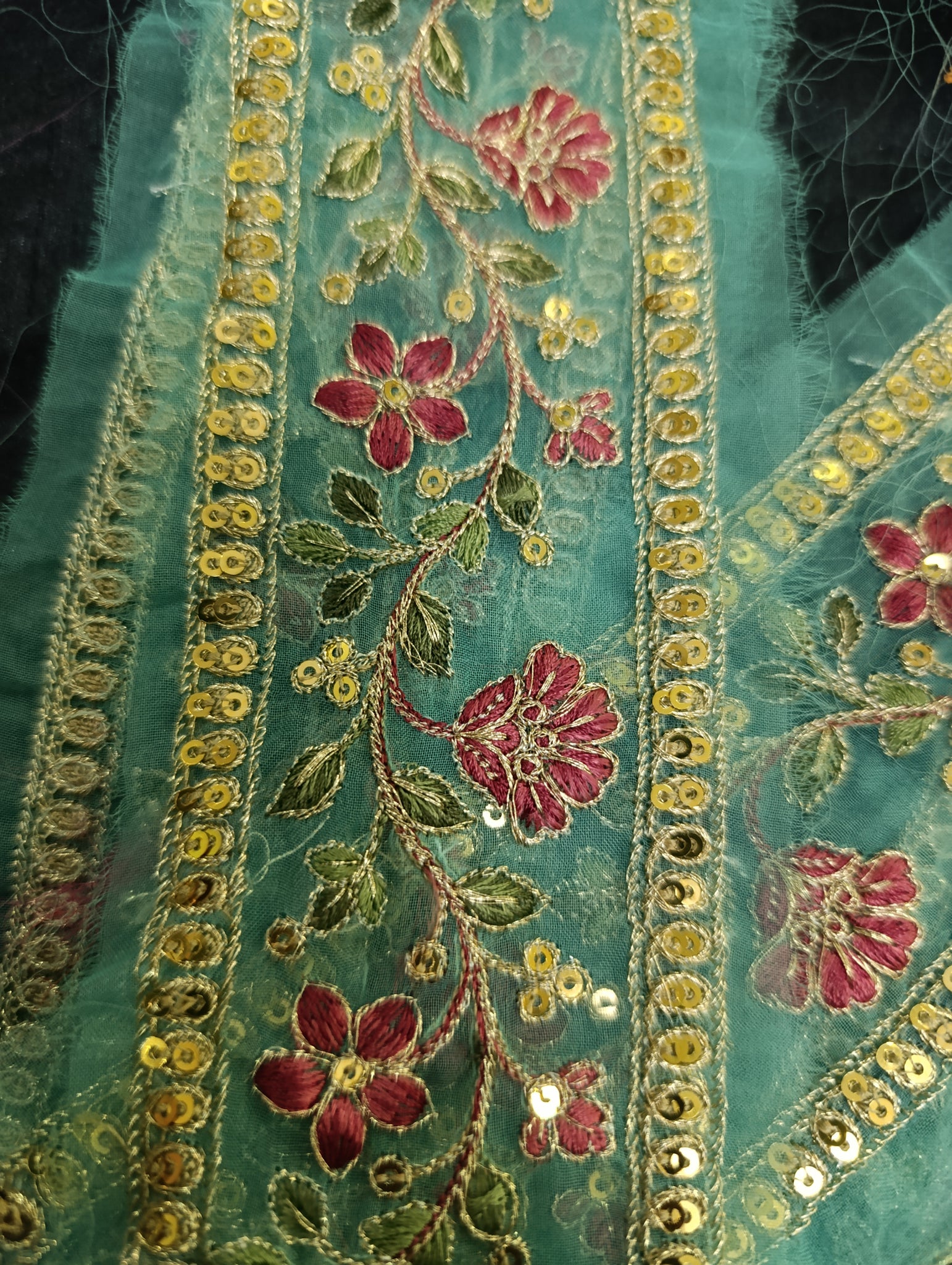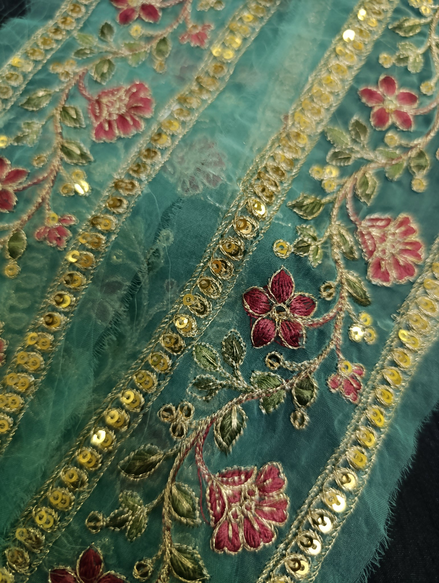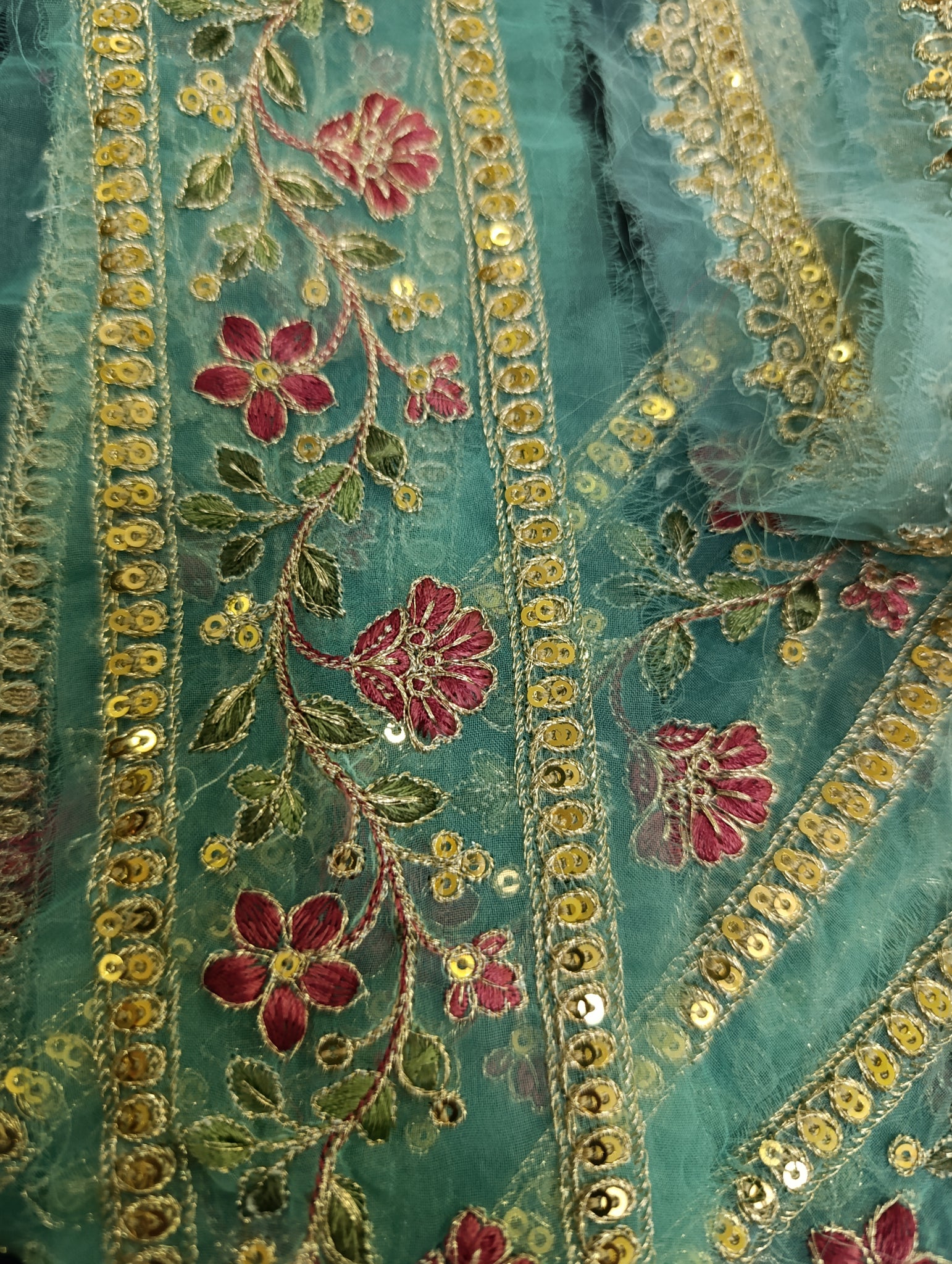 Heavily thread and golden tilla embroidered with golden sequins embellishments broad 2 patches: one patch length more than 1.5 yards width 2.5 inches. Second patch semi stitched length 30 inches width 2.5 inches