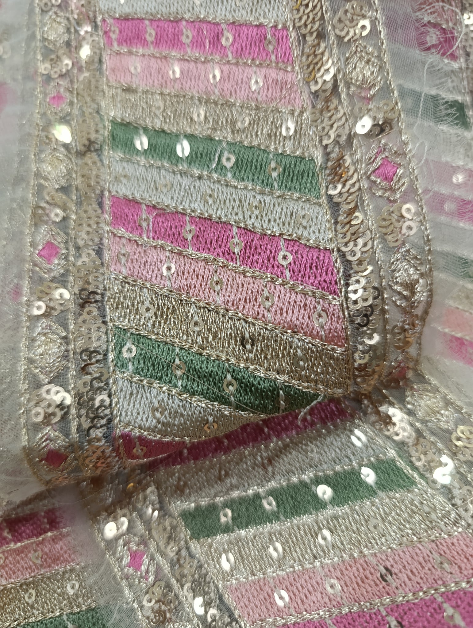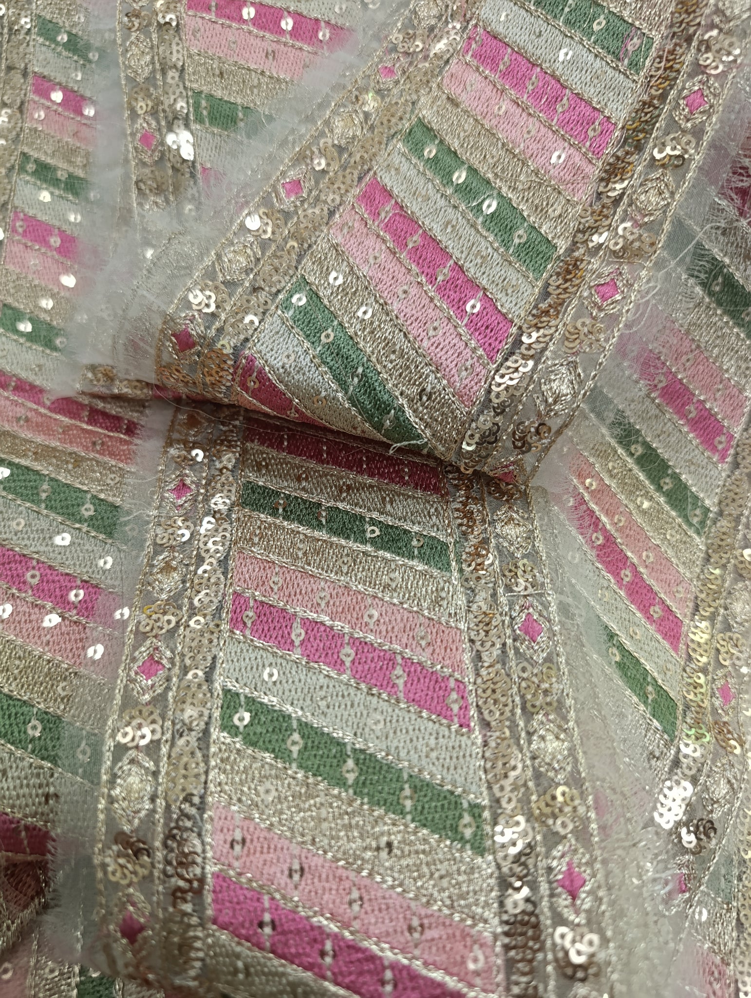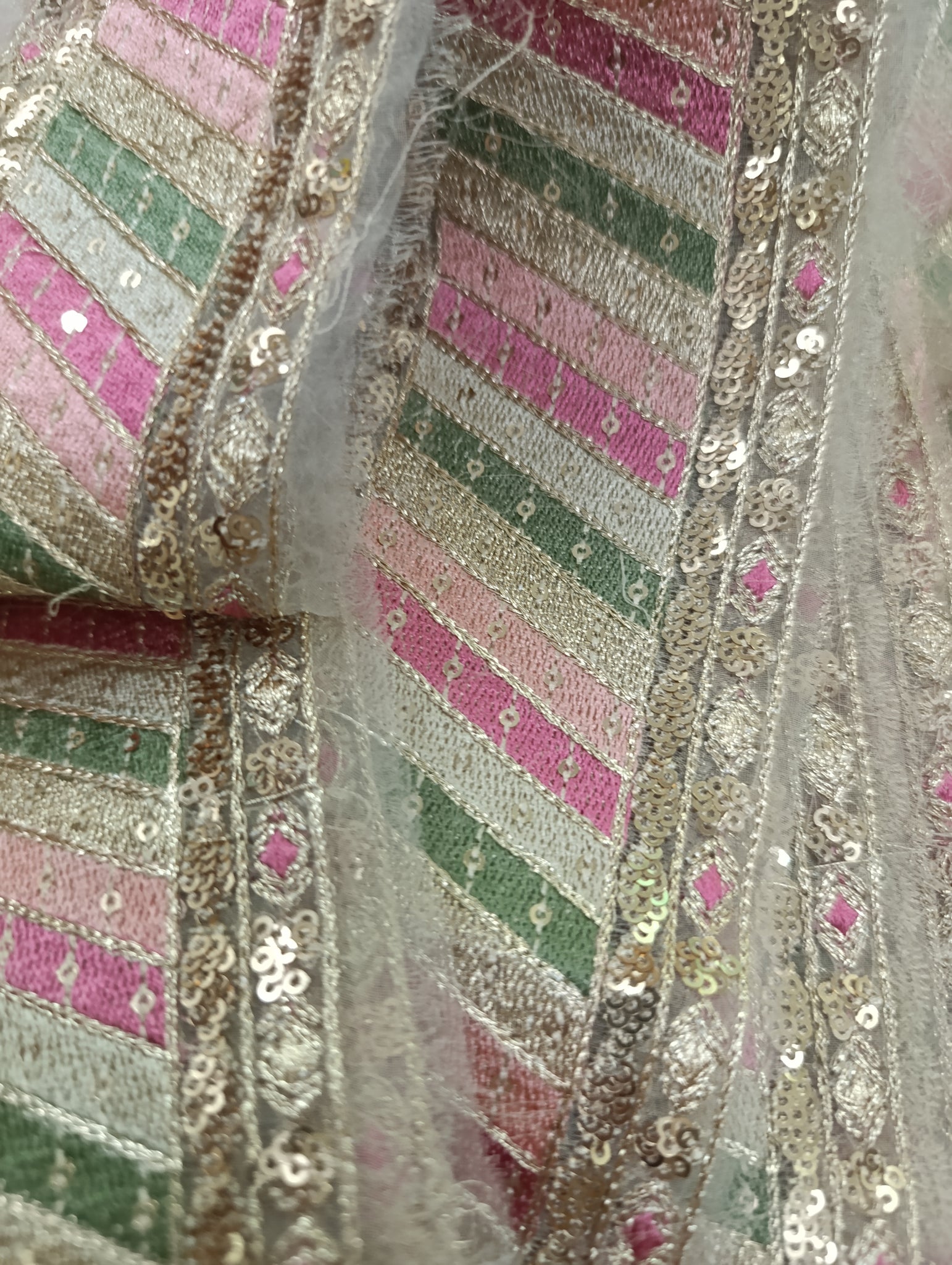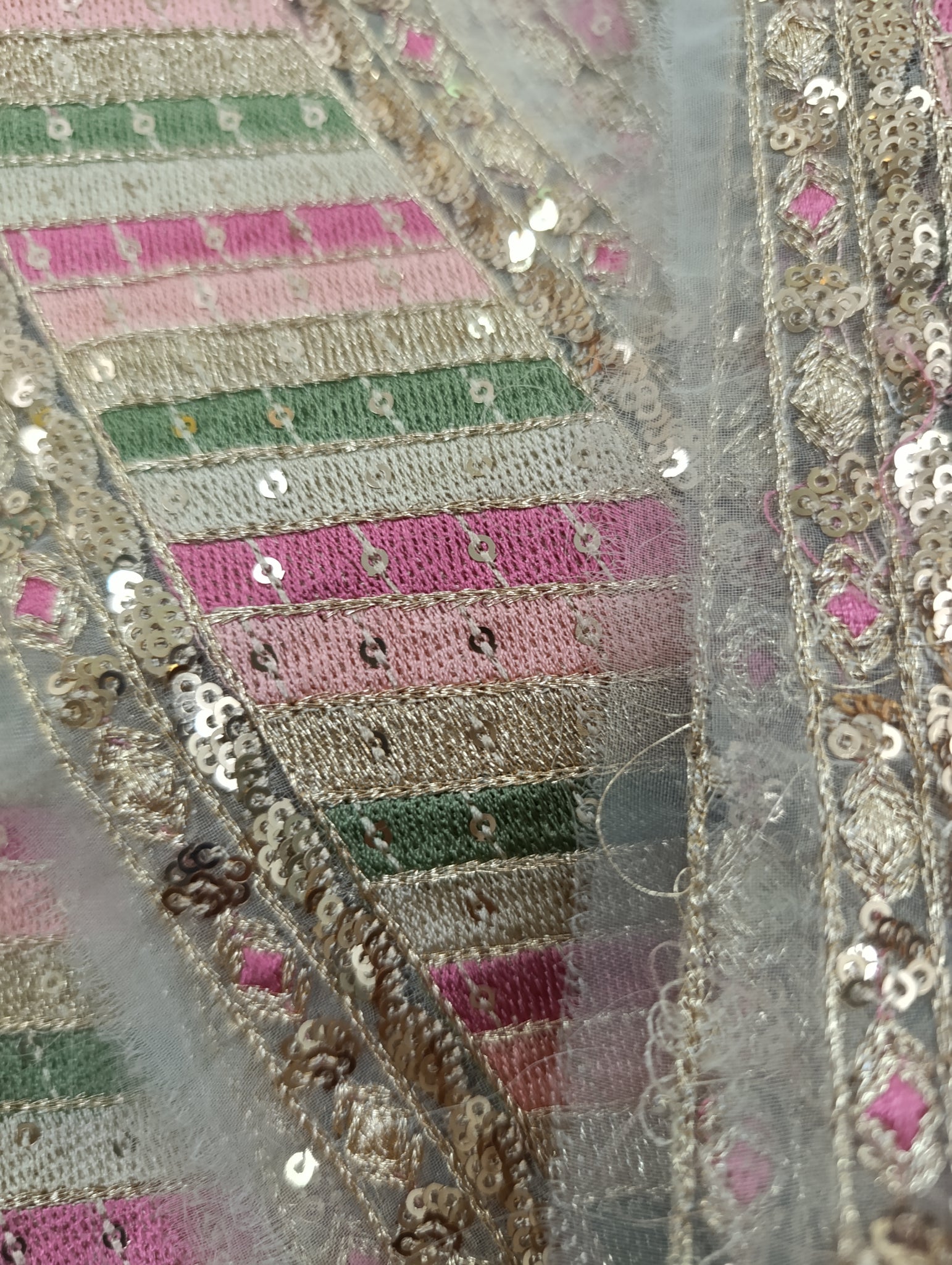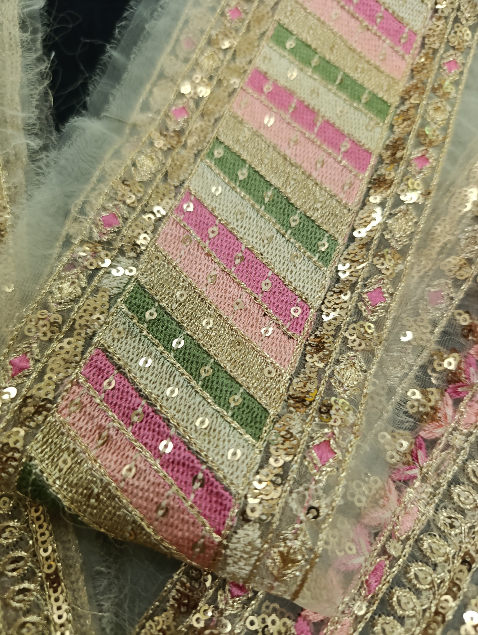 Heavily thread and golden tilla embroidered with golden sequins embellishments in chatta patti embroidery diagonal vertical lines and 2 different designs at borders.