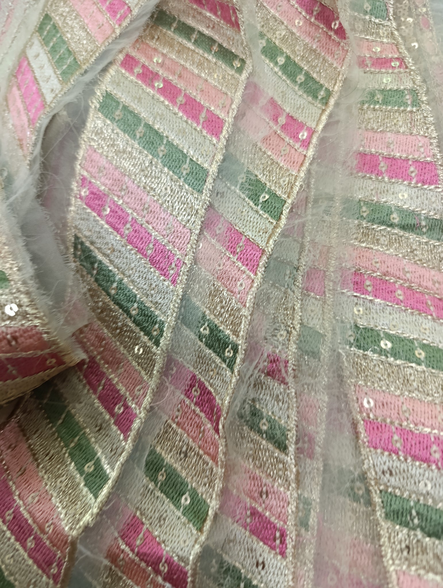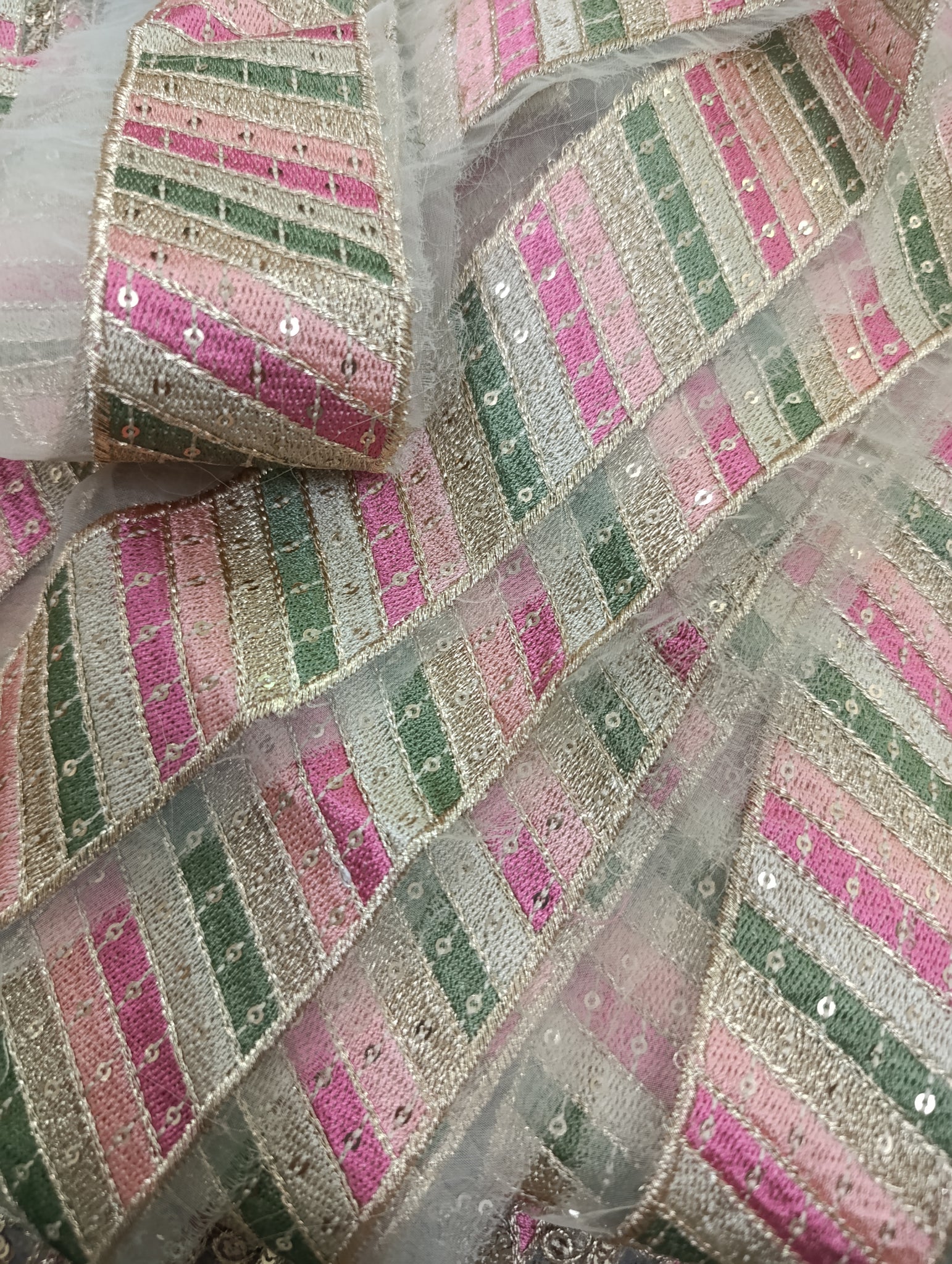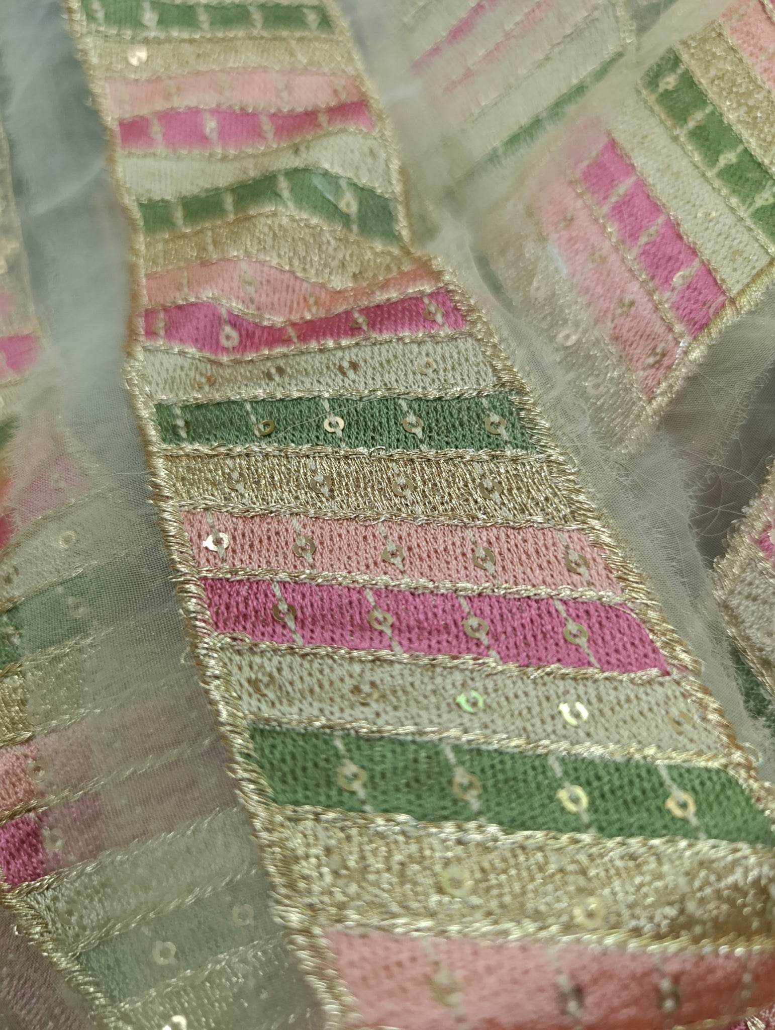 Heavily thread and golden tilla embroidered with golden sequins embellishments in chatta patti embroidery diagonal vertical lines .