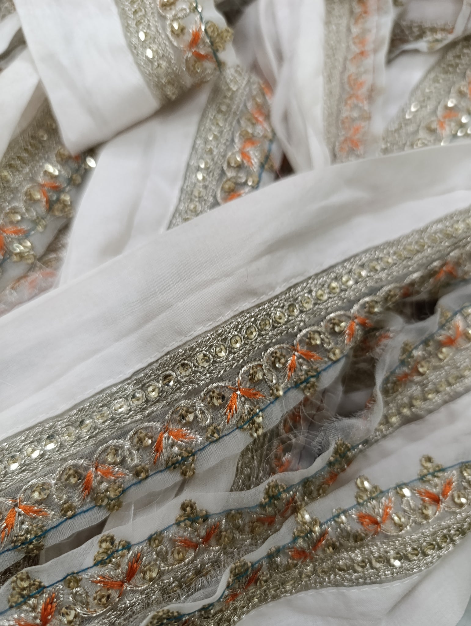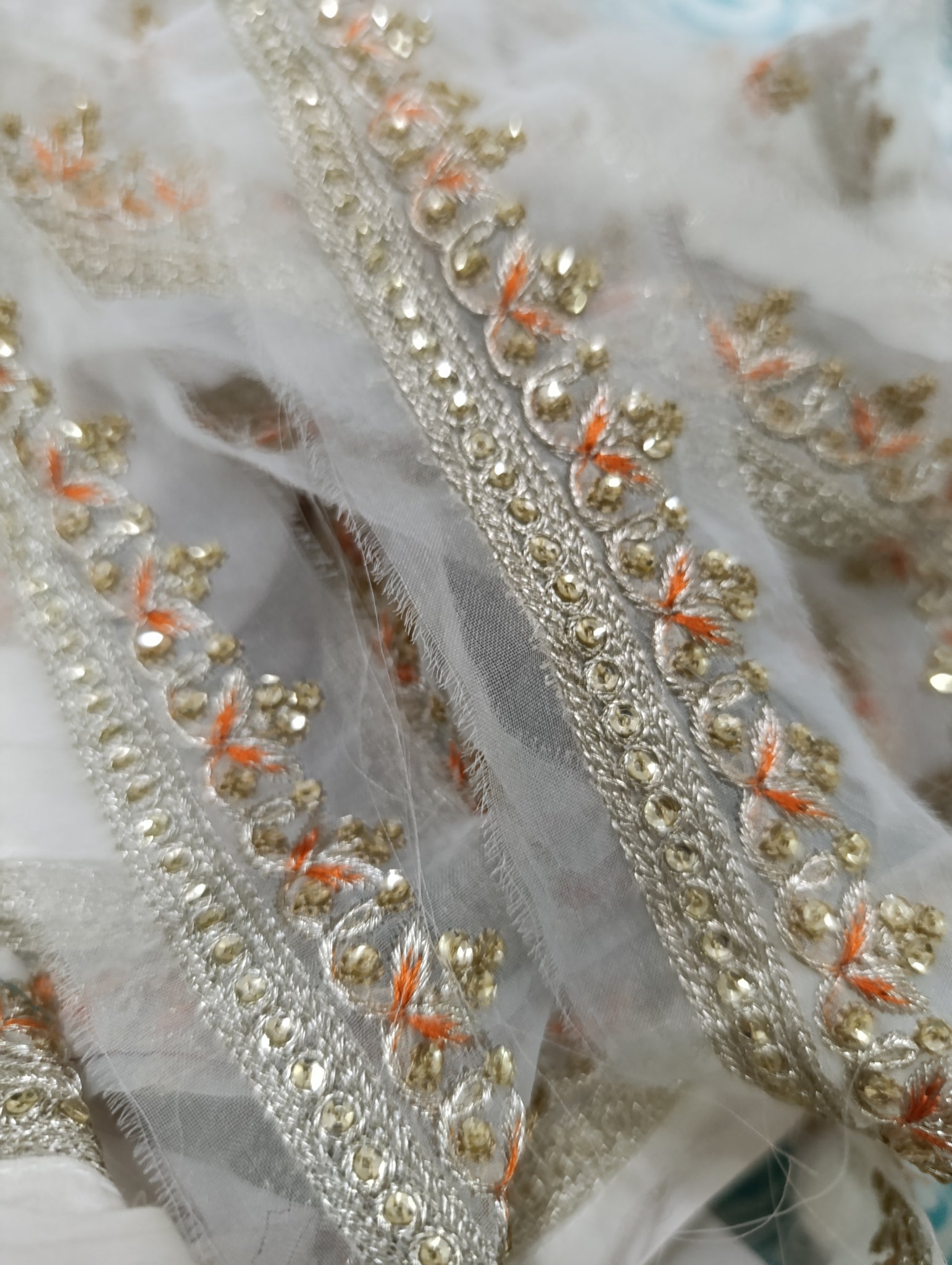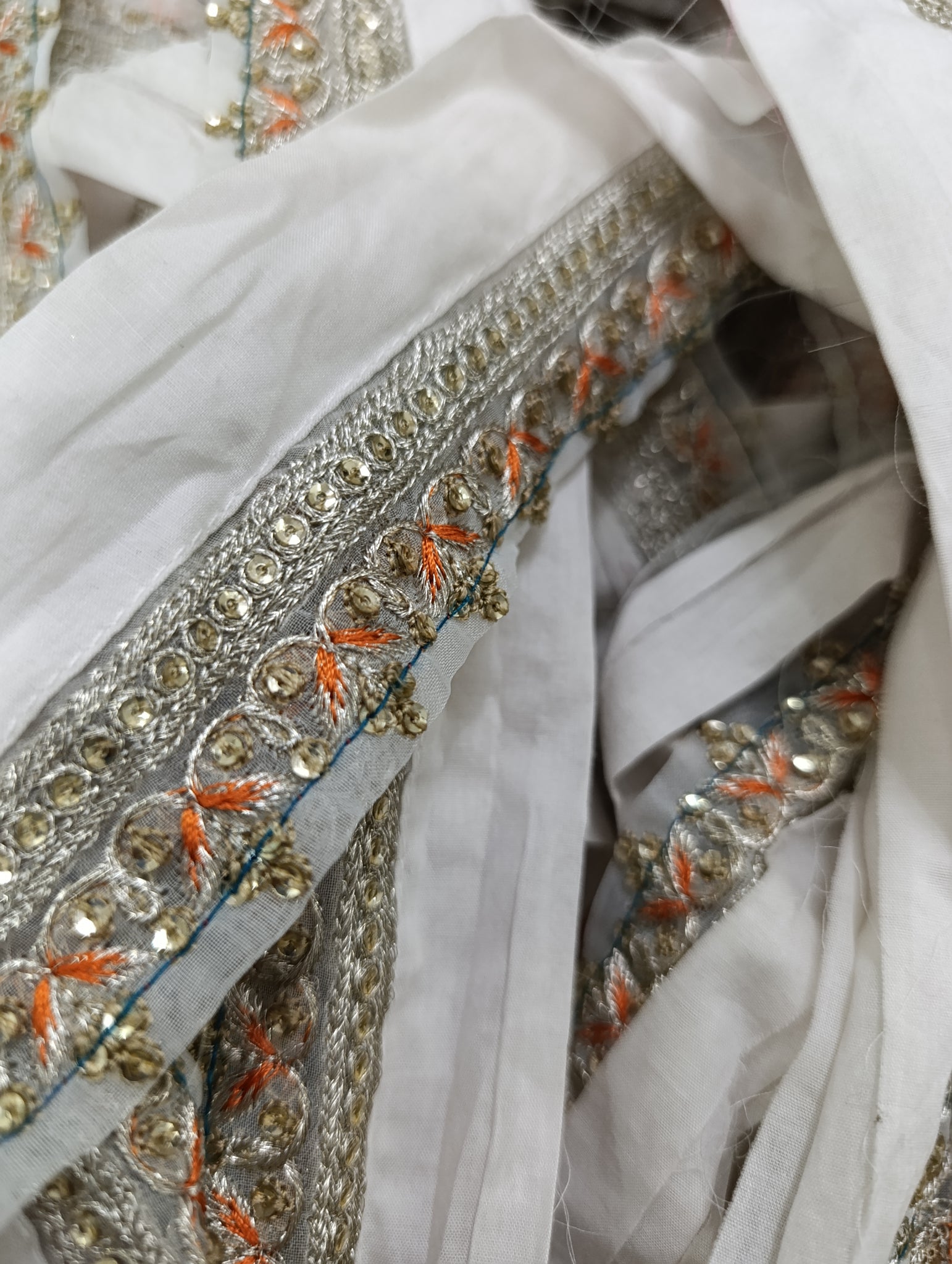 Fully thread and silver tilla embroidered with golden sequins embellishment.