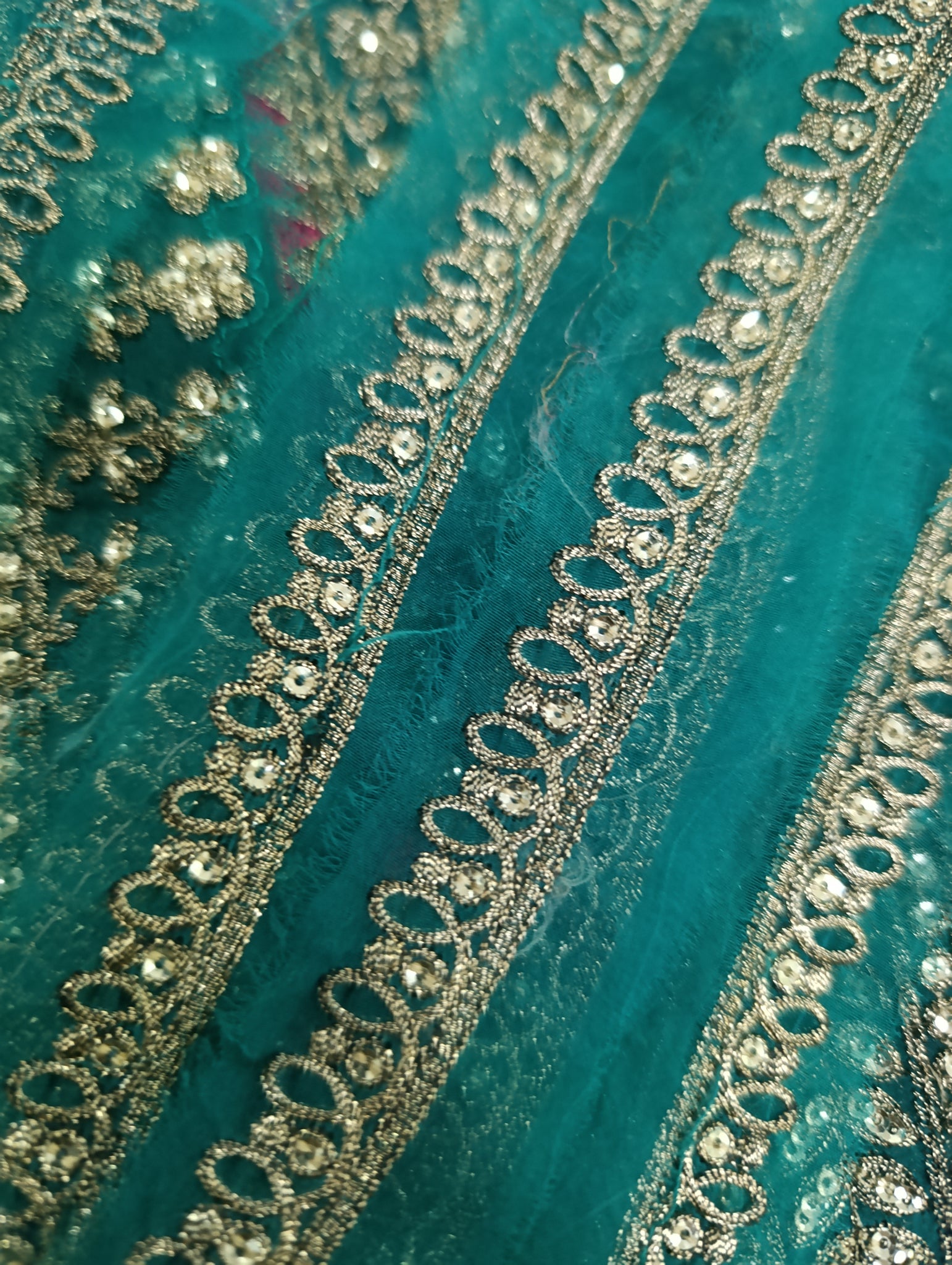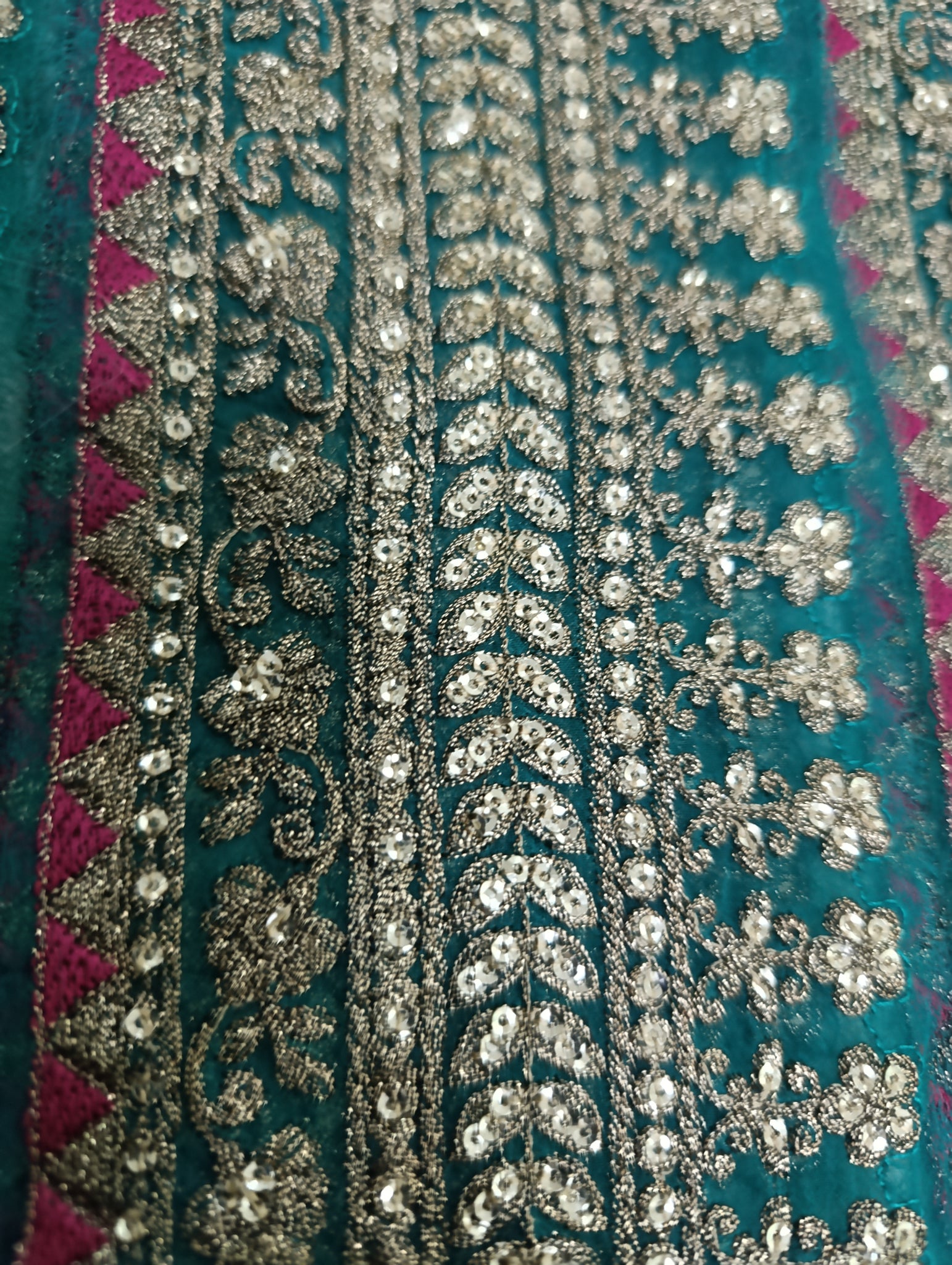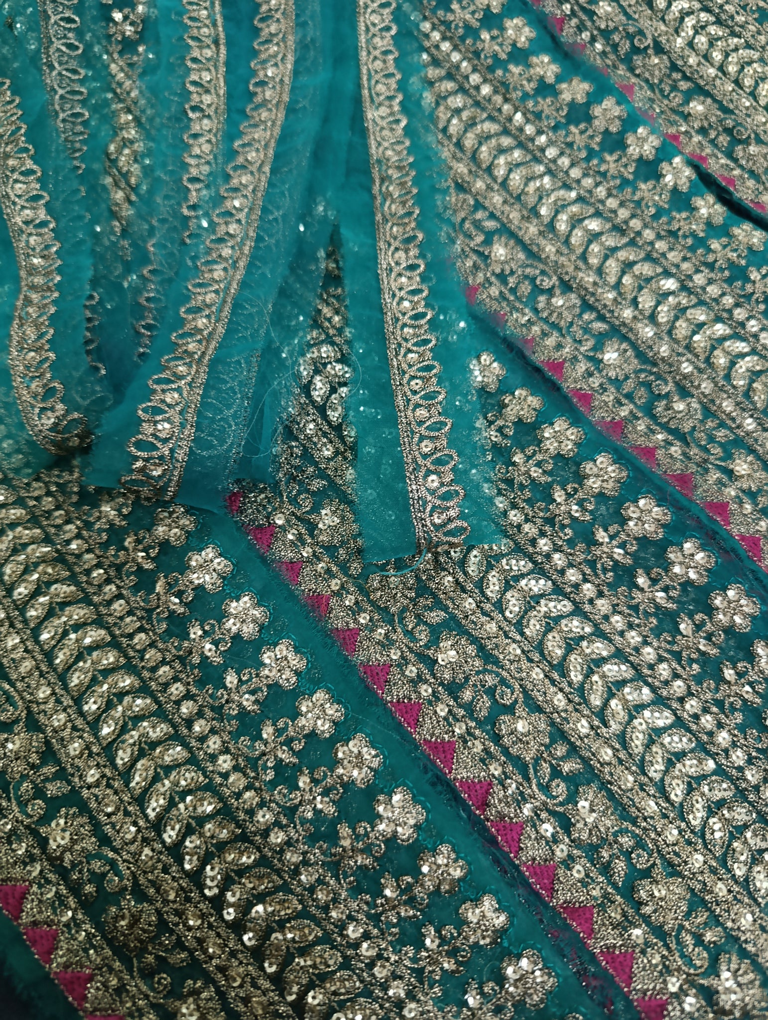 Fully thread embroidered in with embedded foil work and matte golden sequins embellishment.