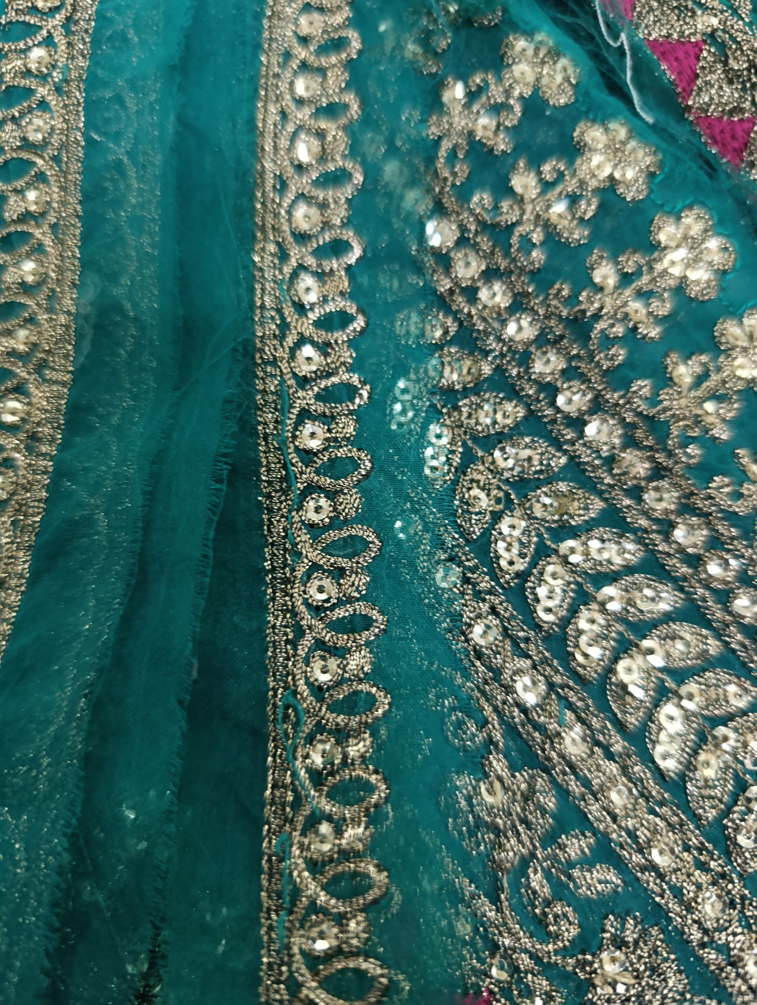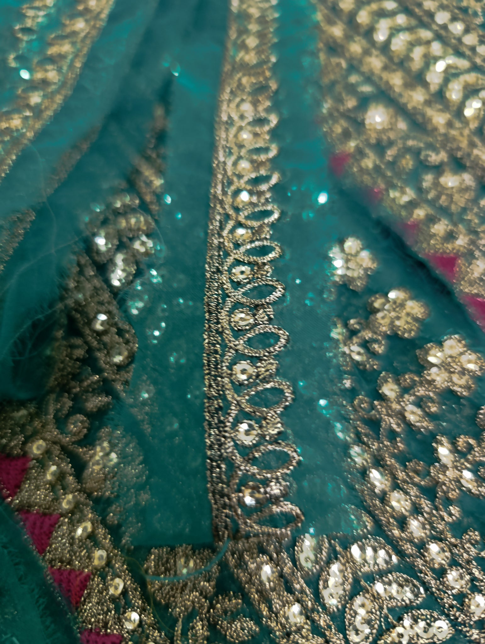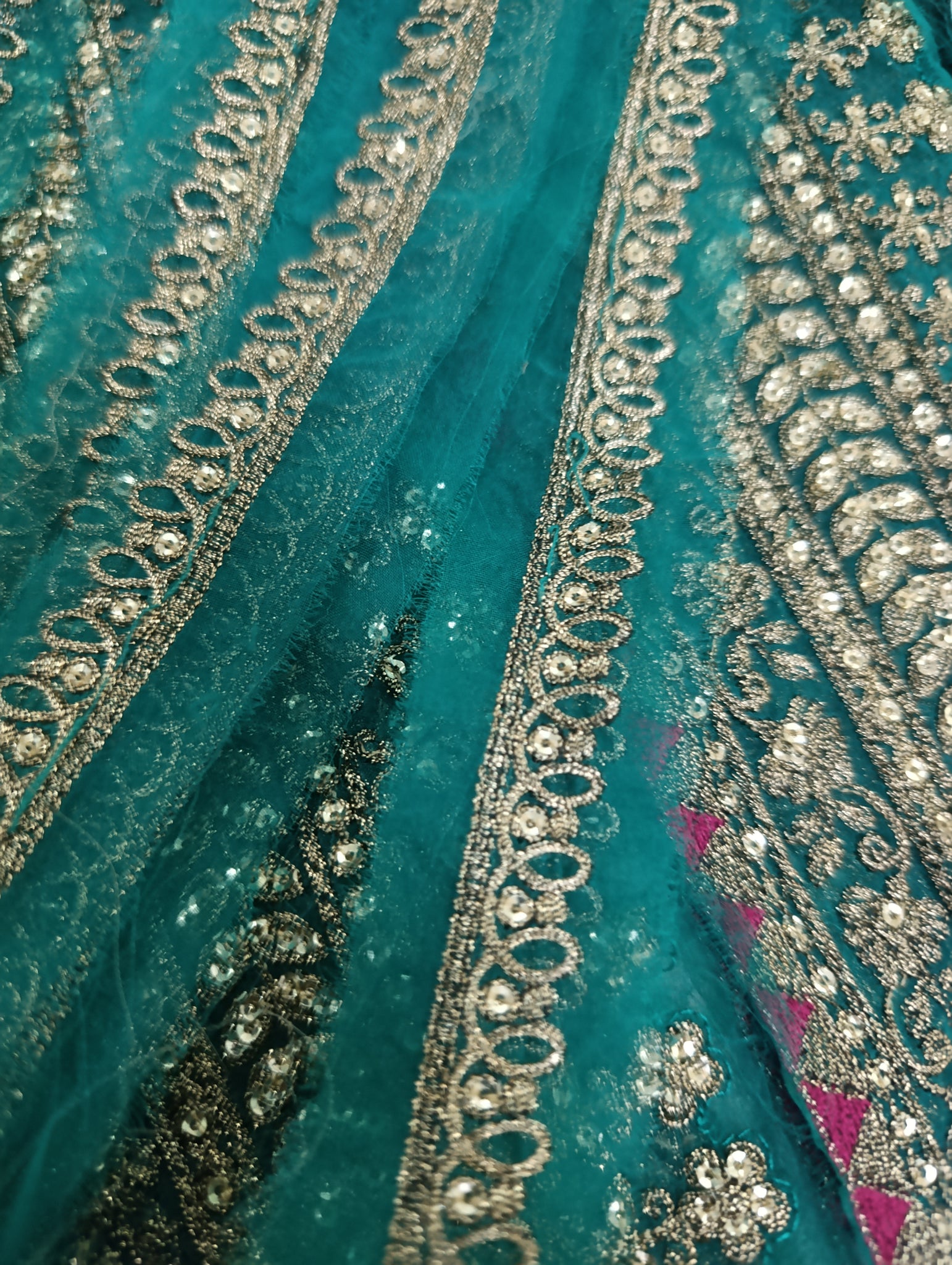 Fully thread embroidered in with embedded foil work and matte golden sequins embellishment.