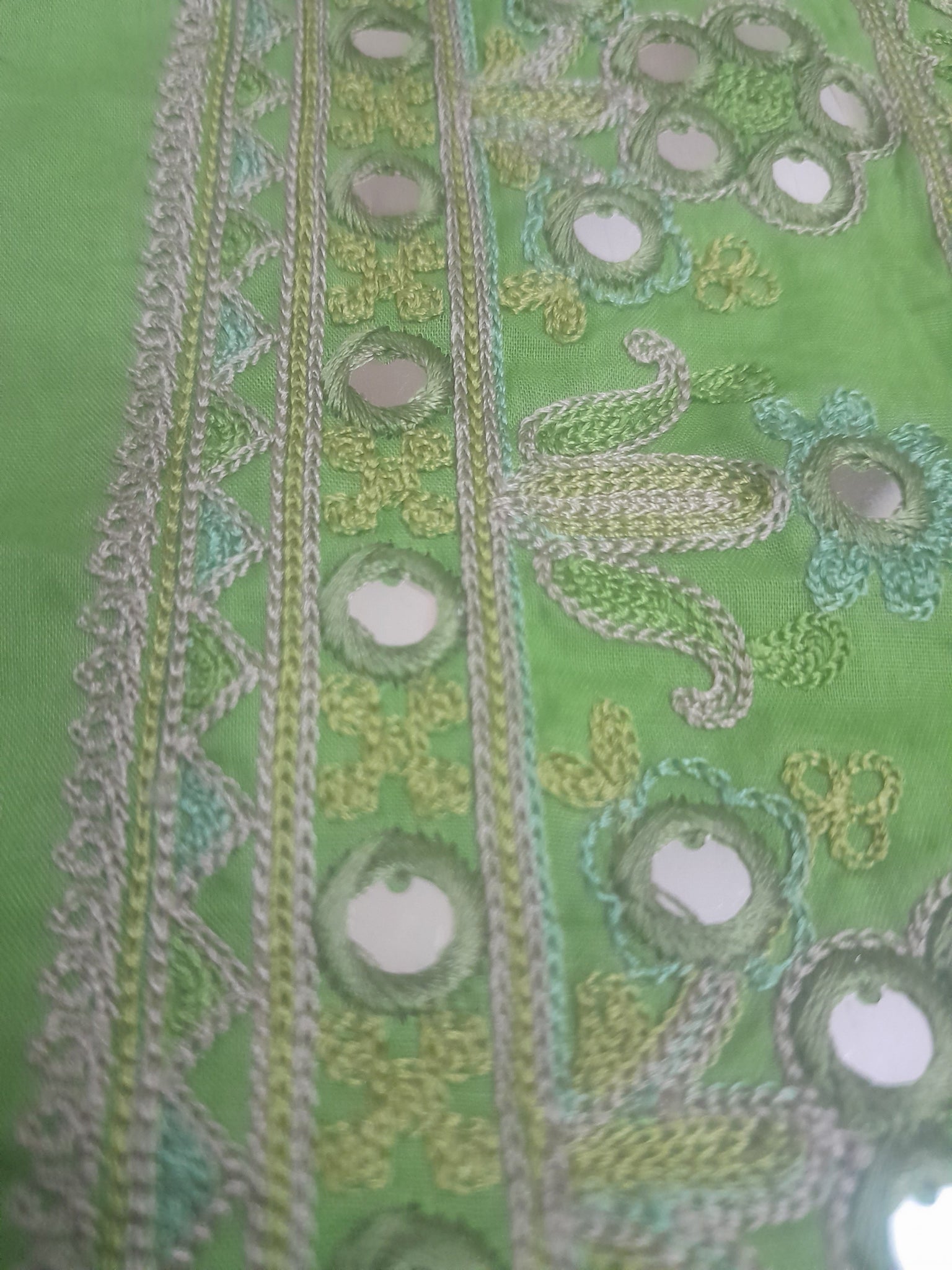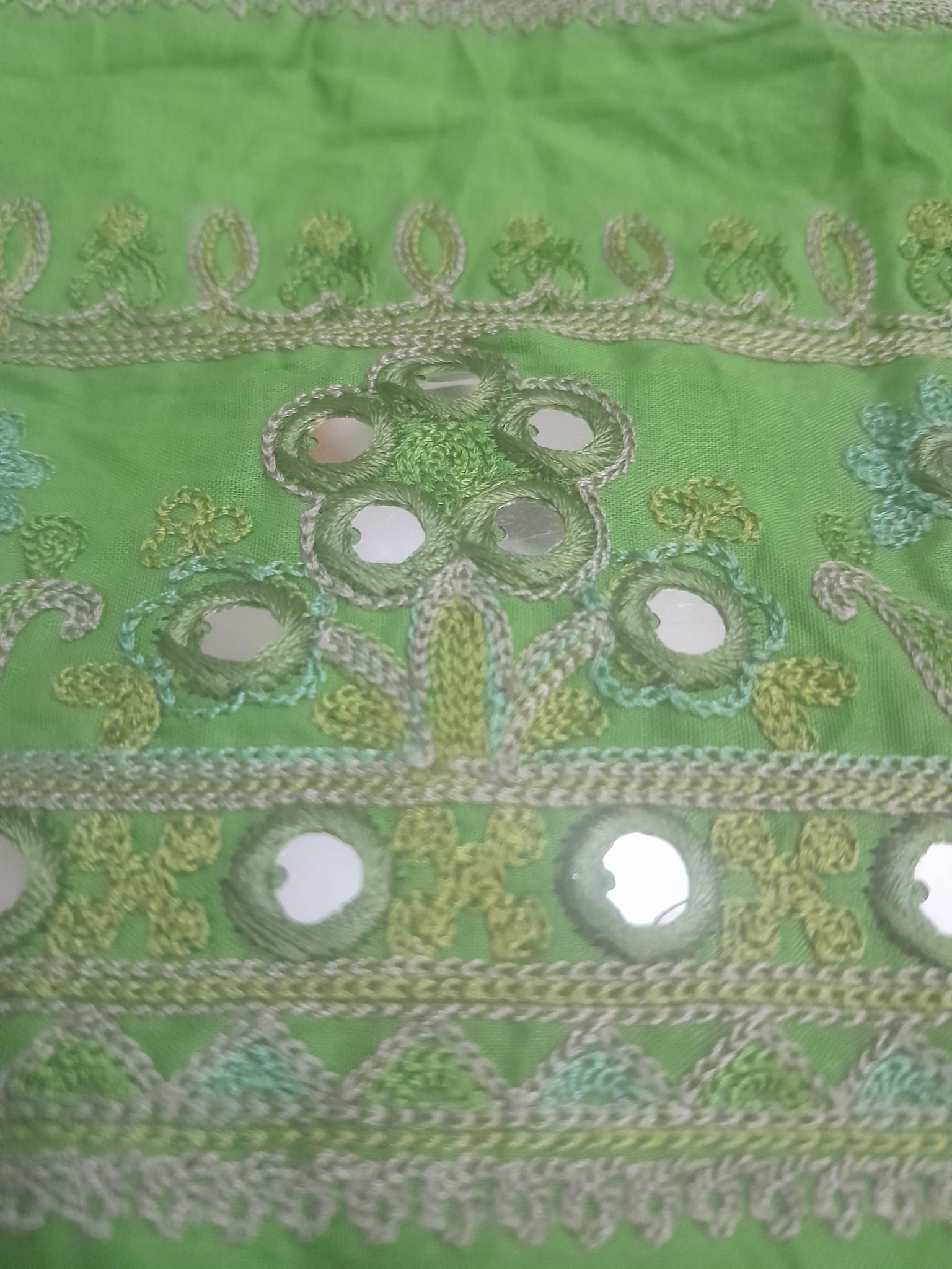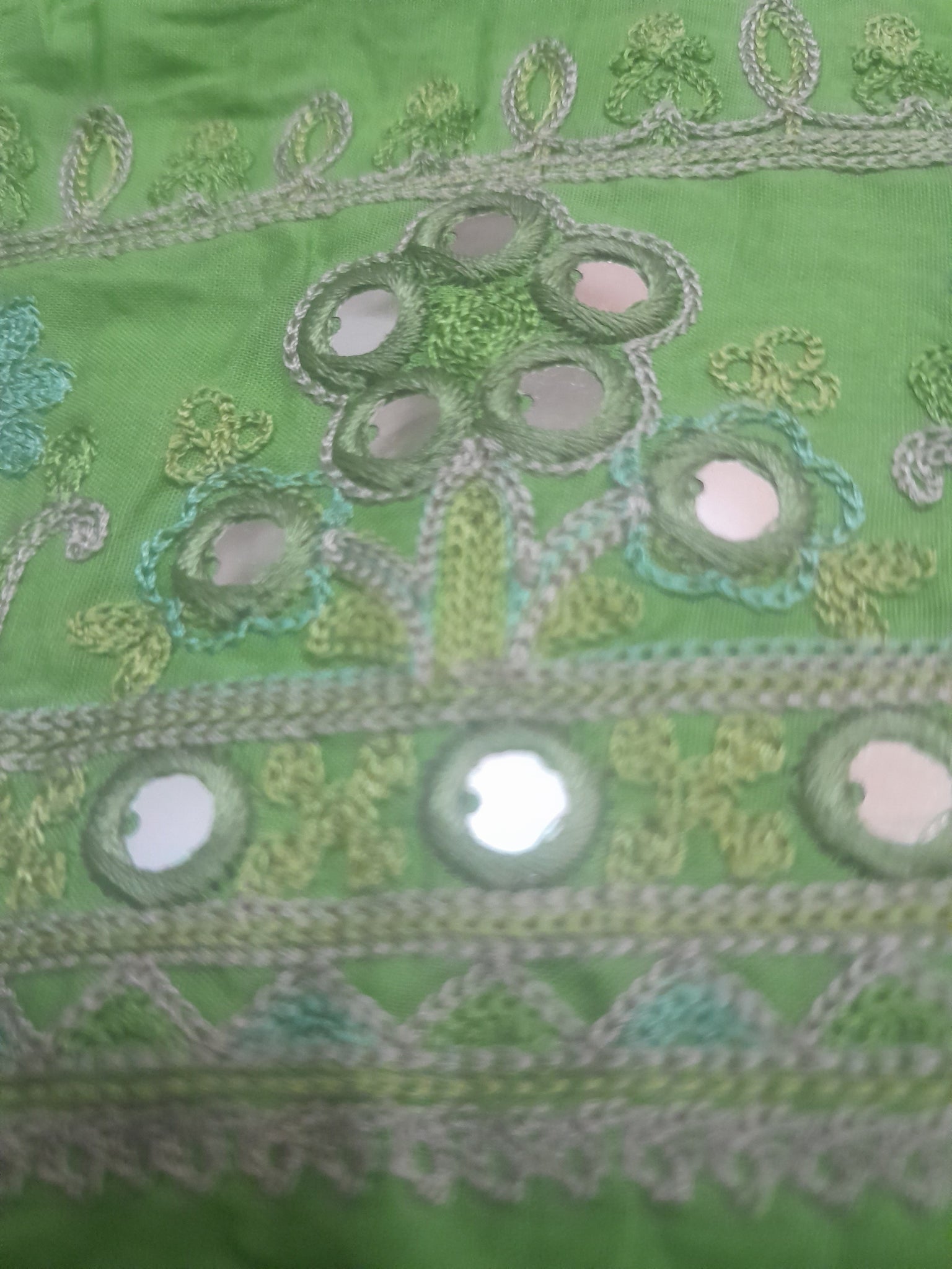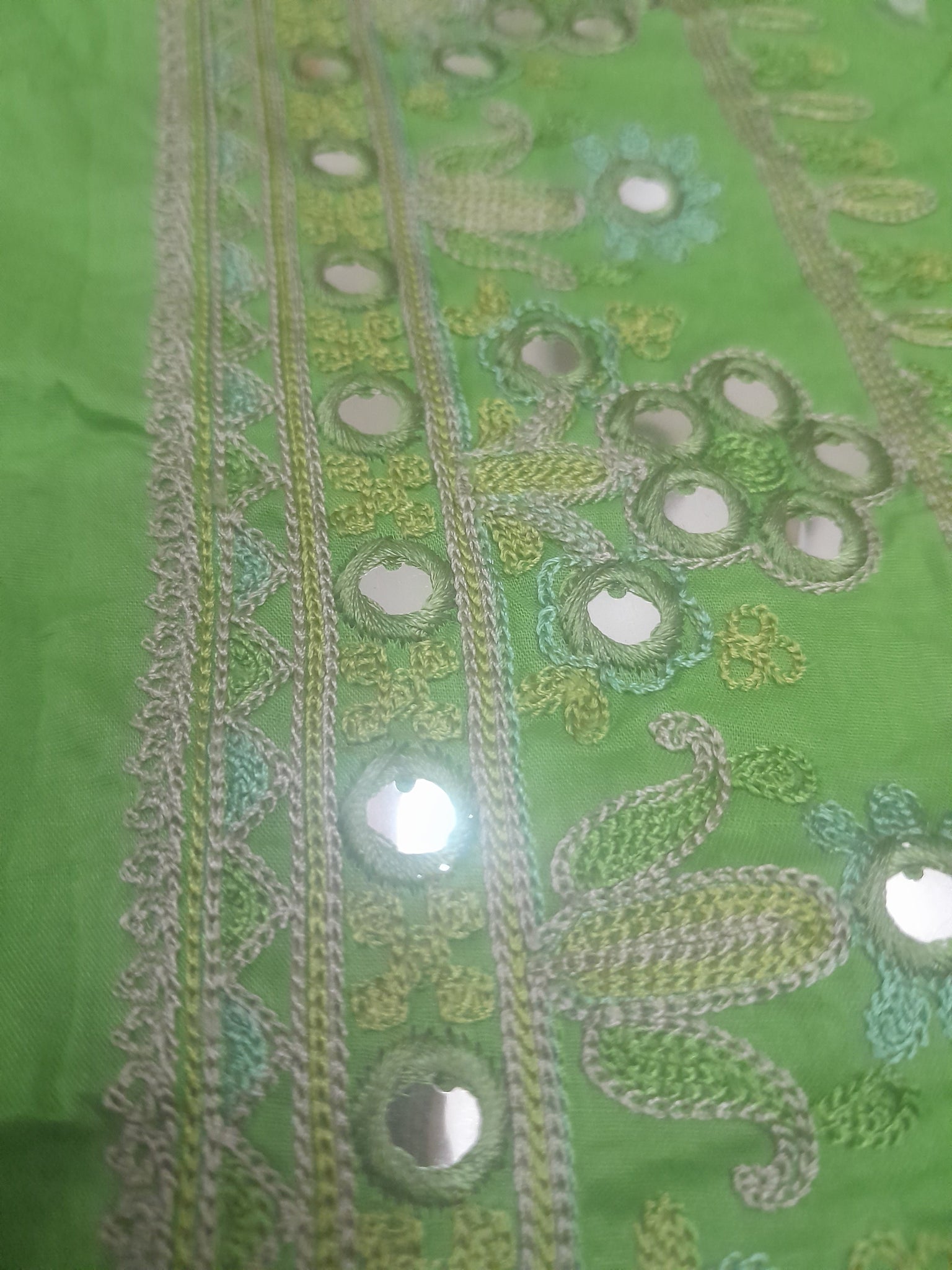 Fully thread embroidered in aar style (chain stitch) with big squins like mirror work.
