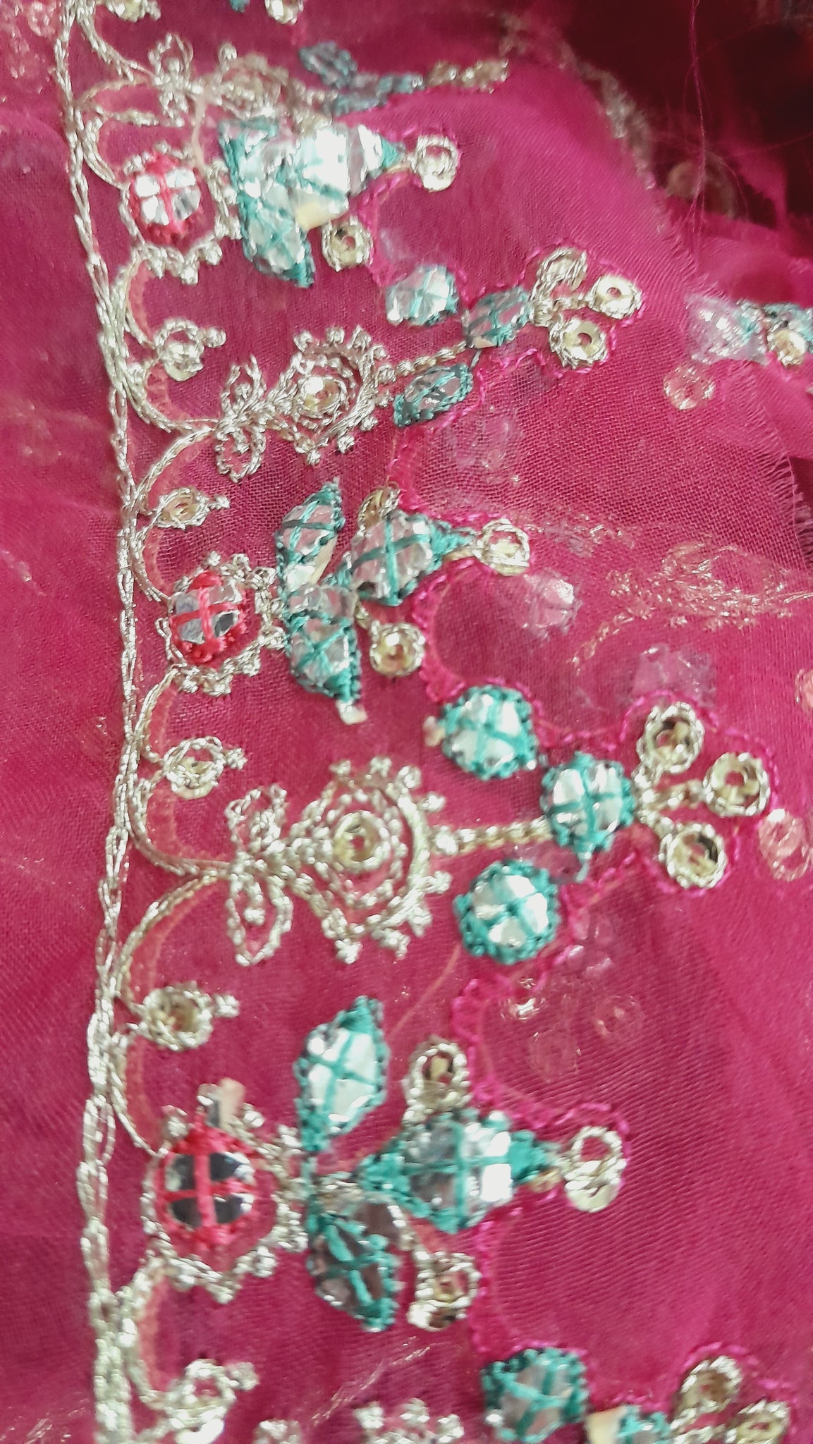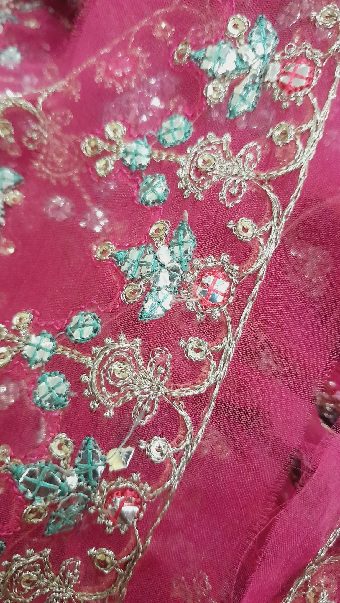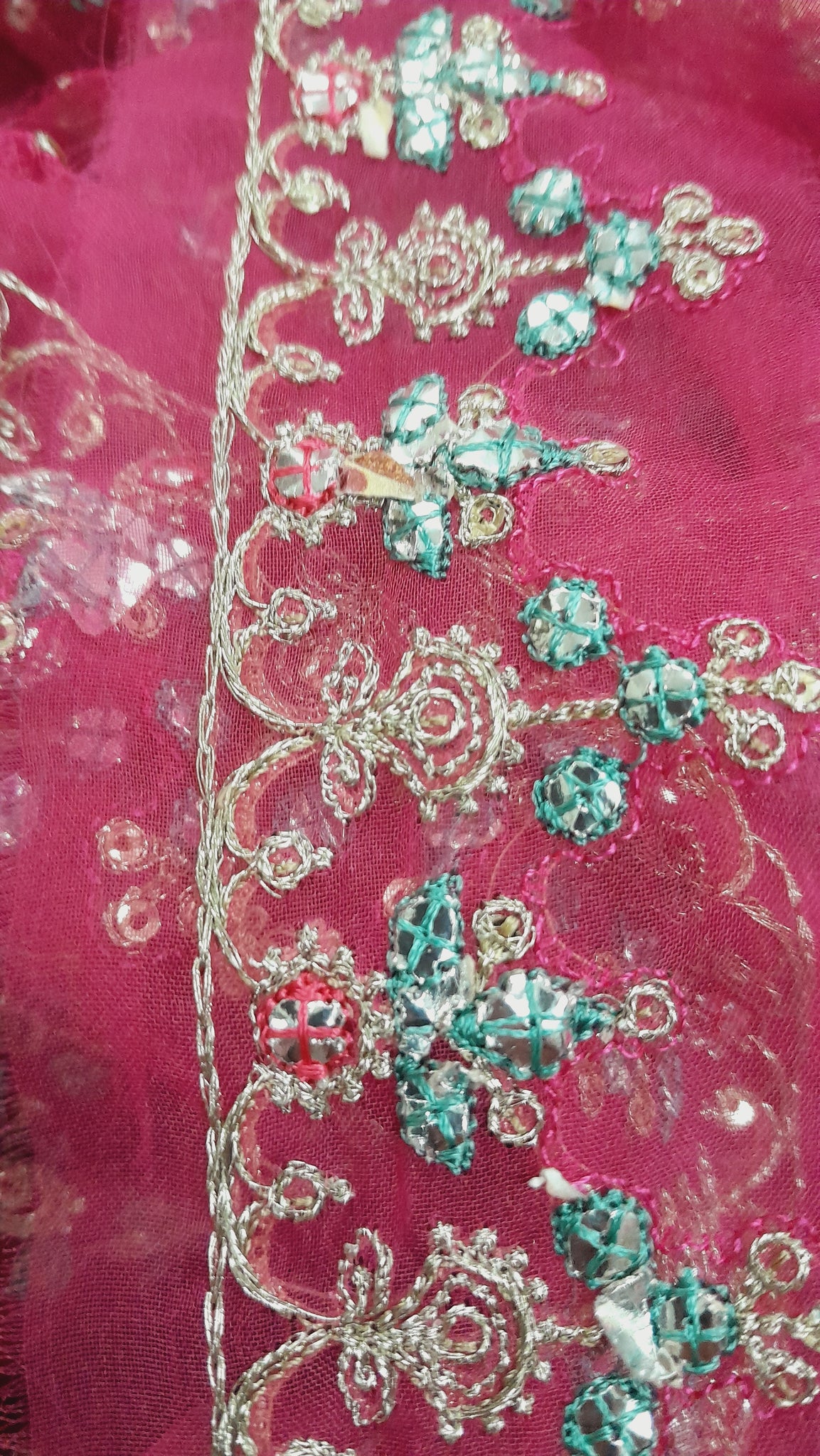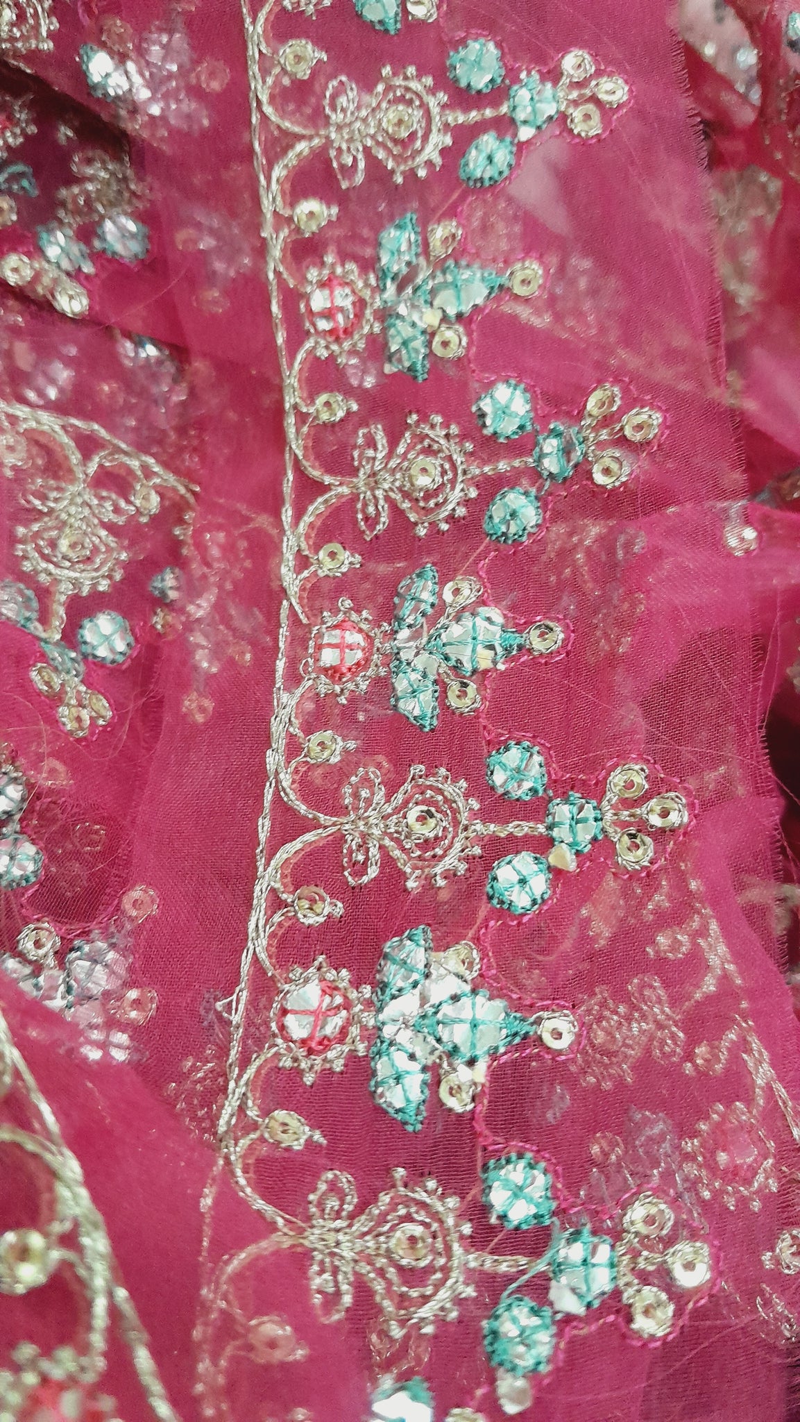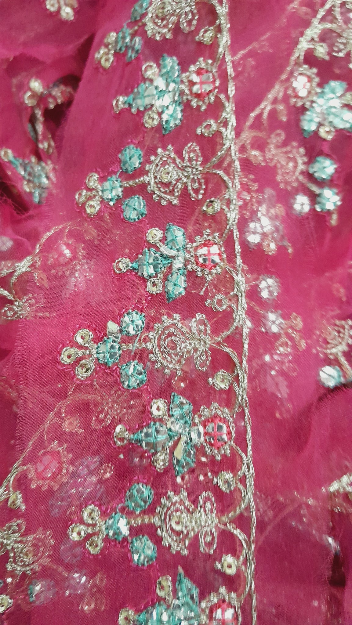 Fully thread and lightest golden tilla embroidered. Silver foil work is embedded with ferozi thread designing.