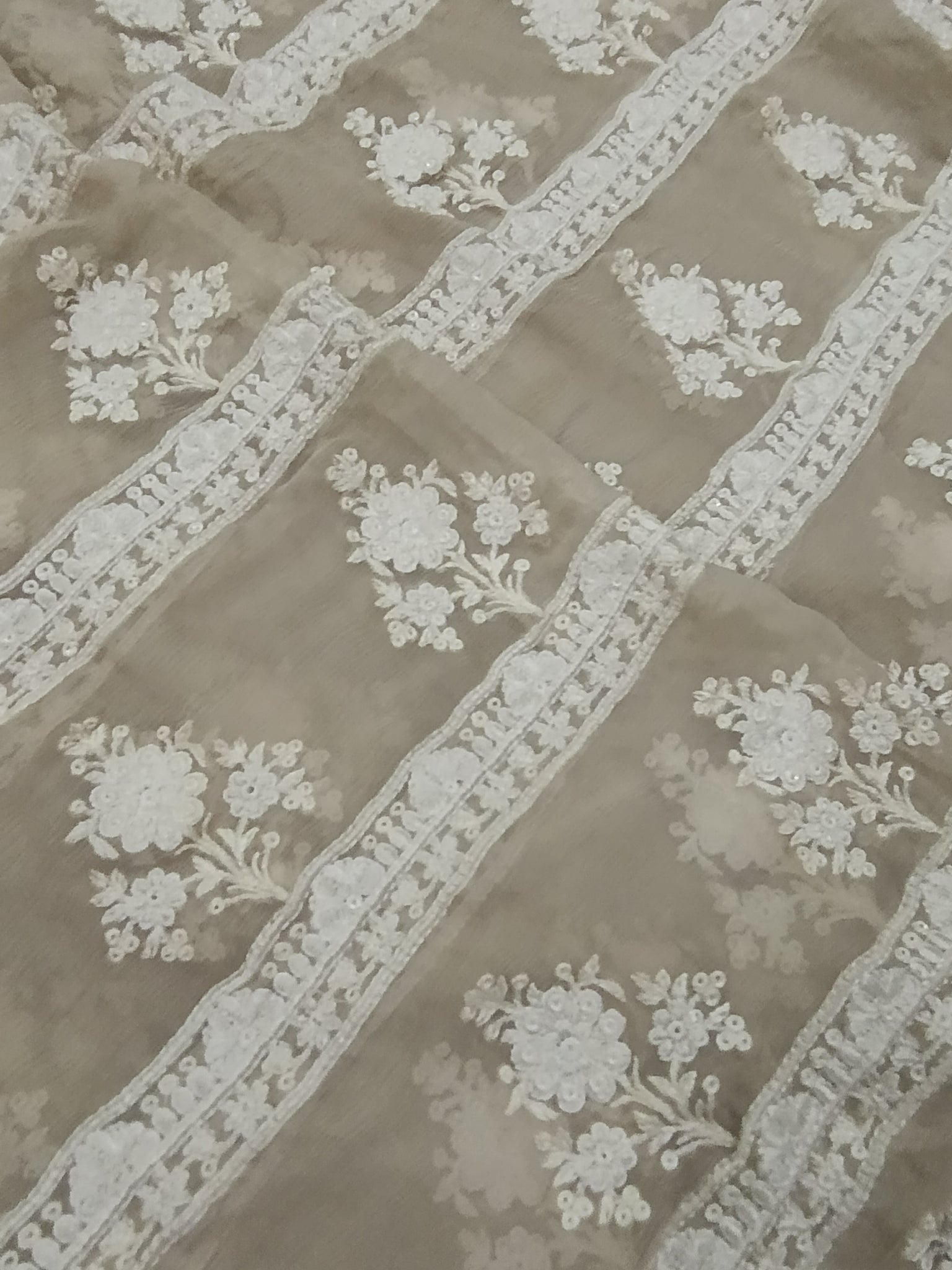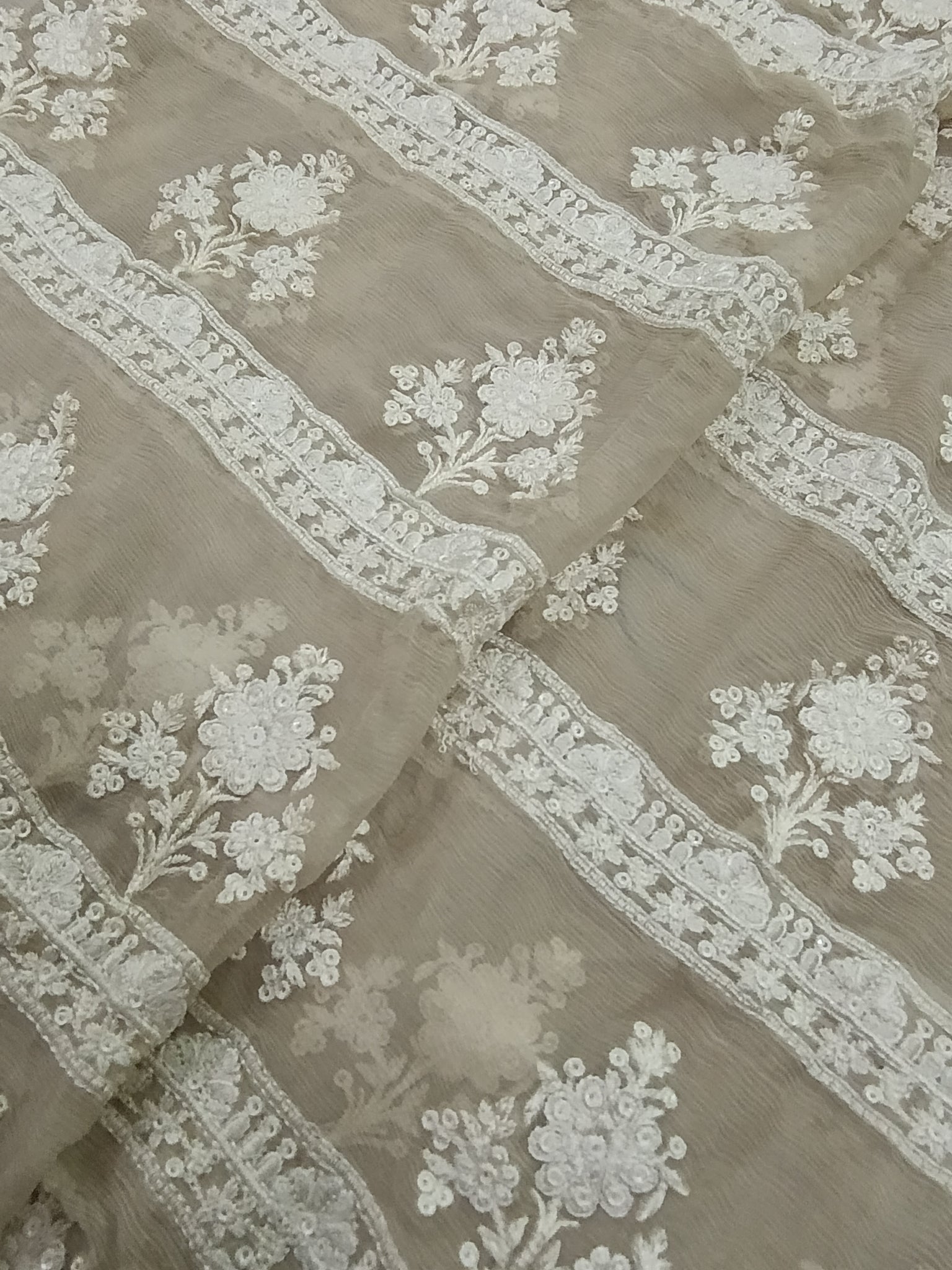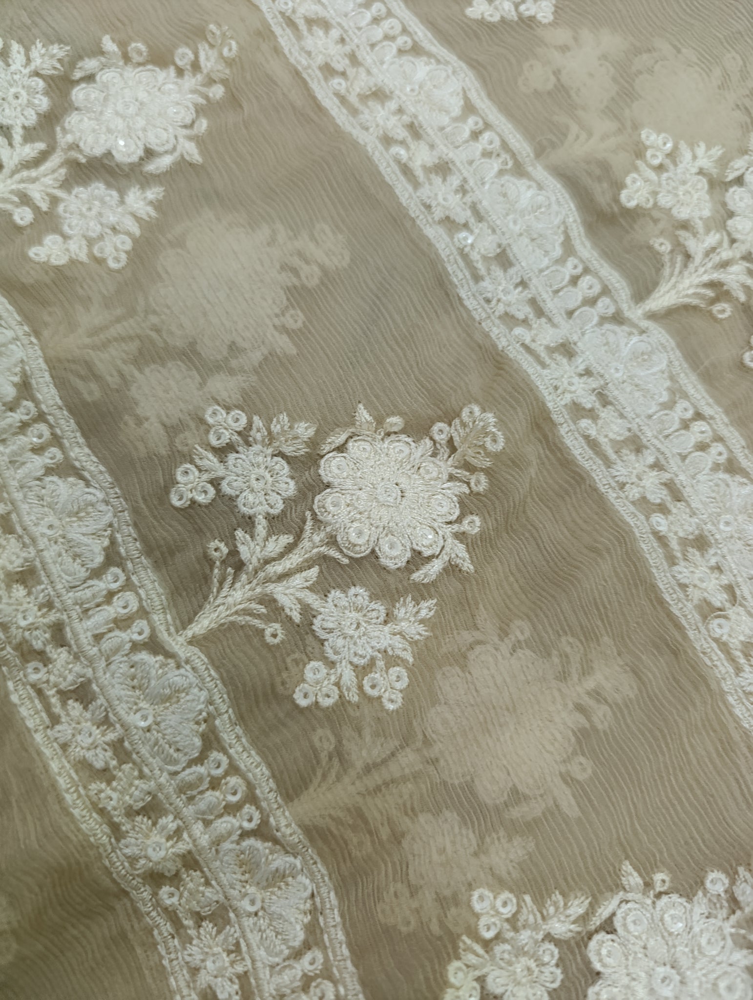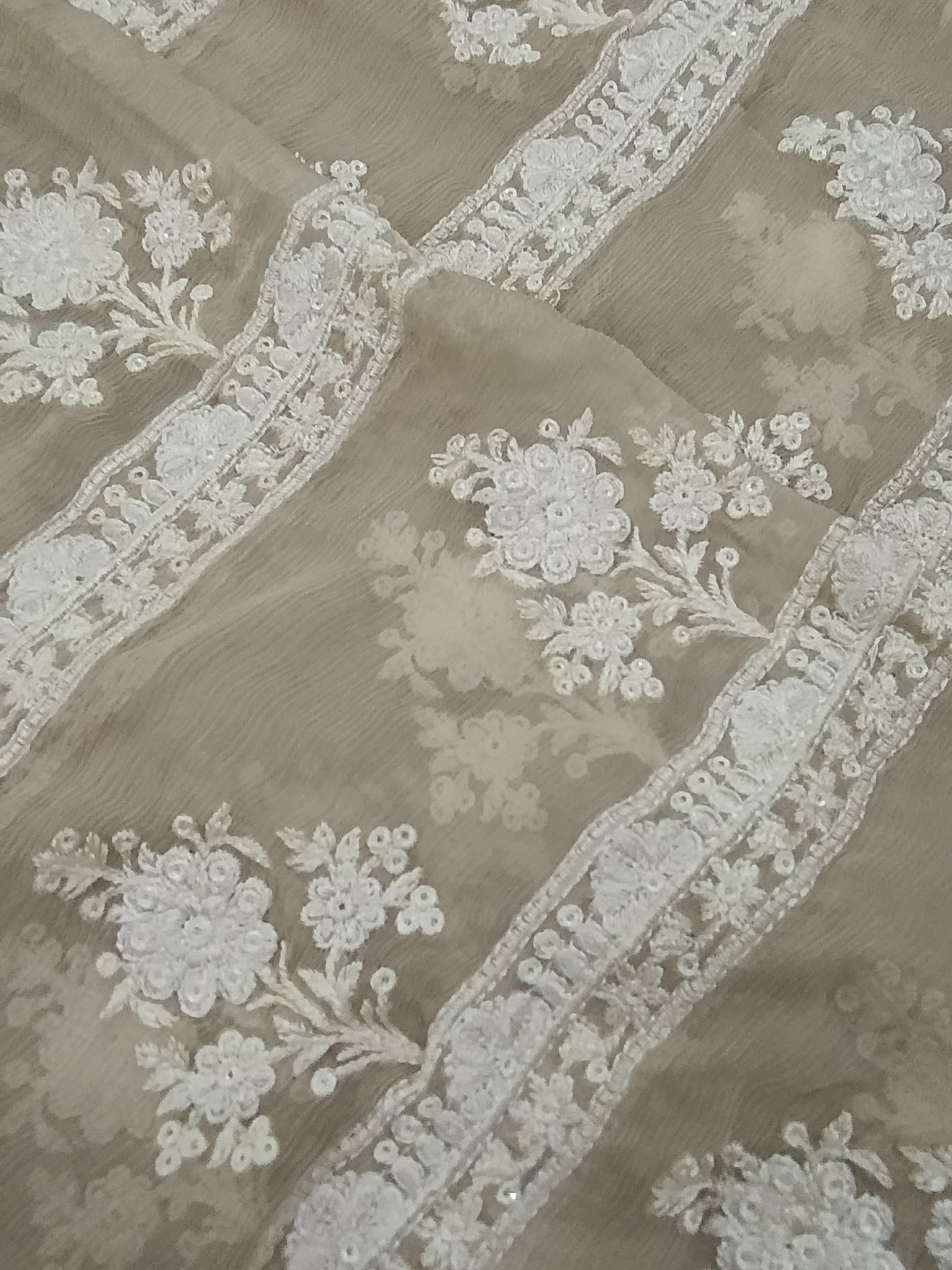 Heavily white thread embroidered white sequins embellishments on pure chiffon fabric.