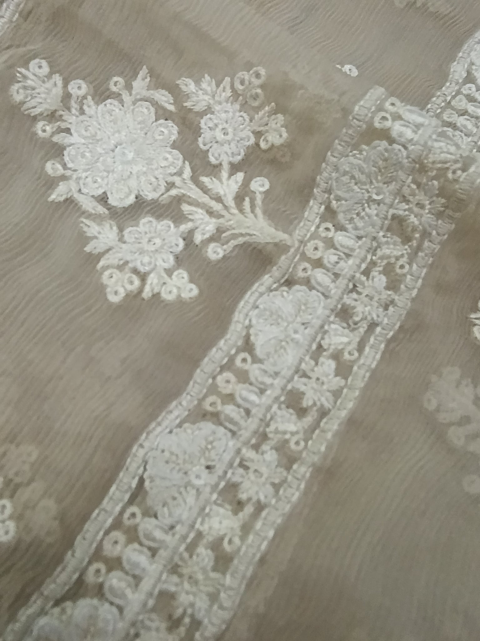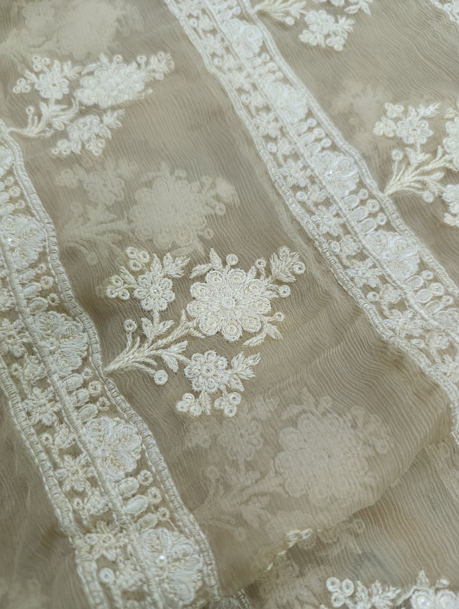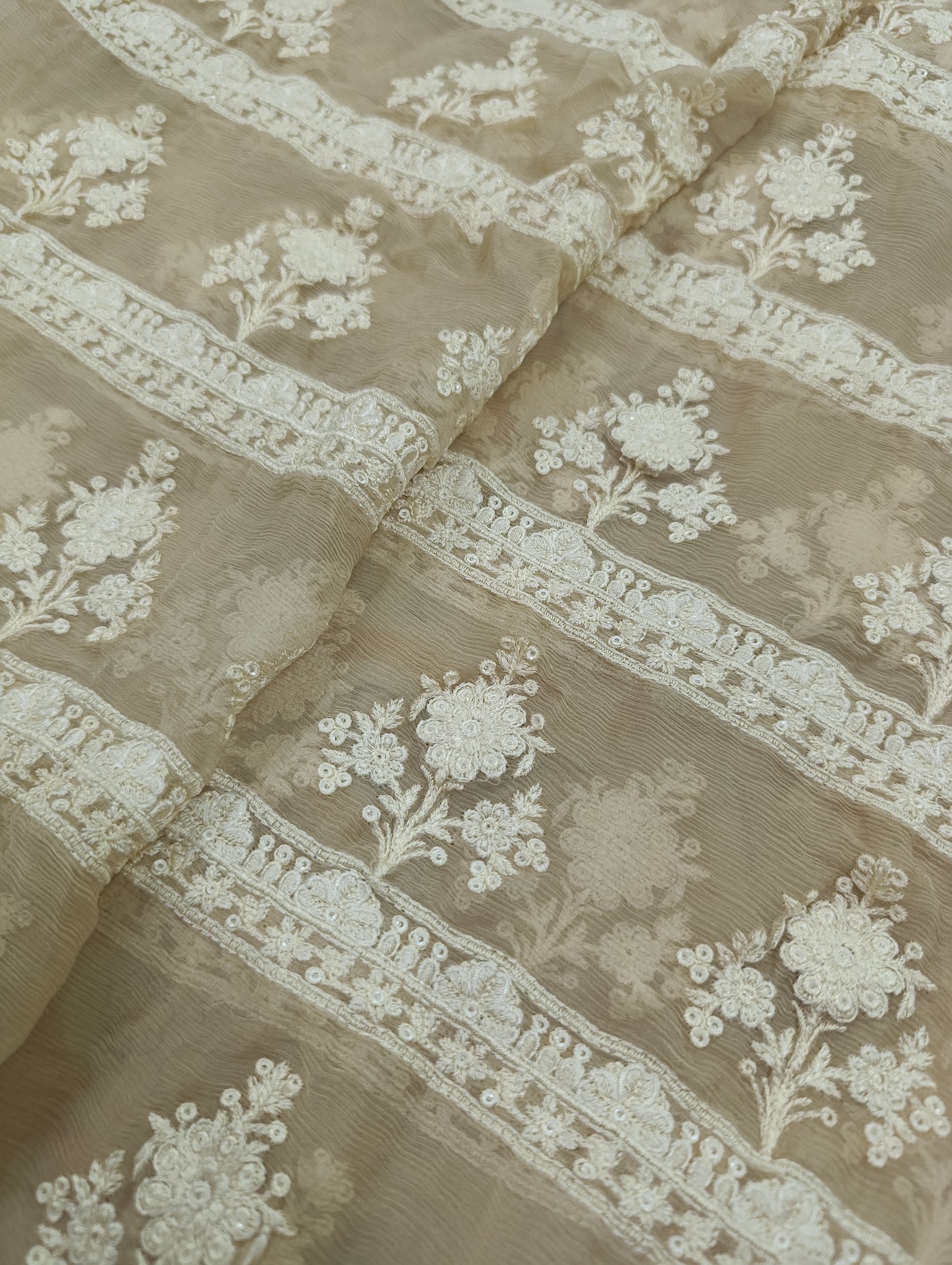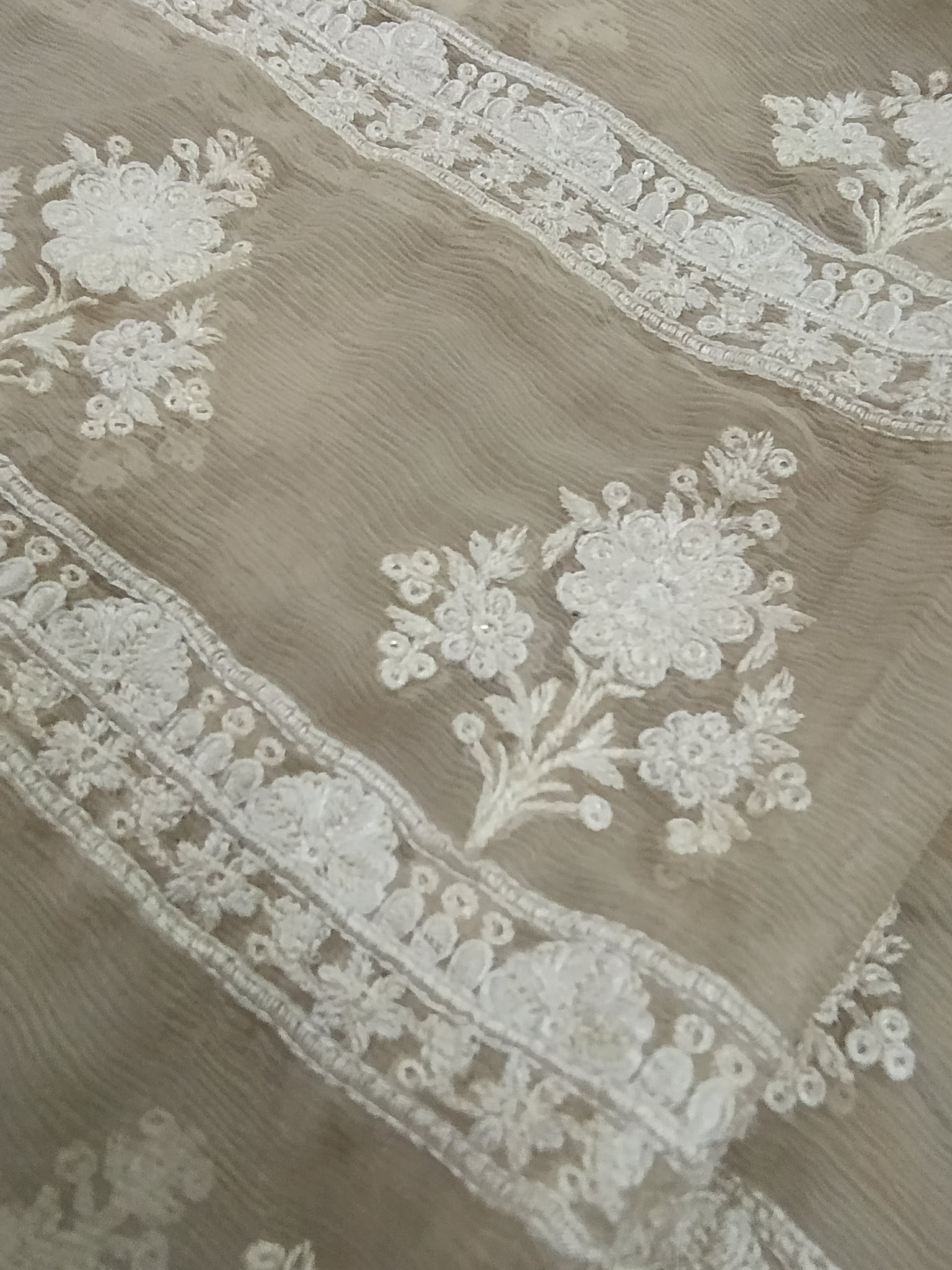 Heavily white thread embroidered white sequins embellishments on pure chiffon fabric.