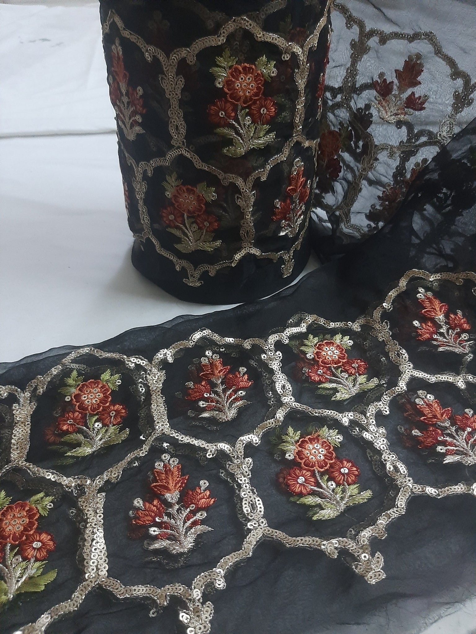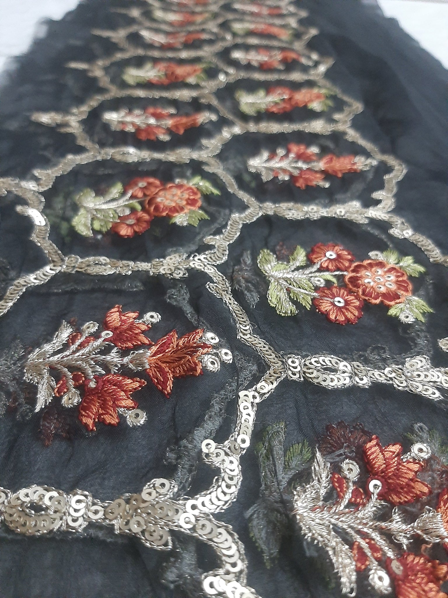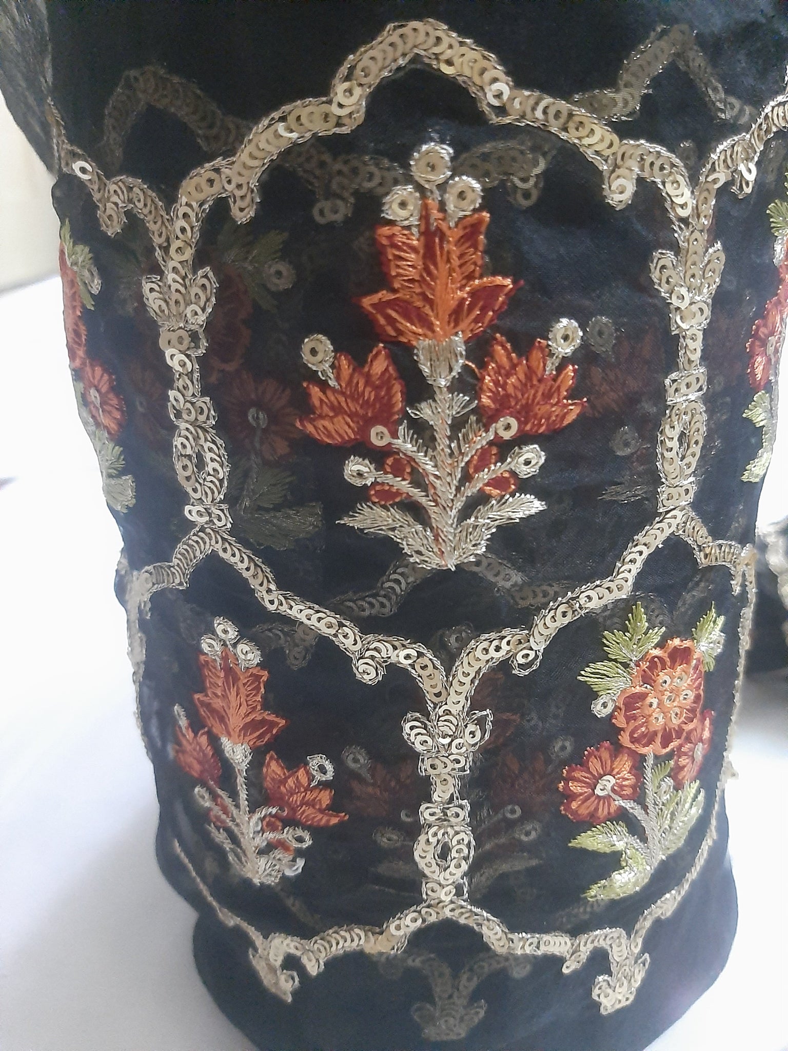 Fully thread with golden tilla embroidered and golden sequins embellishment.