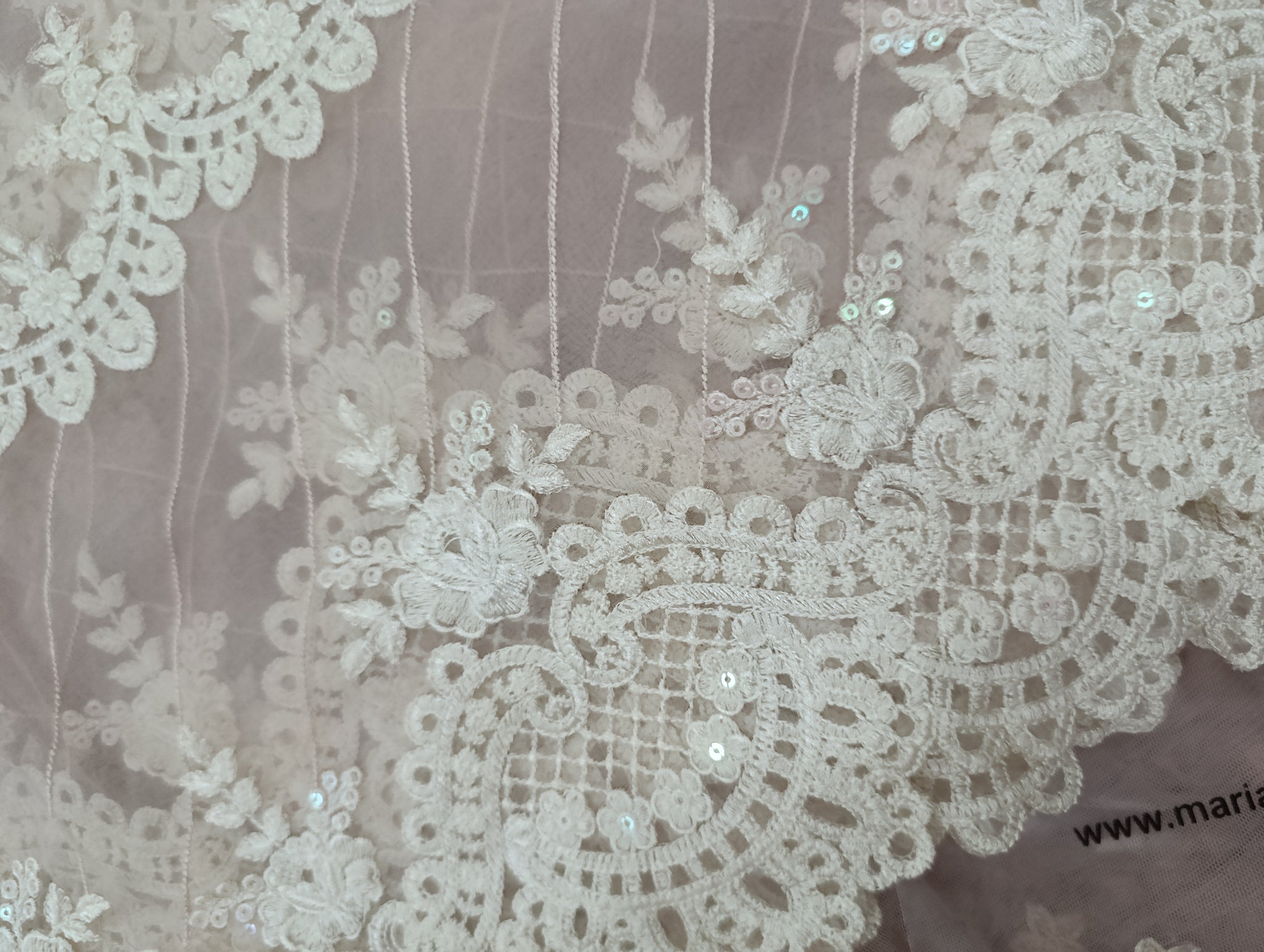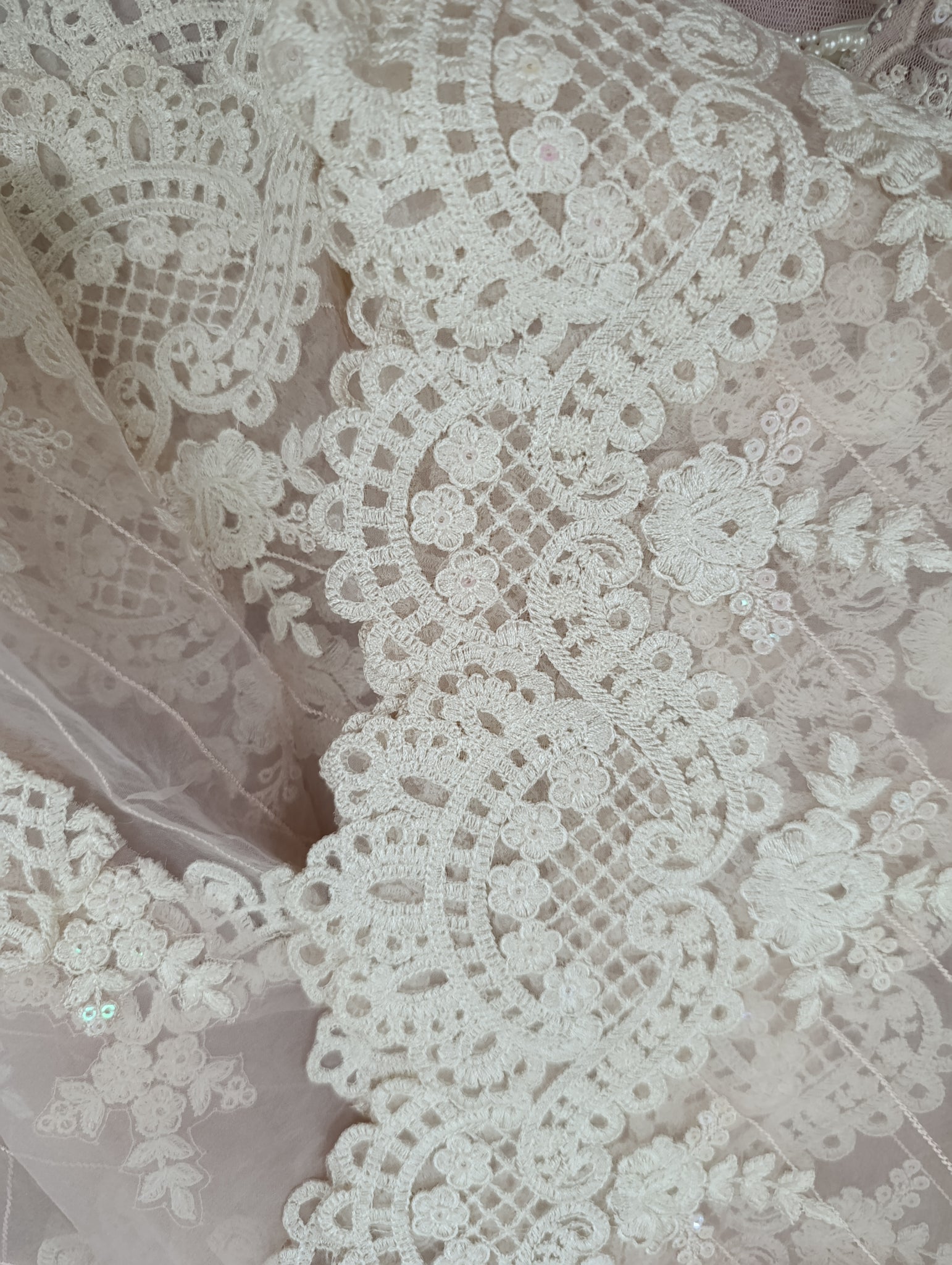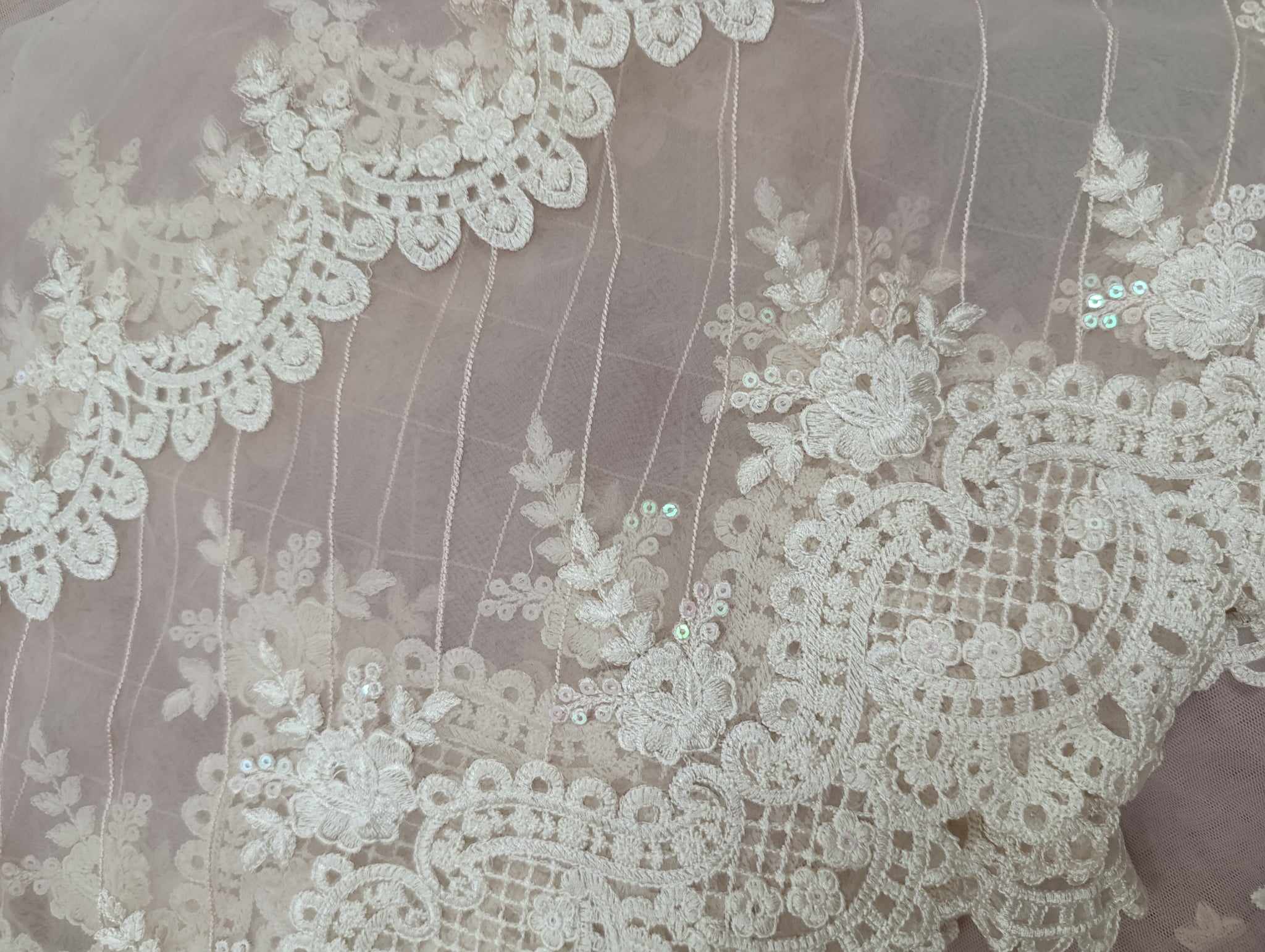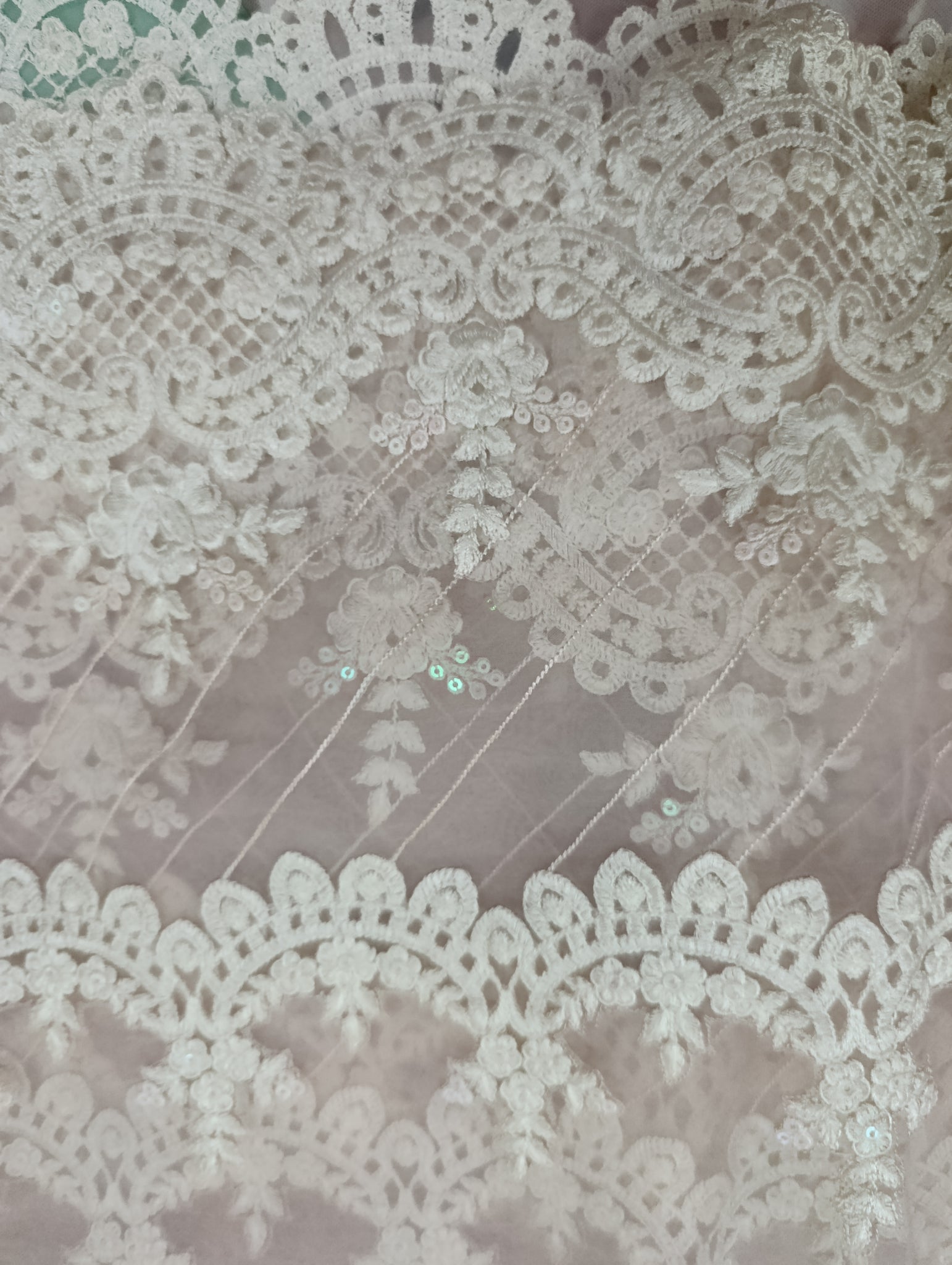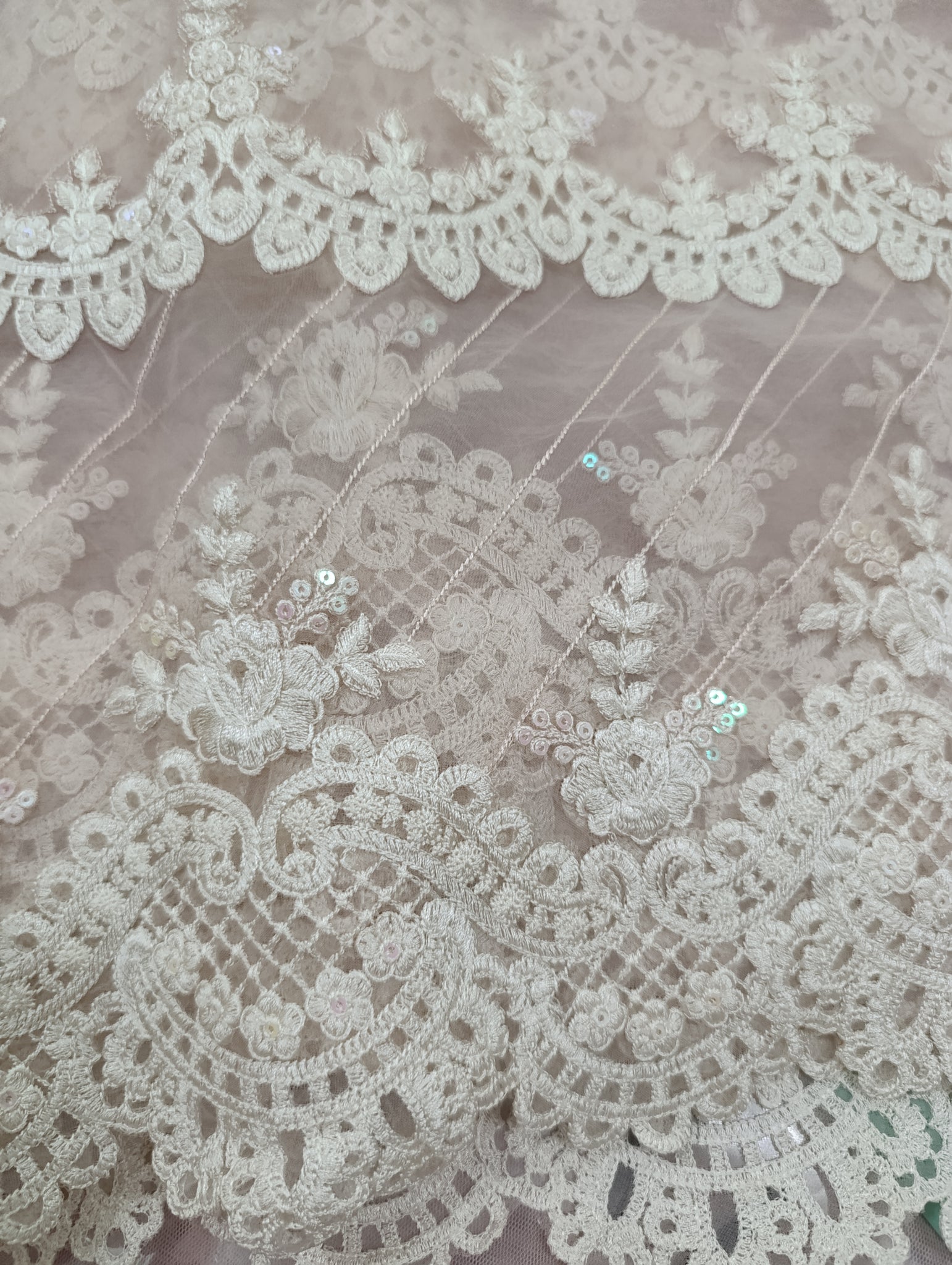 Heavily thread embroidered with watery sequins embellishment double patch centerly designed with diagonal thread embroidered lines. Last border is ready or cutwork in Scalope designing.