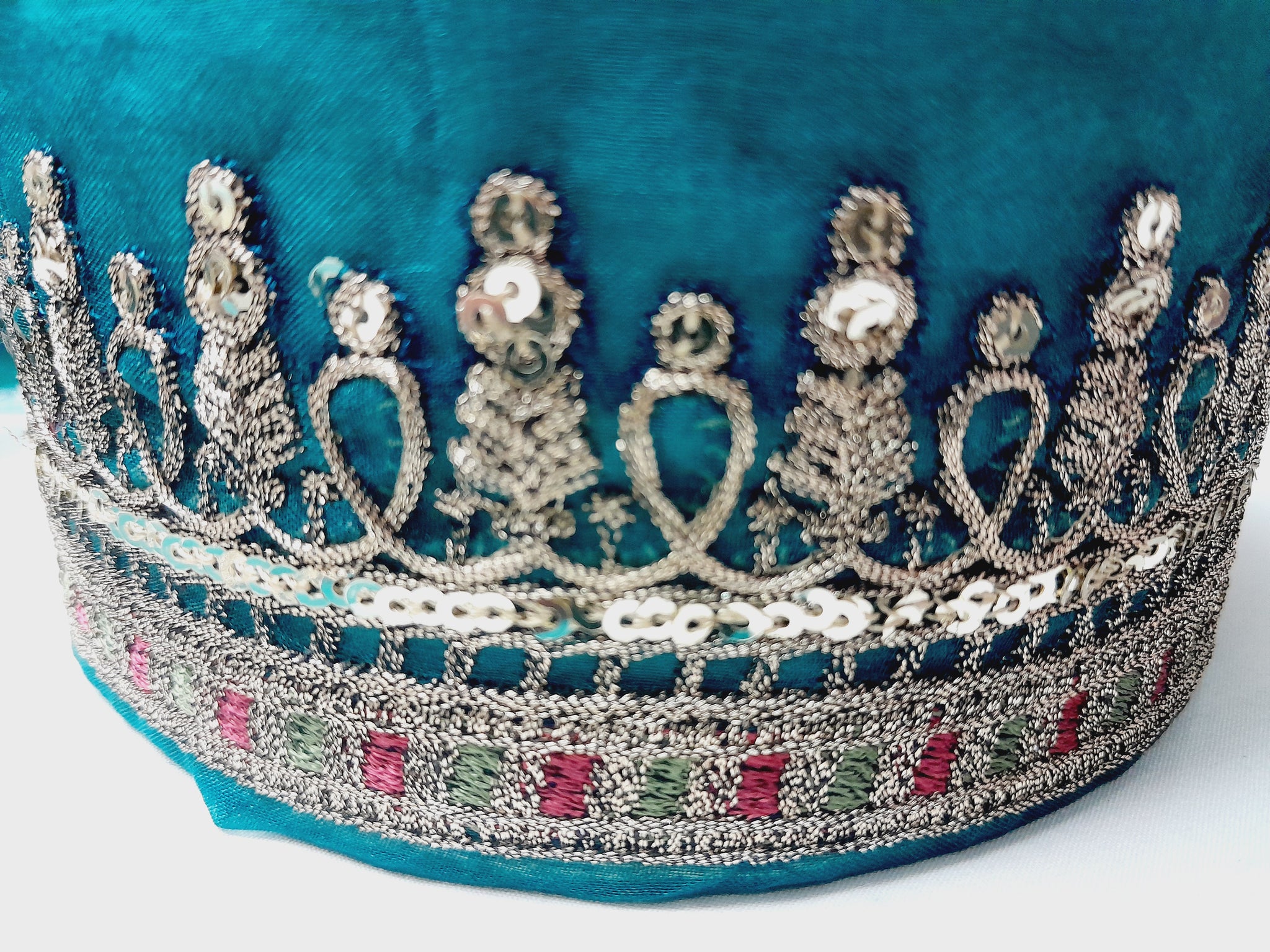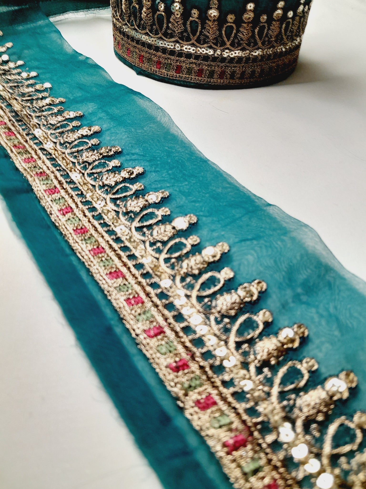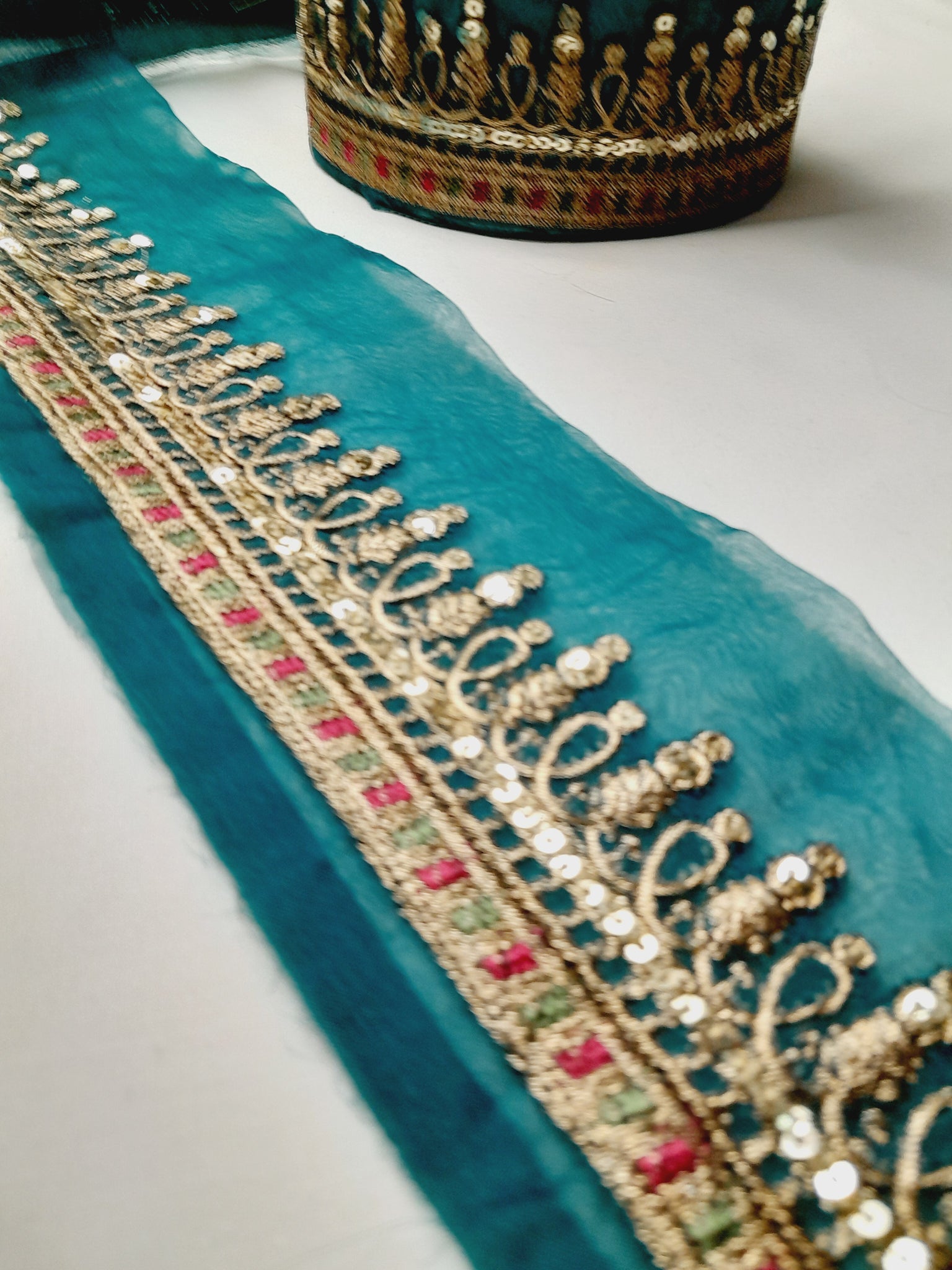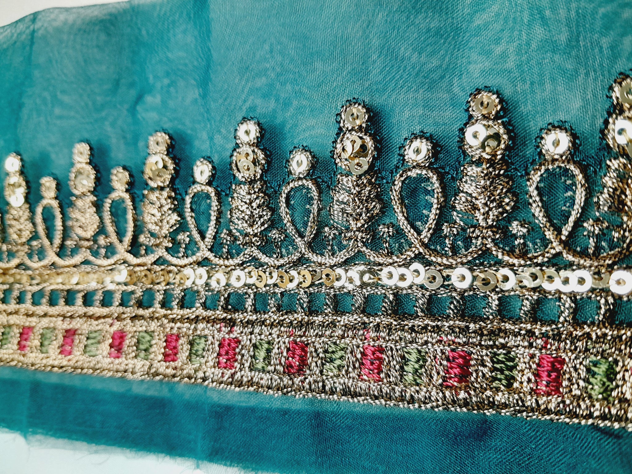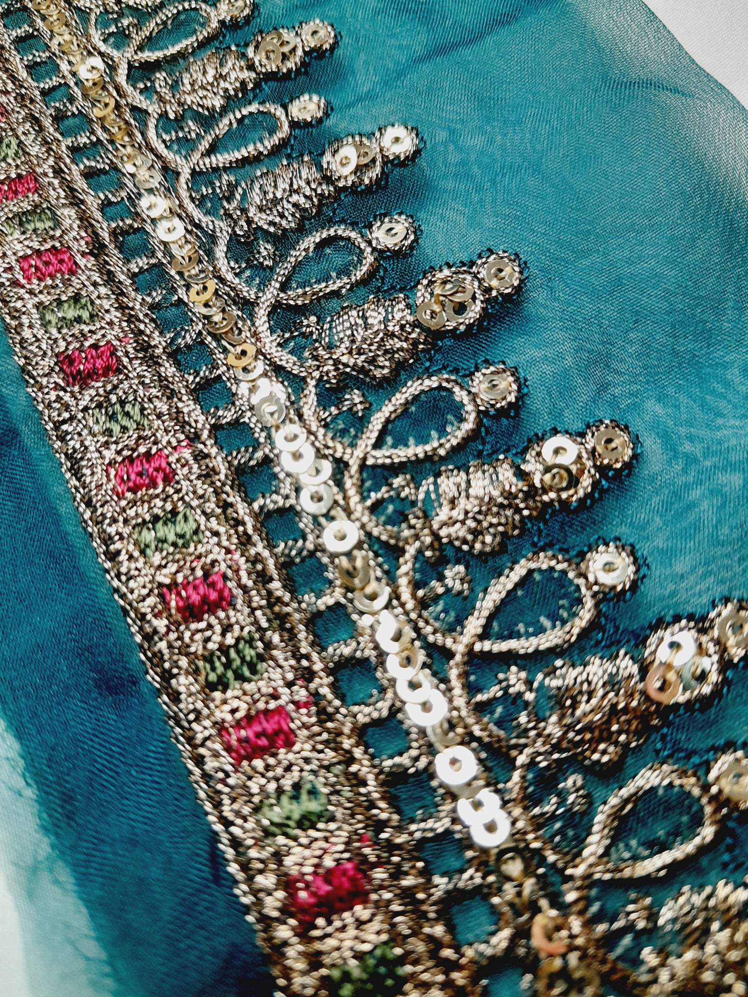 Fully thread and copper gold tilla embroidered with light golden sequins embellishment.