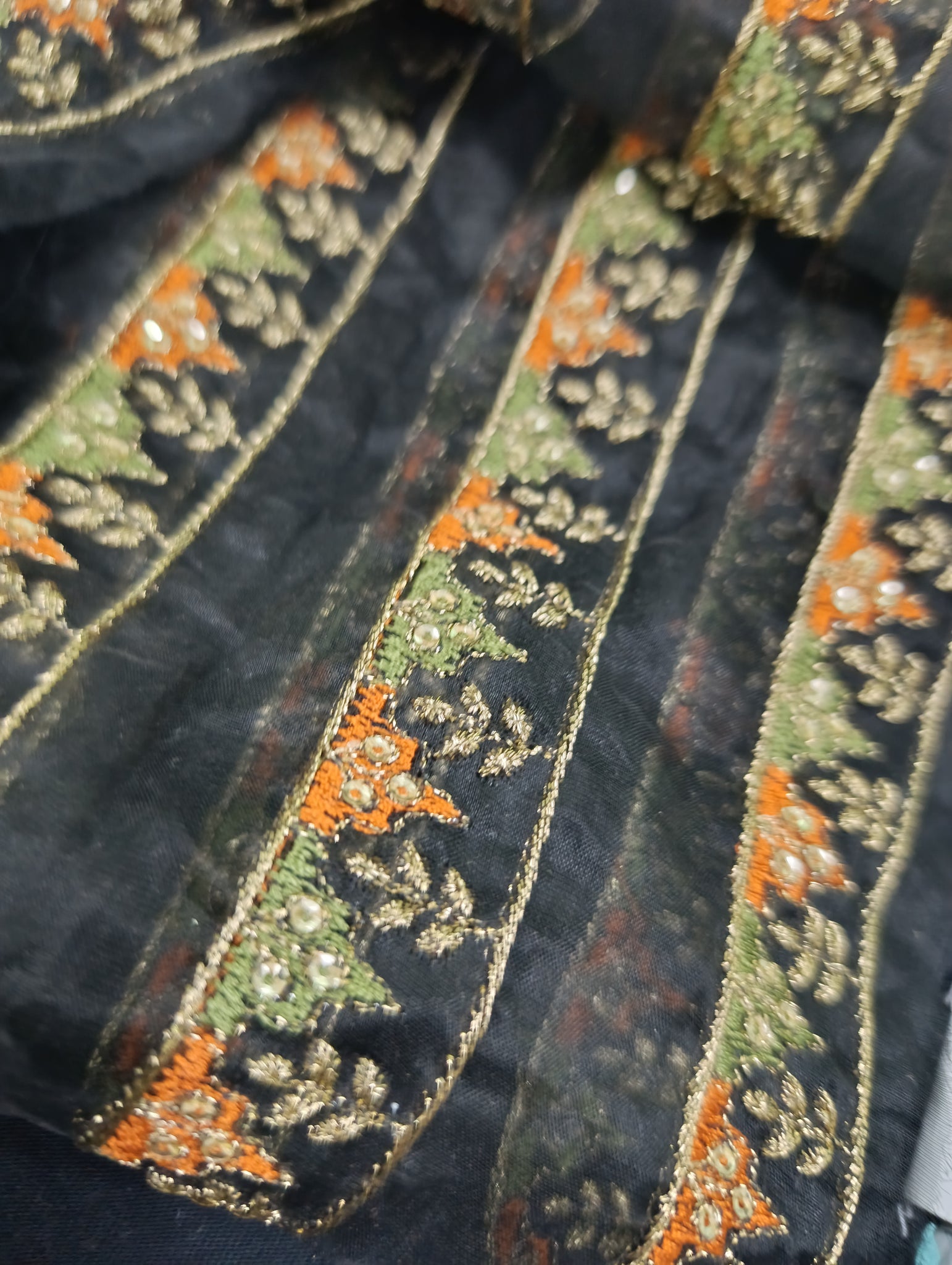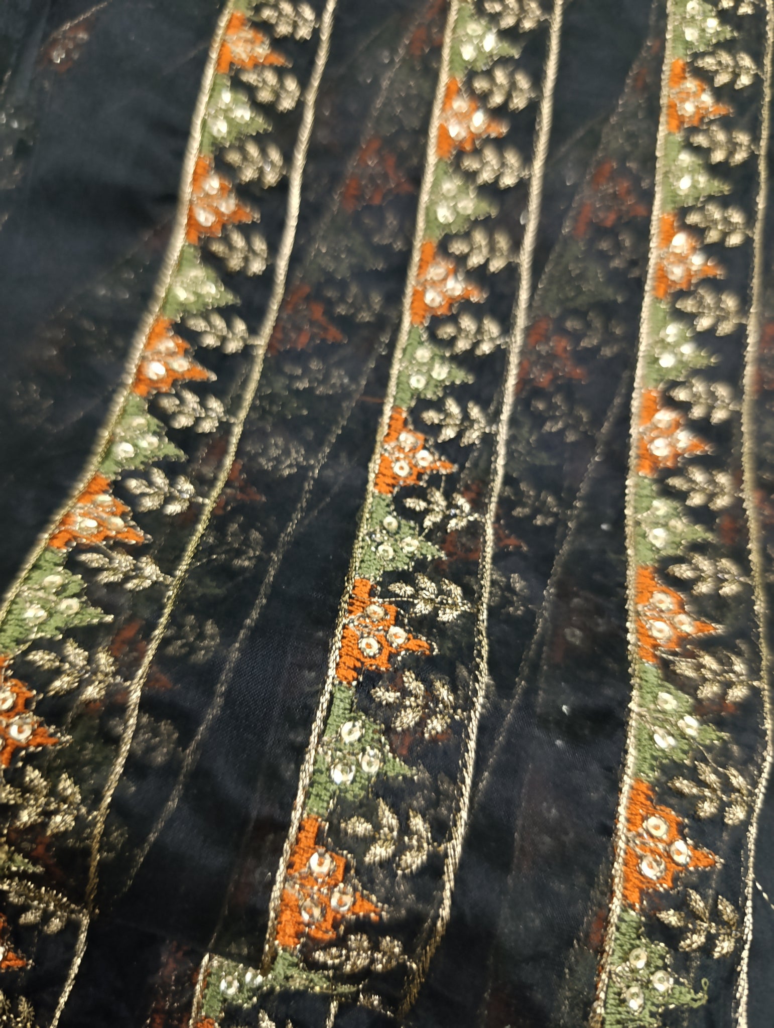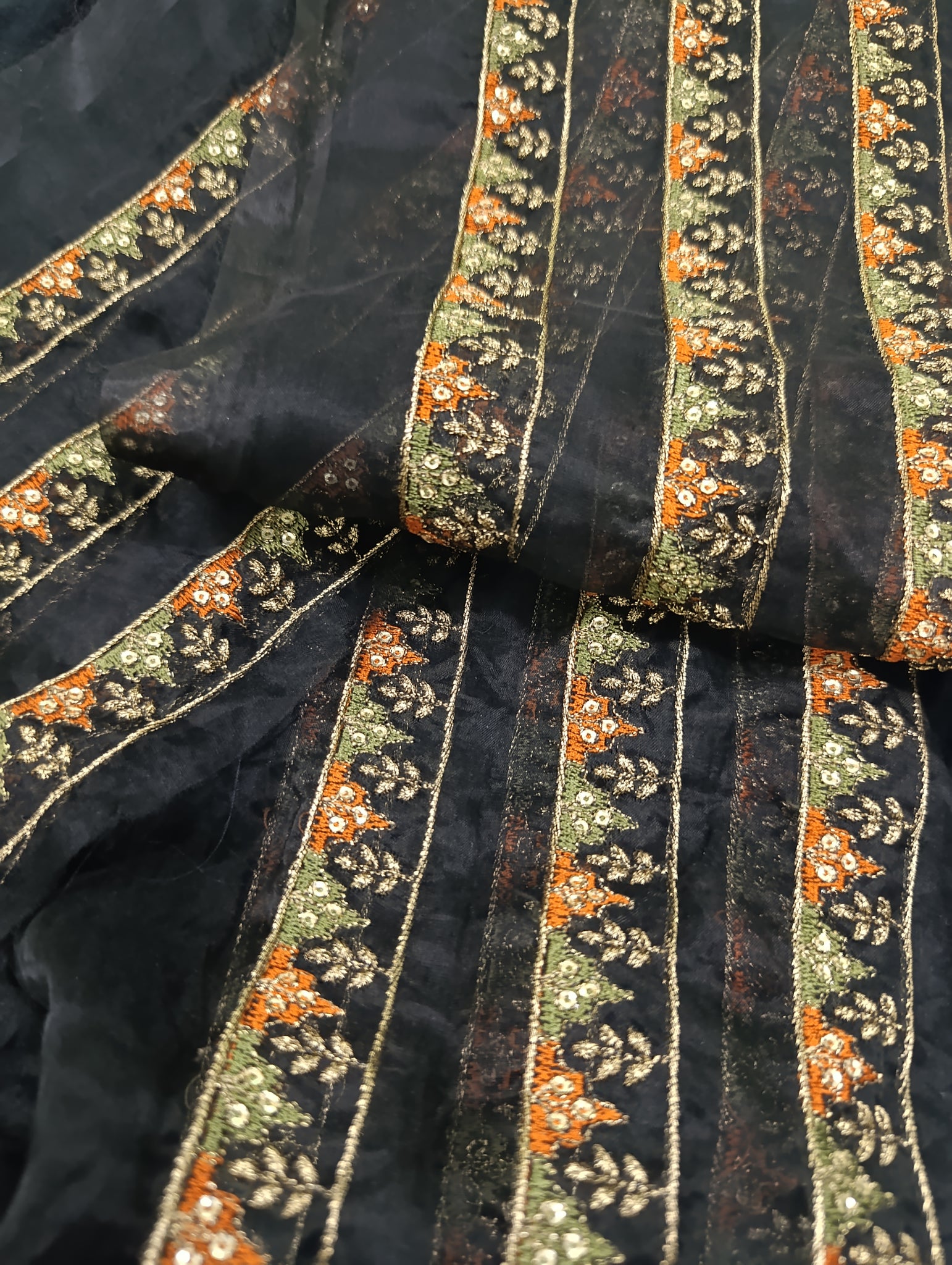 Fully thread and copper gold tilla embroidered with light golden sequins embellishments in chatta Patti triangle shape designing and floral embroidery too.