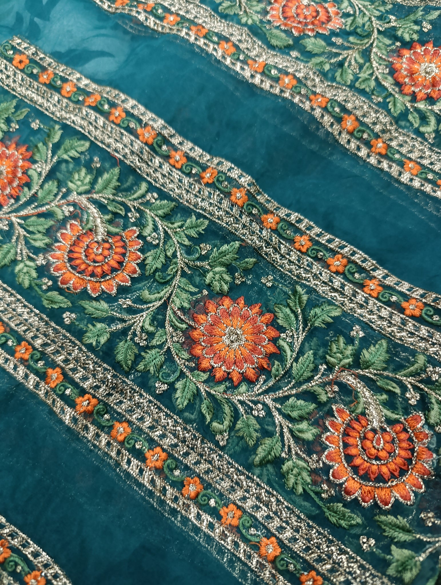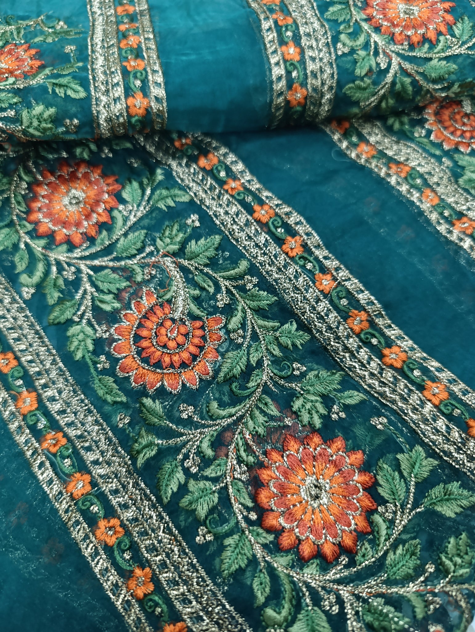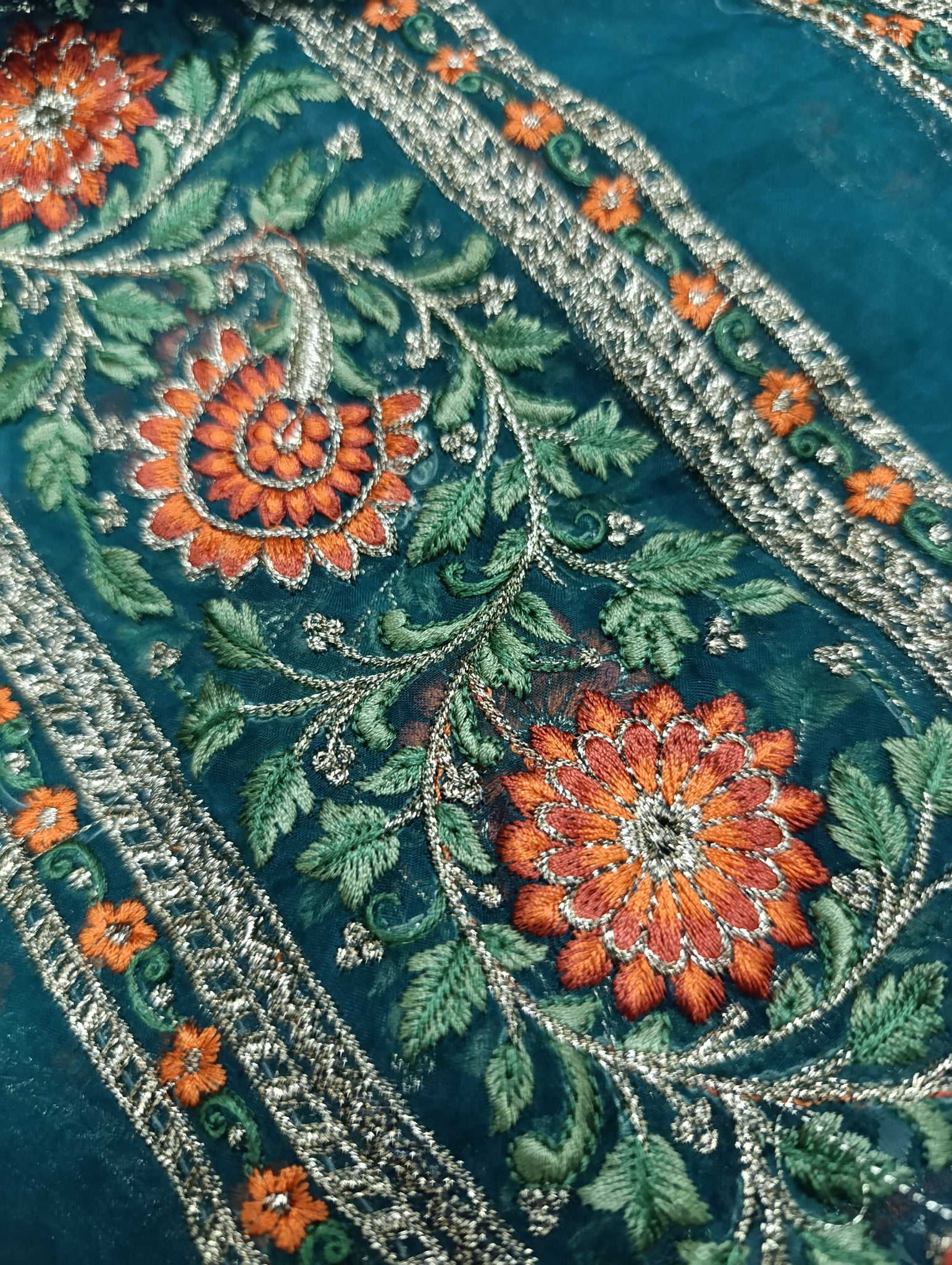 Heavily thread and copper gold tilla embroidered.