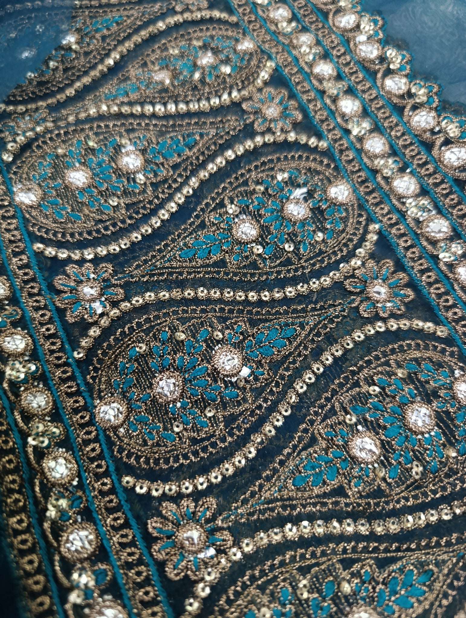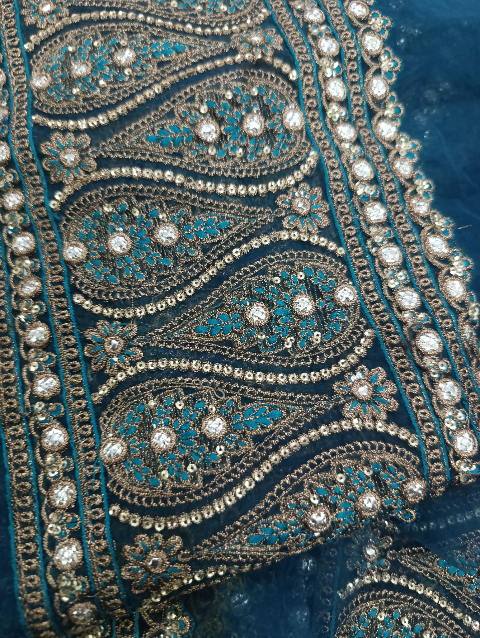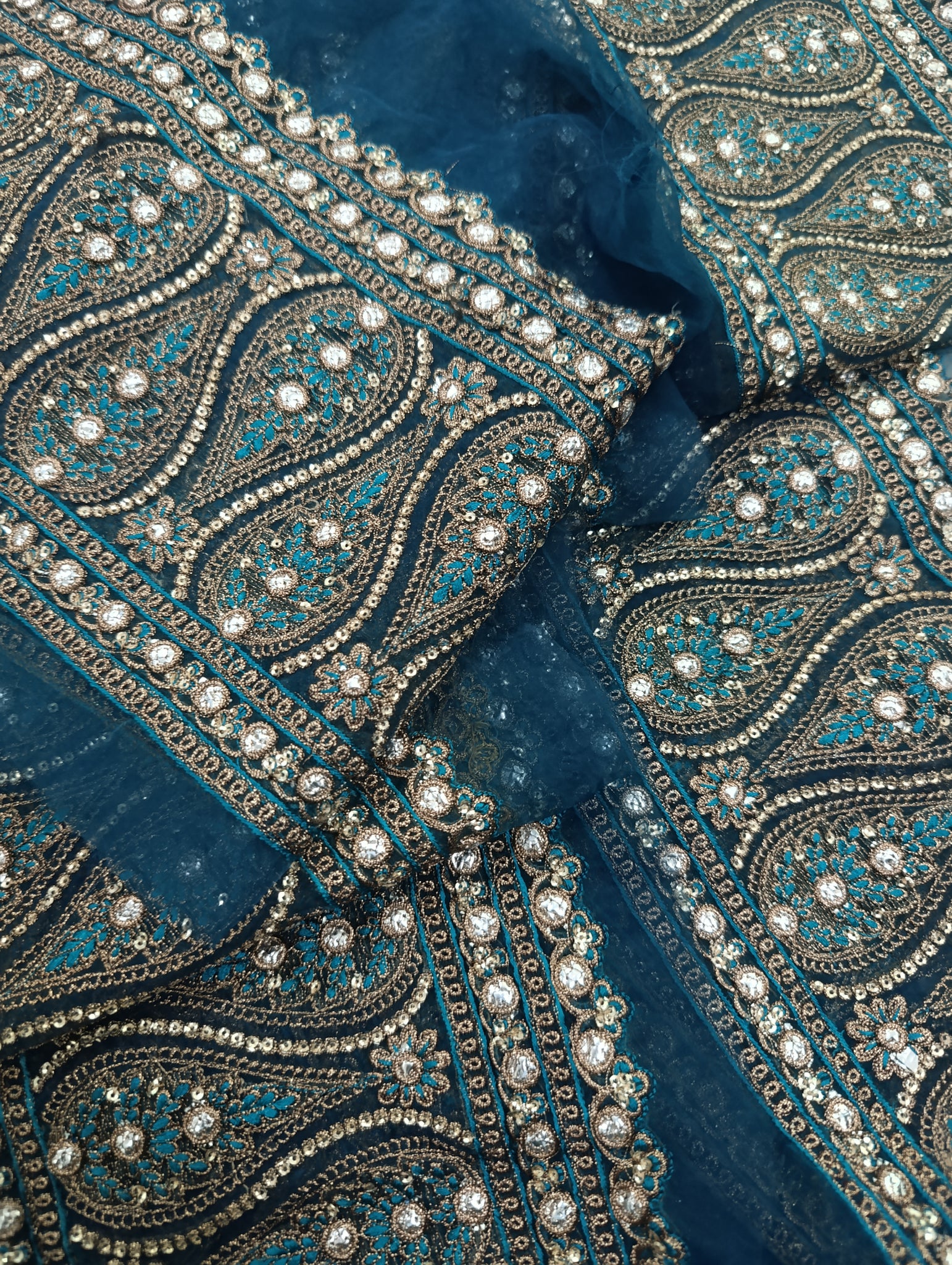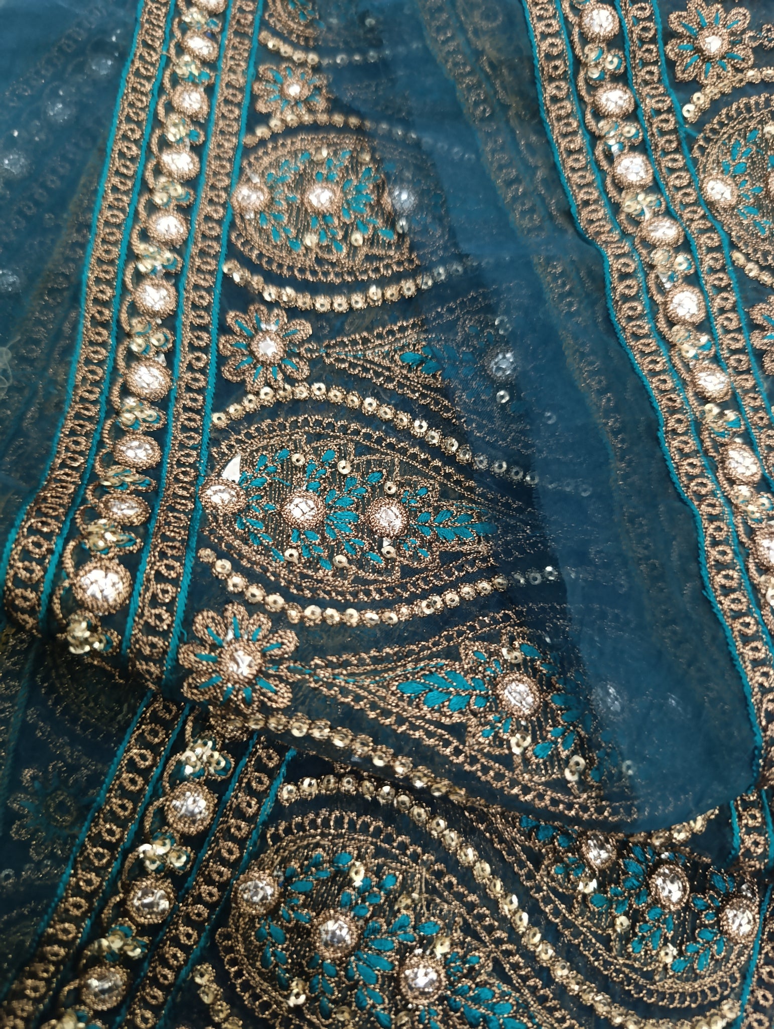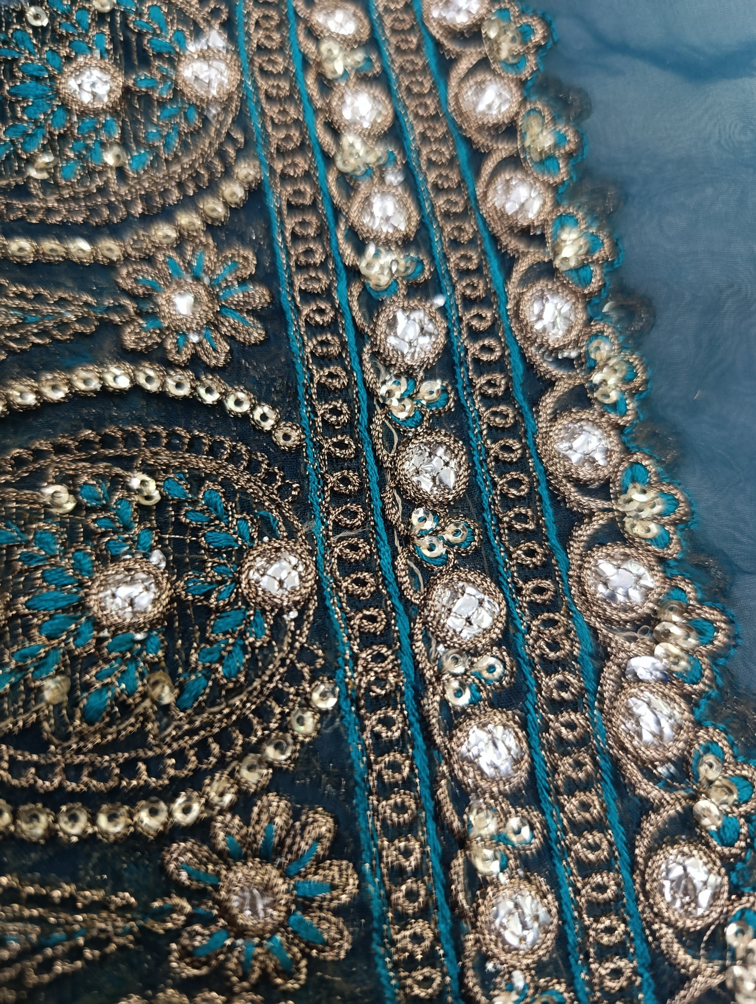 Fully thread and copper gold tilla embroidered with golden sequins and foilwork embellishelment.