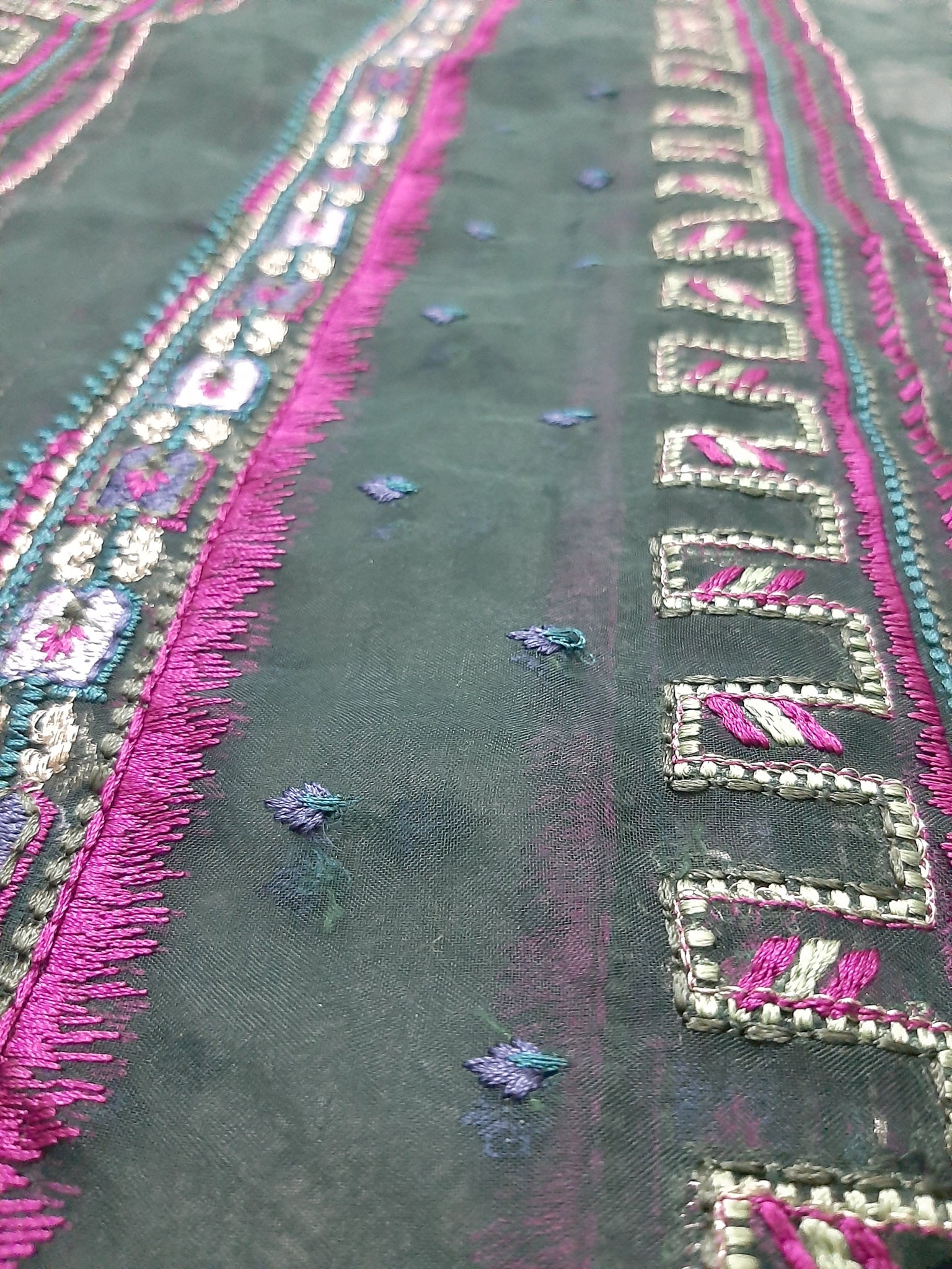 Fully thread and silver tilla embroidered.