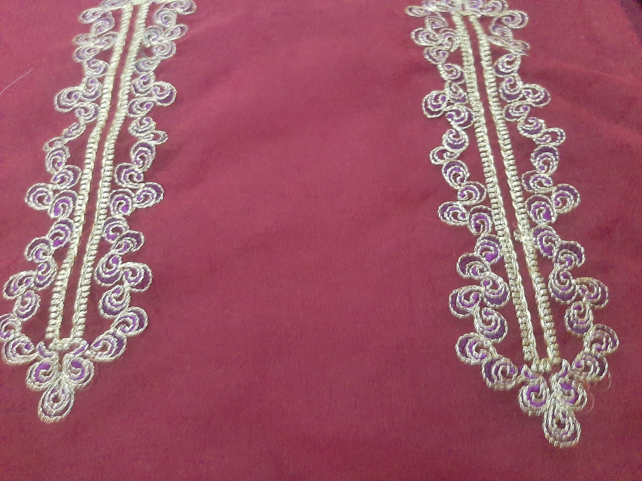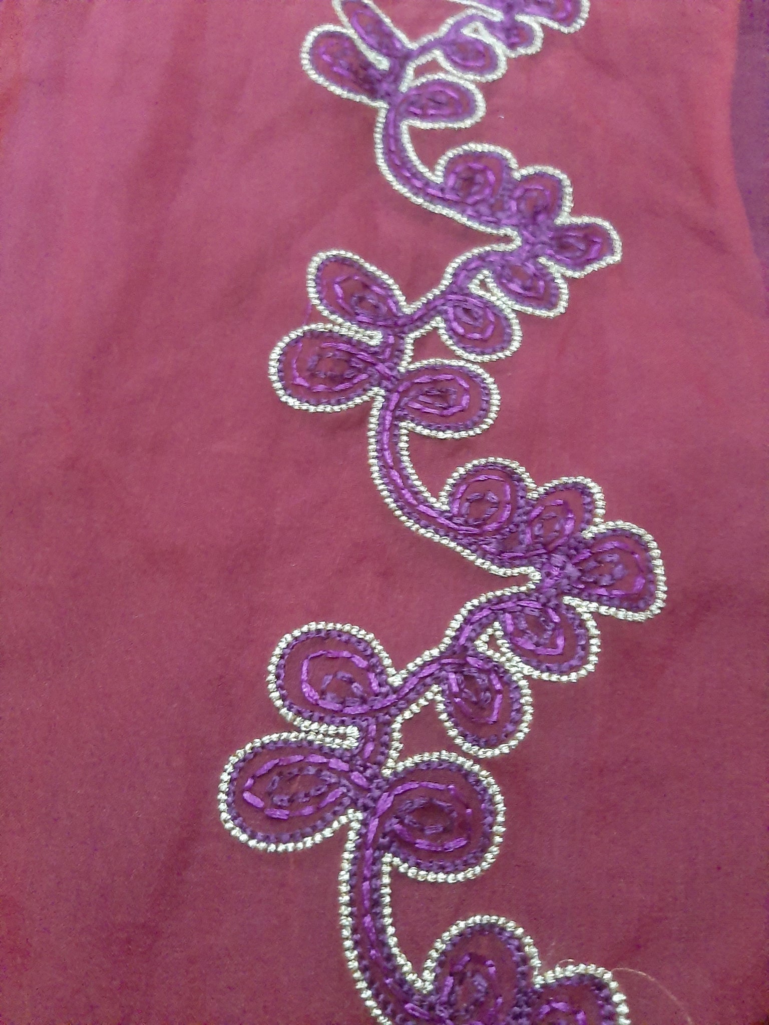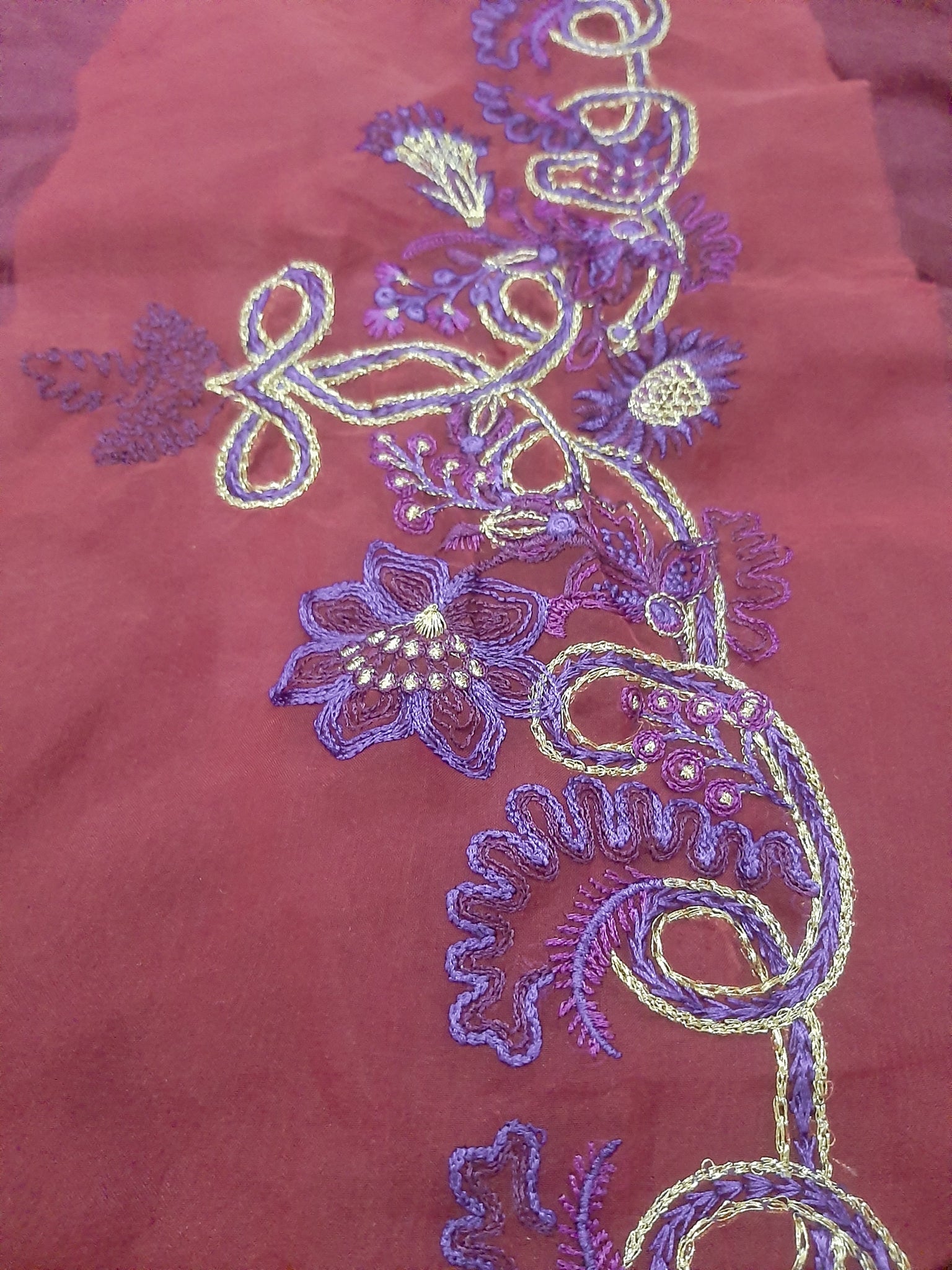 Front: Hem patch on Organza and Daman fornt and back border on silk. Neckline patch on Organza.