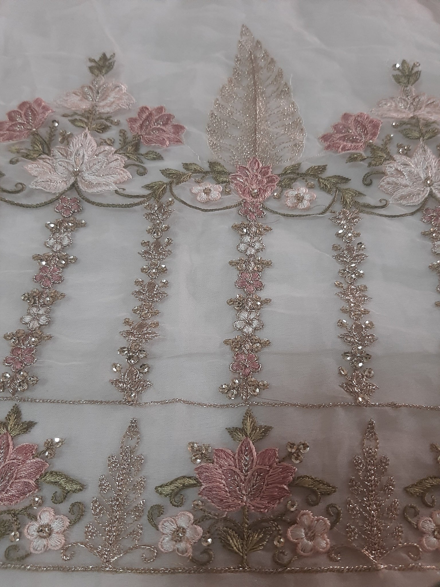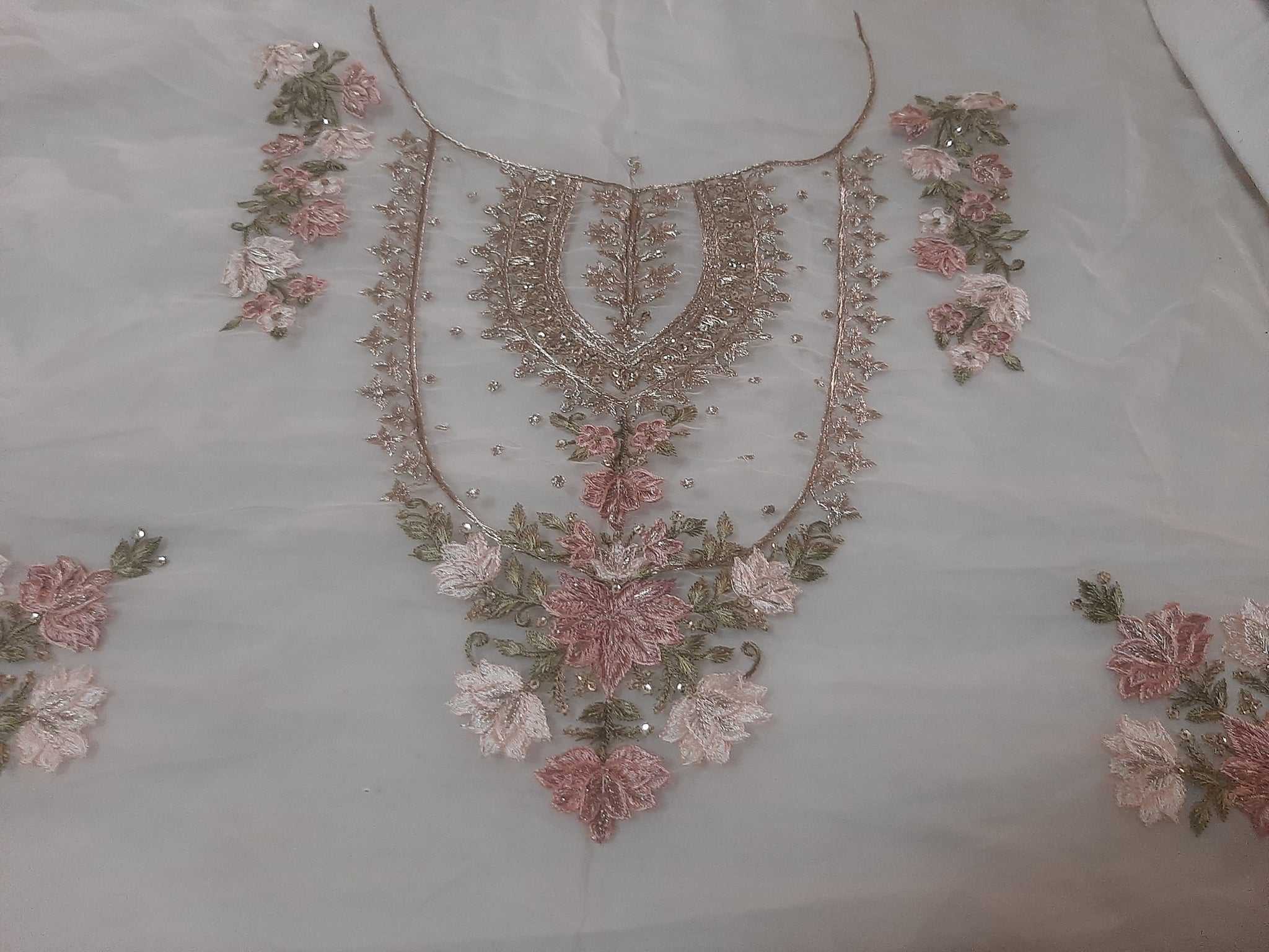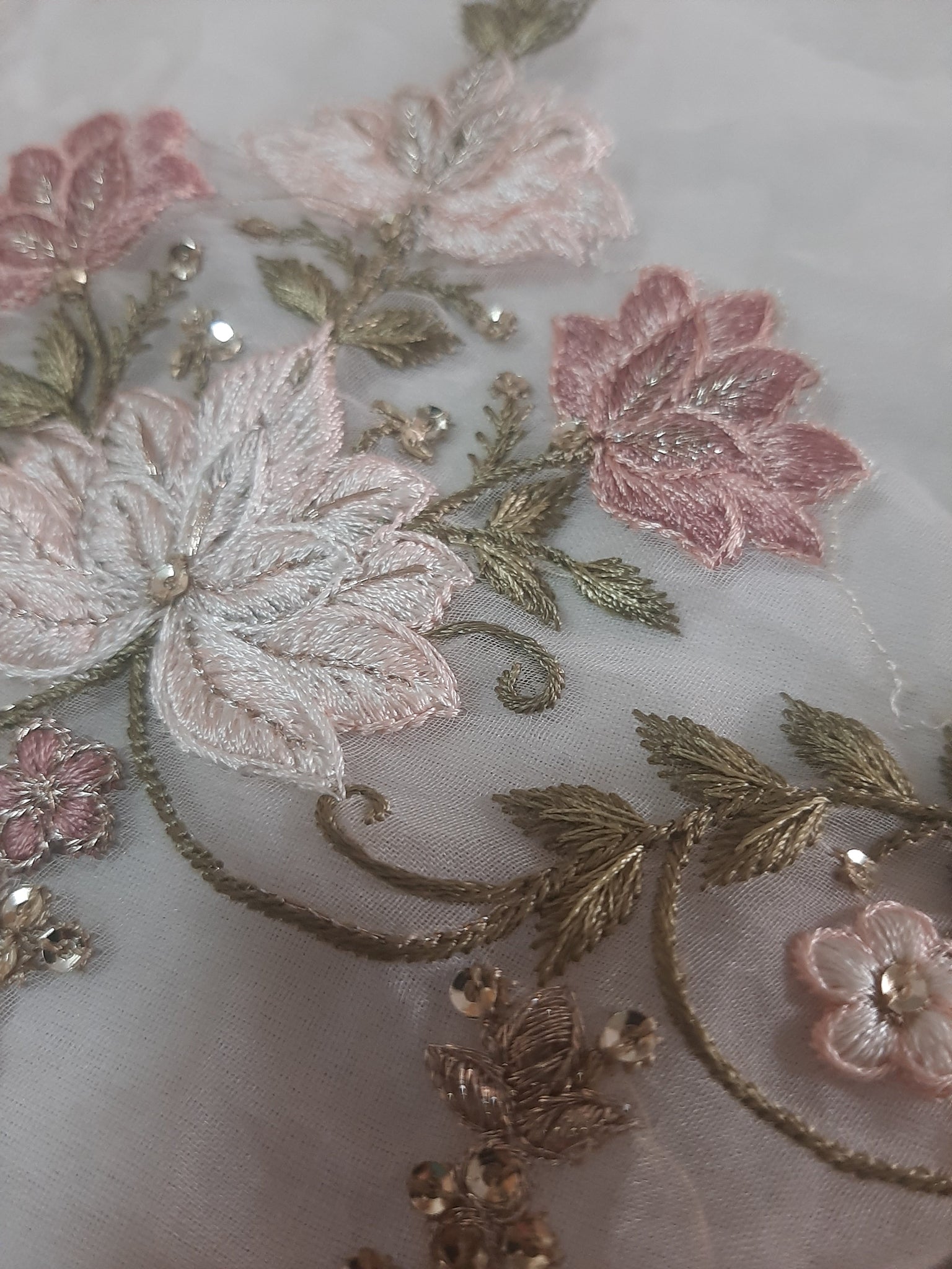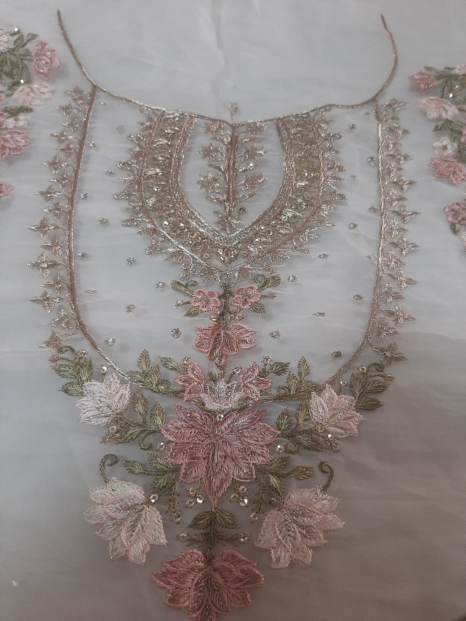 Heavily thread and gold tilla embroidered with sequins embellishment Neckline with side bunches fabric. Length 21 width 19 inches chester.