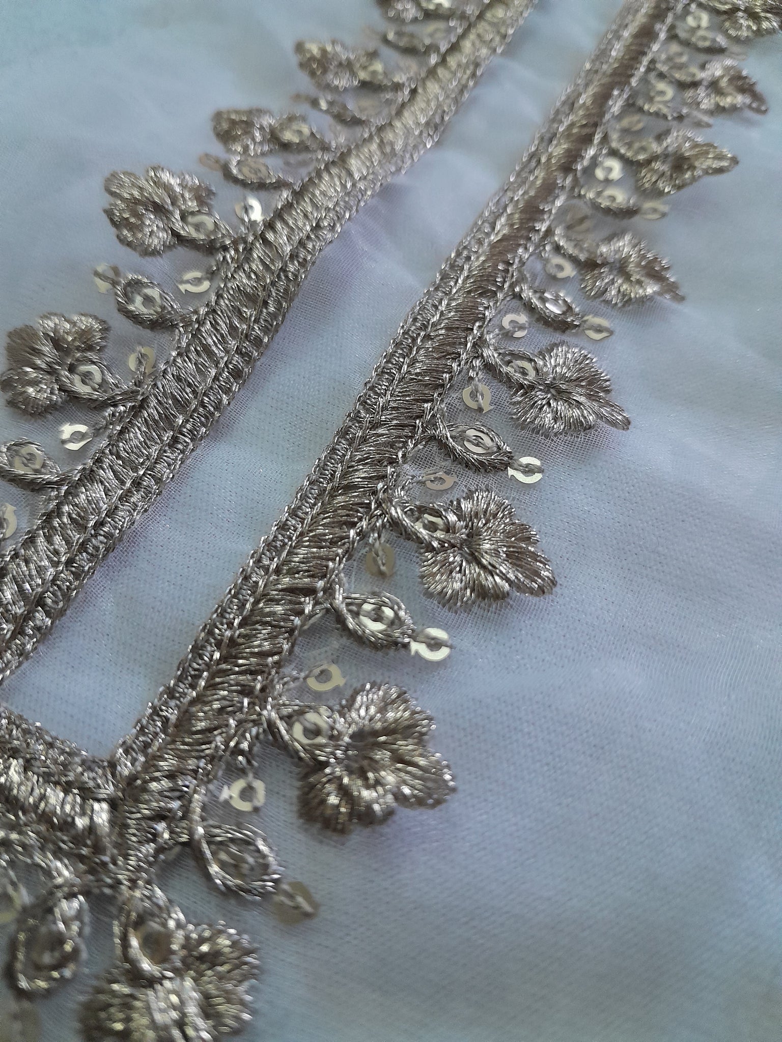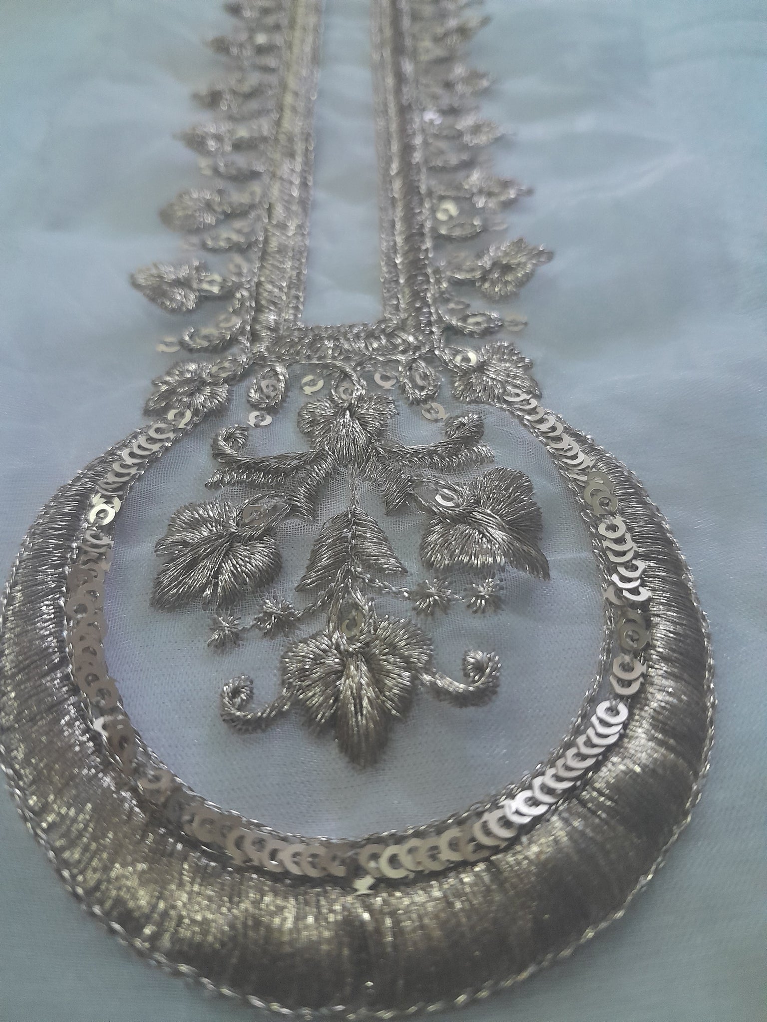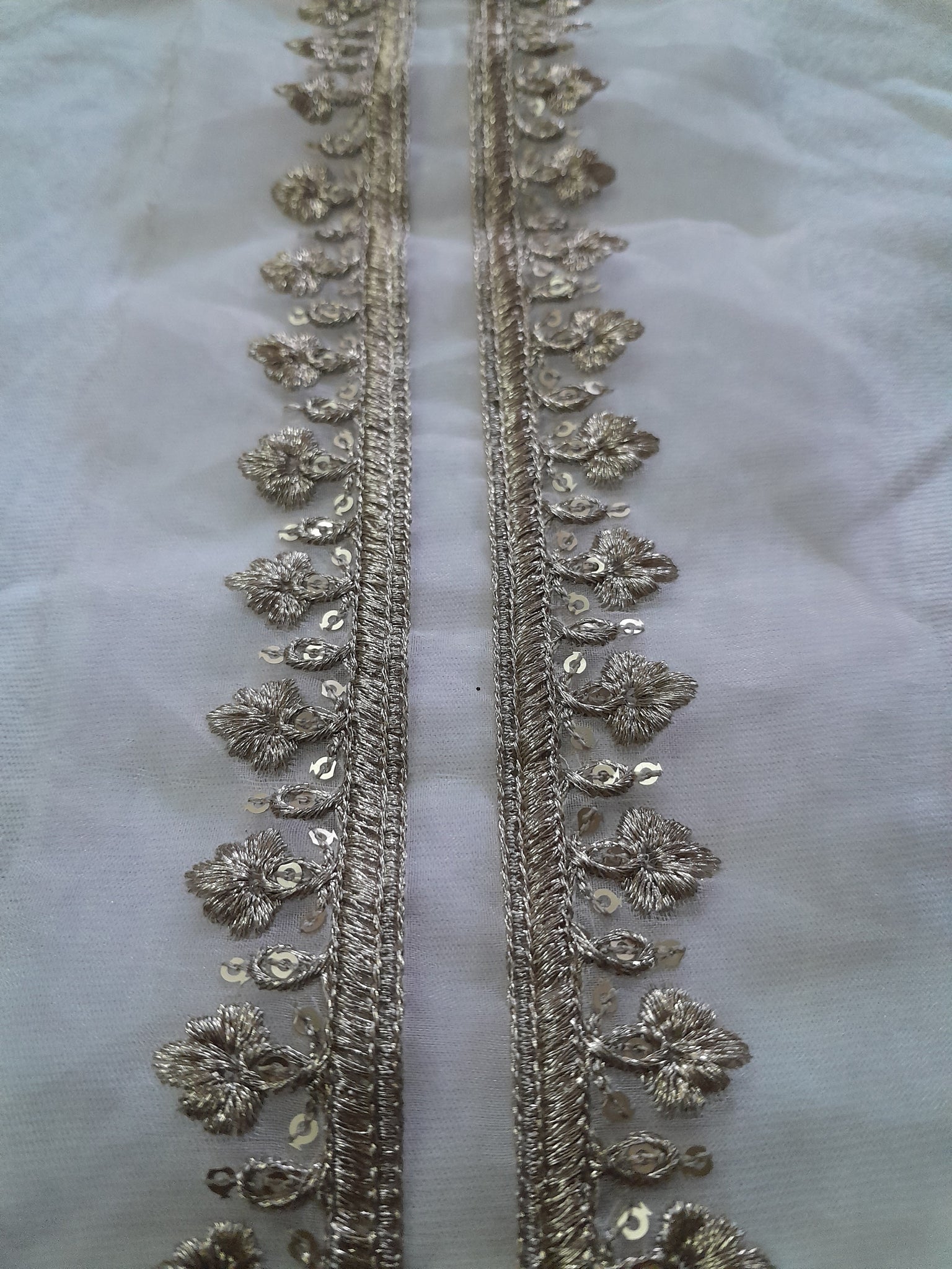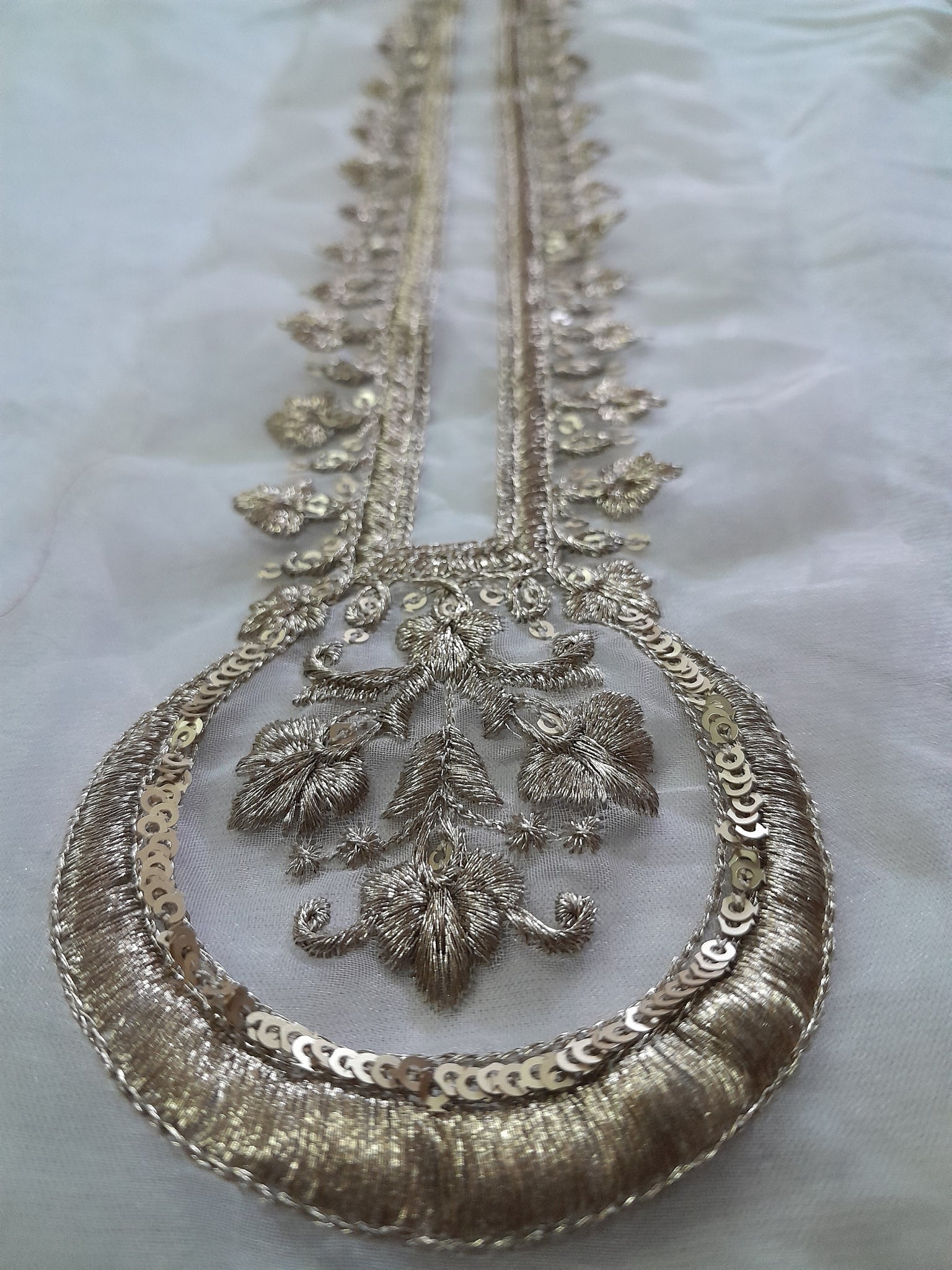 Neckline is heavily golden tilla embroidered with golden sequins embellishment on organza fabric.