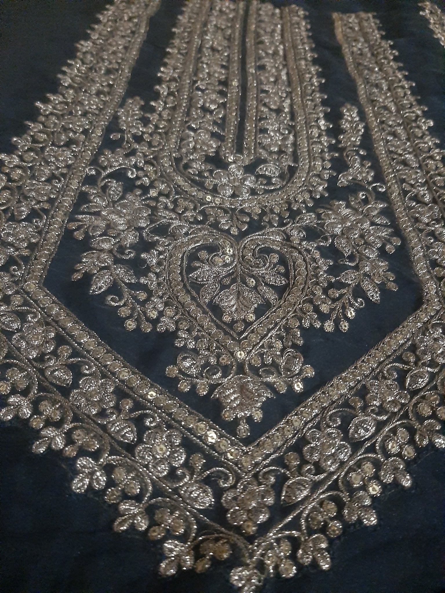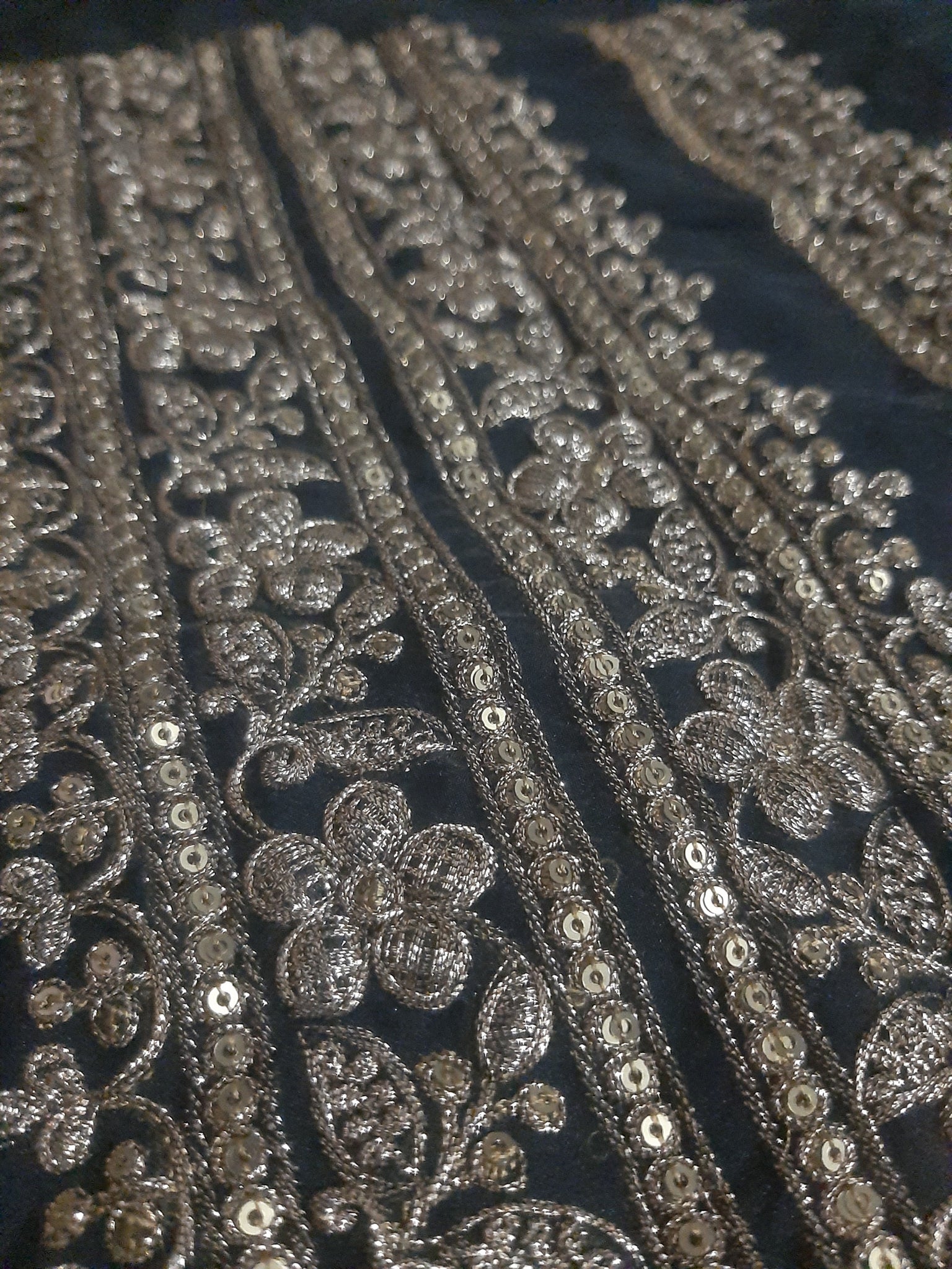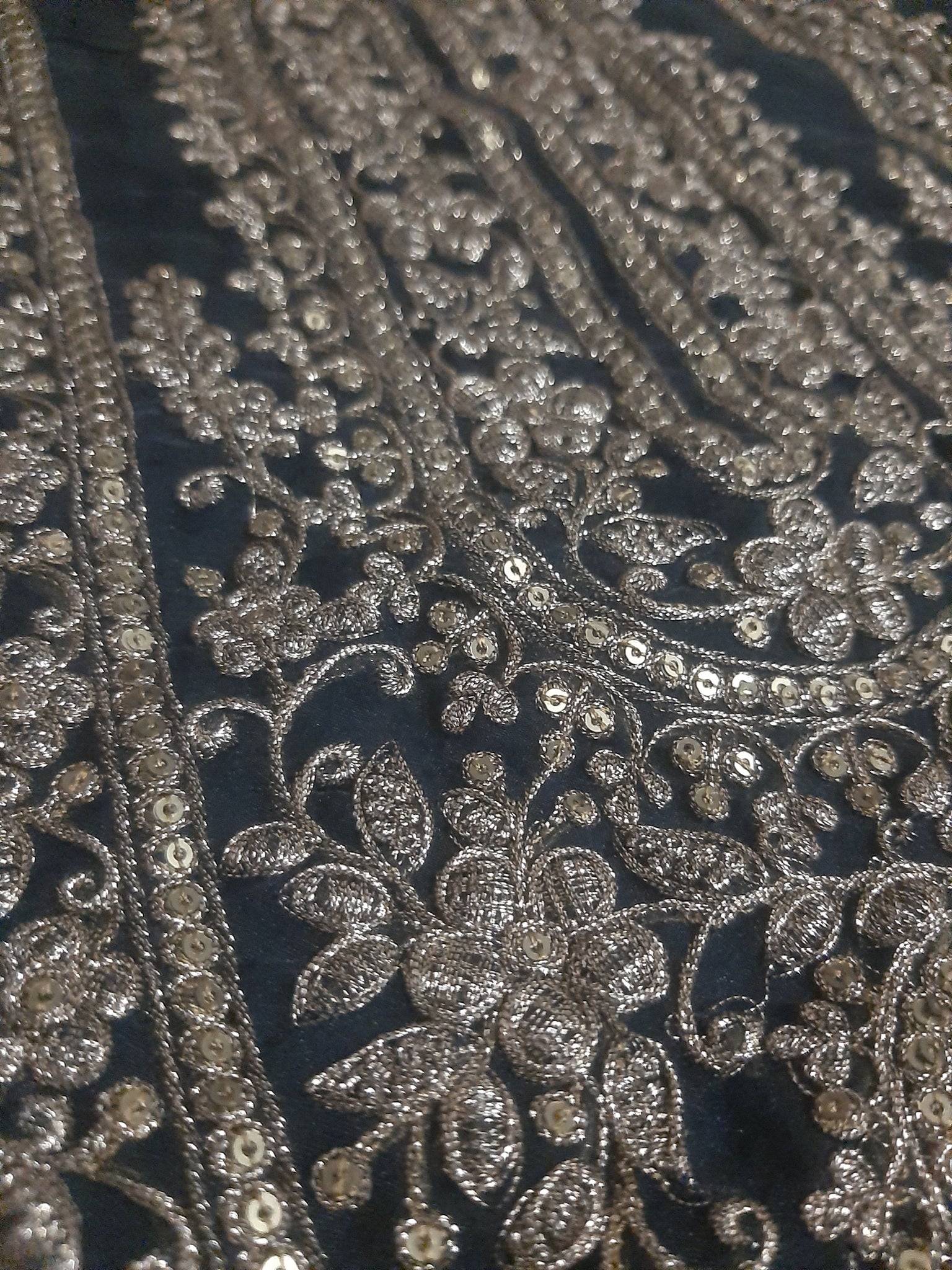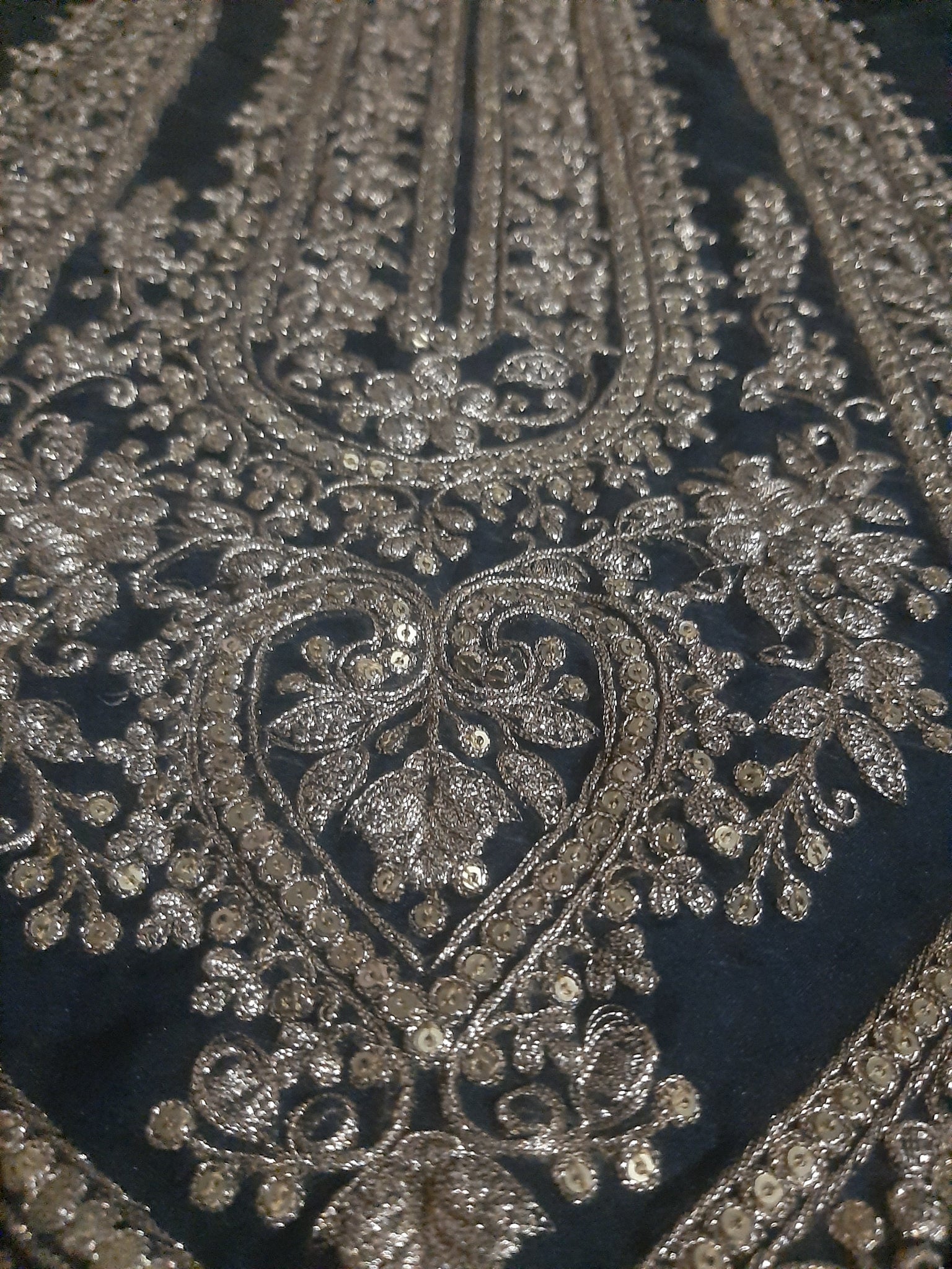 Fully thread and tilla embroidered with glittery sequins embellishments and foil work.