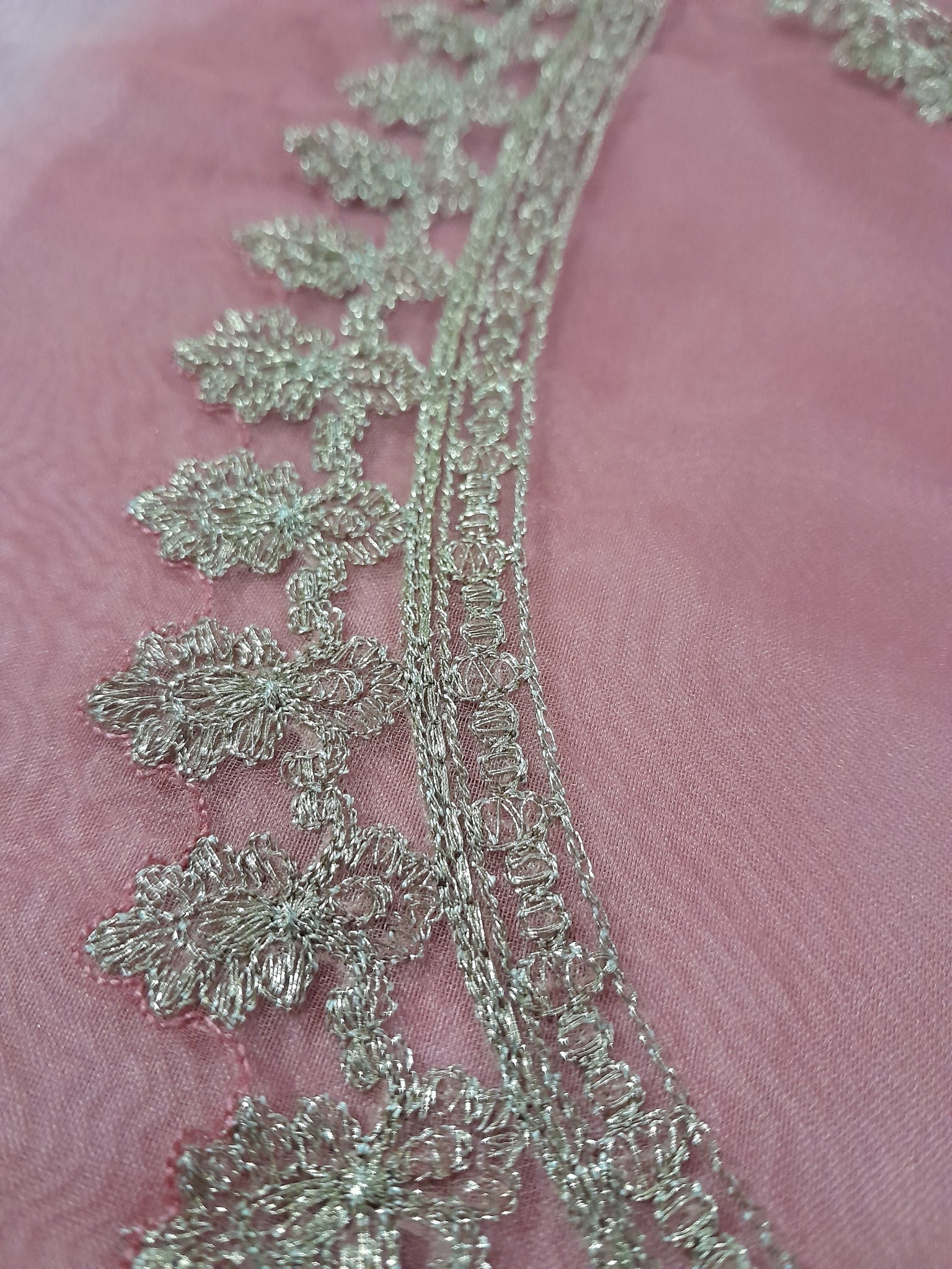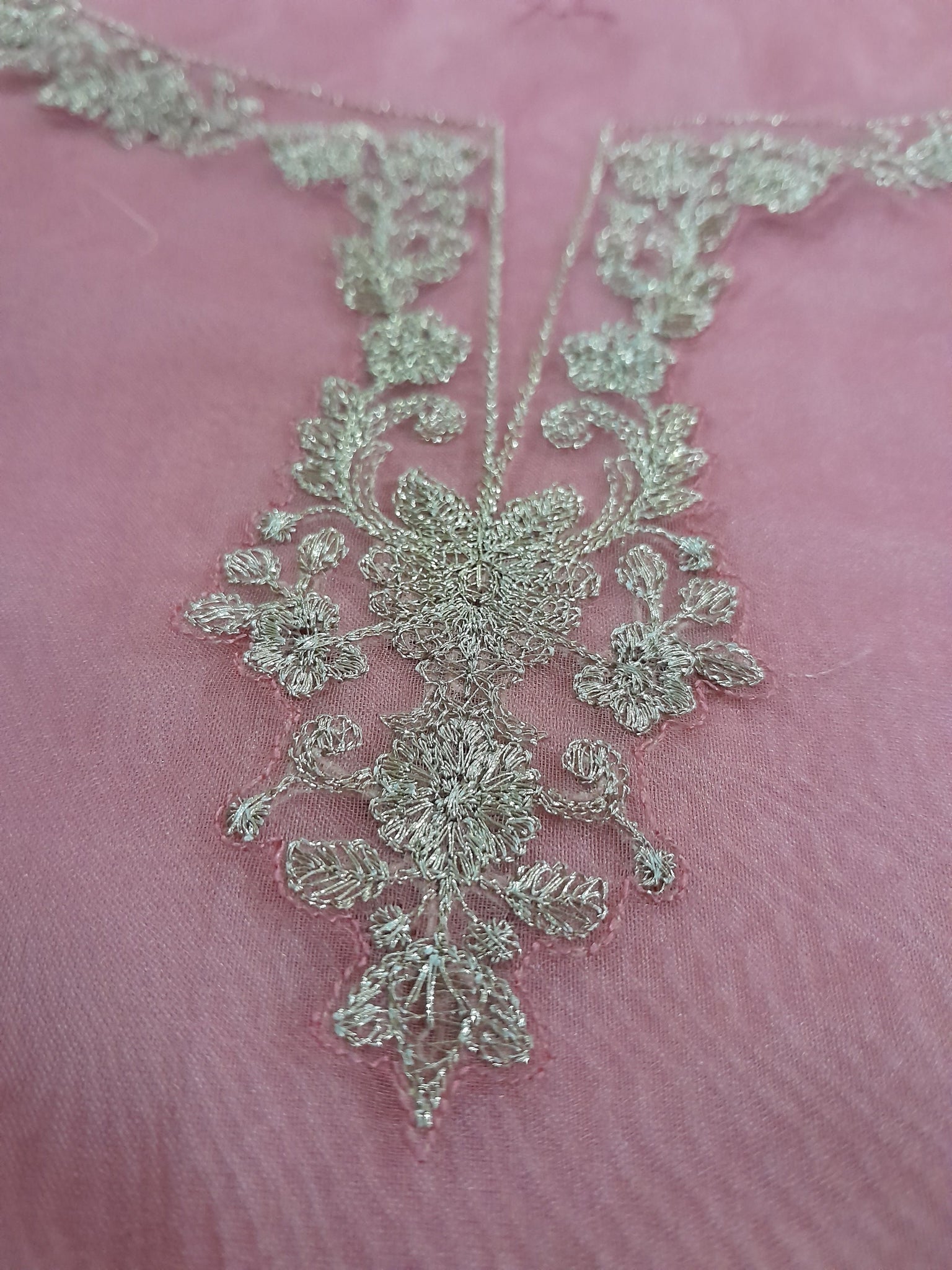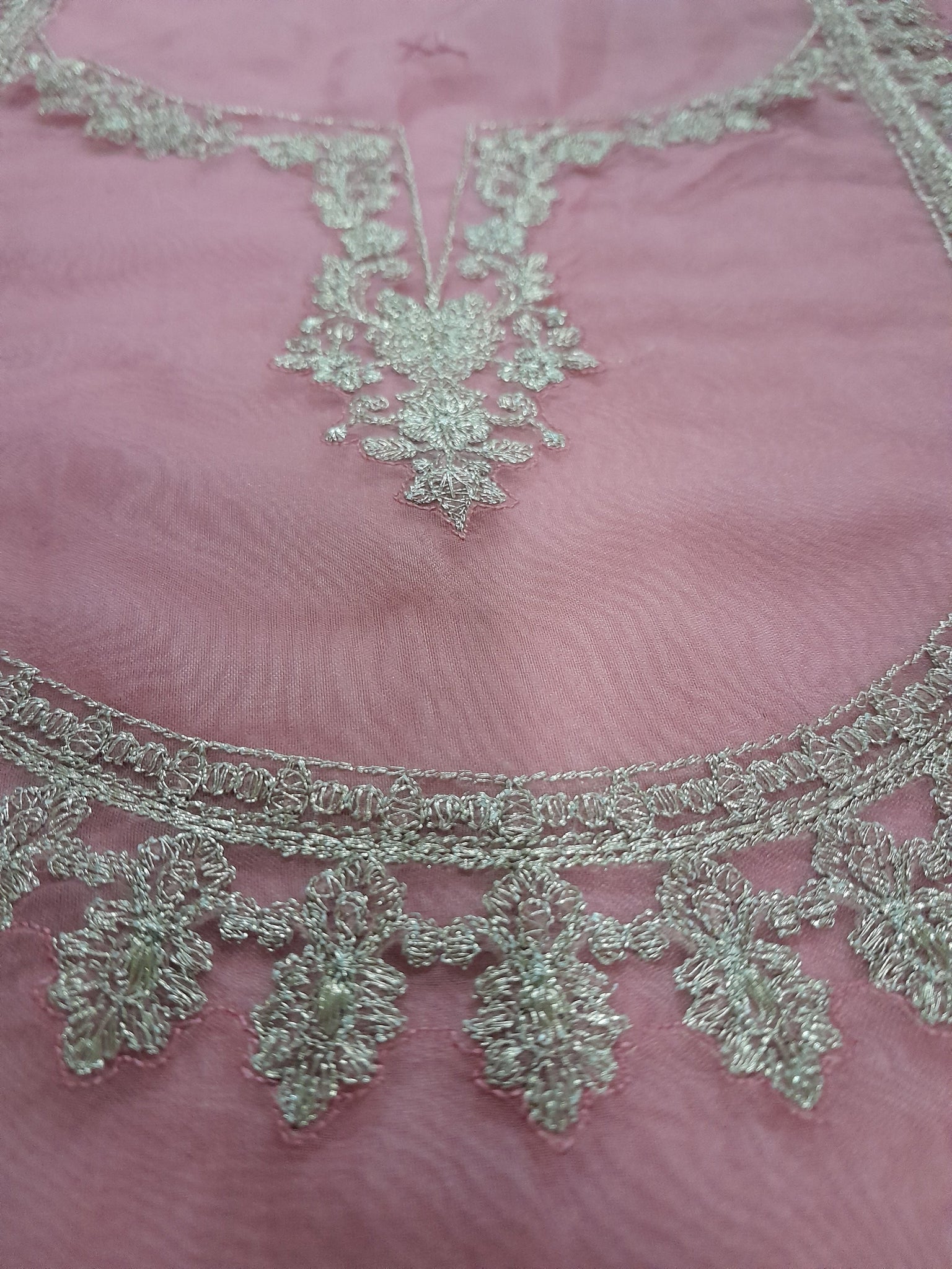 Neckline is heavily golden tilla embroidered on organza fabric.