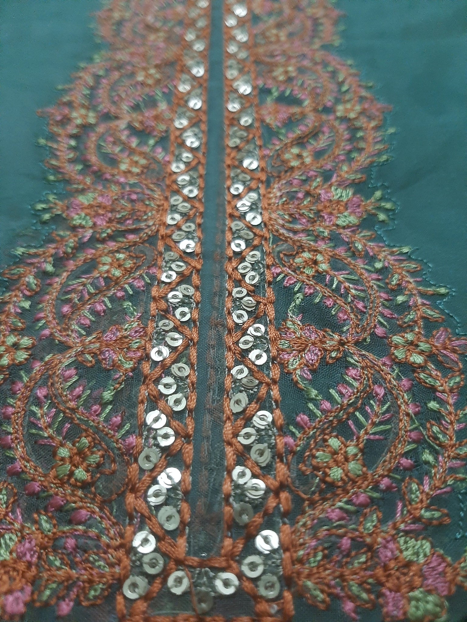 Neckline is fully thread embroidery with golden sequins embellishment.