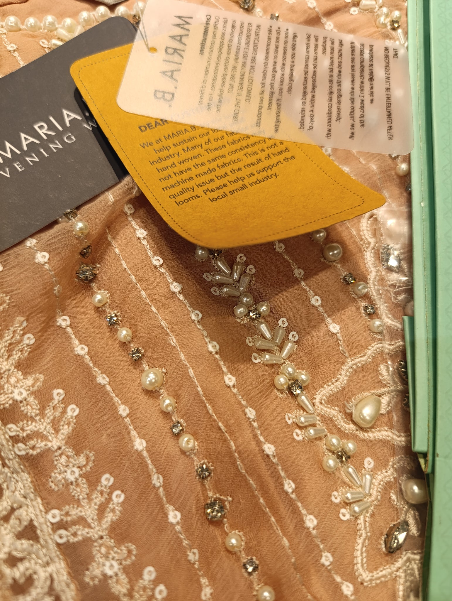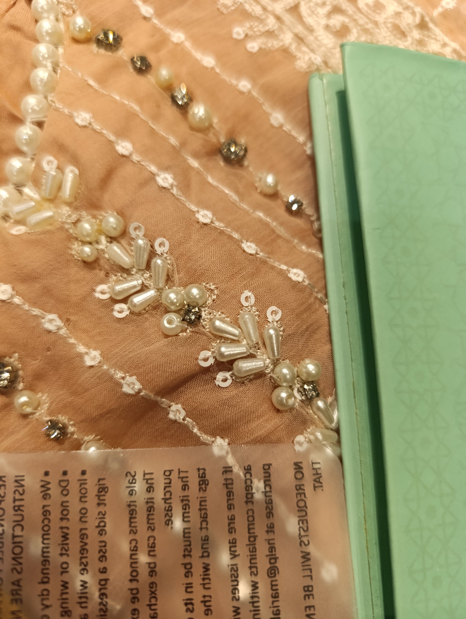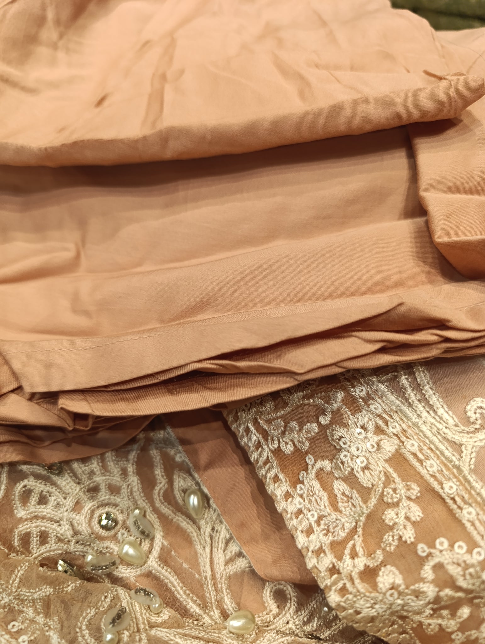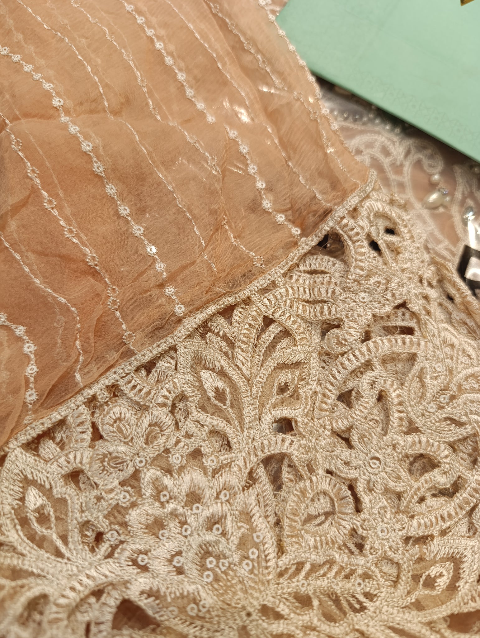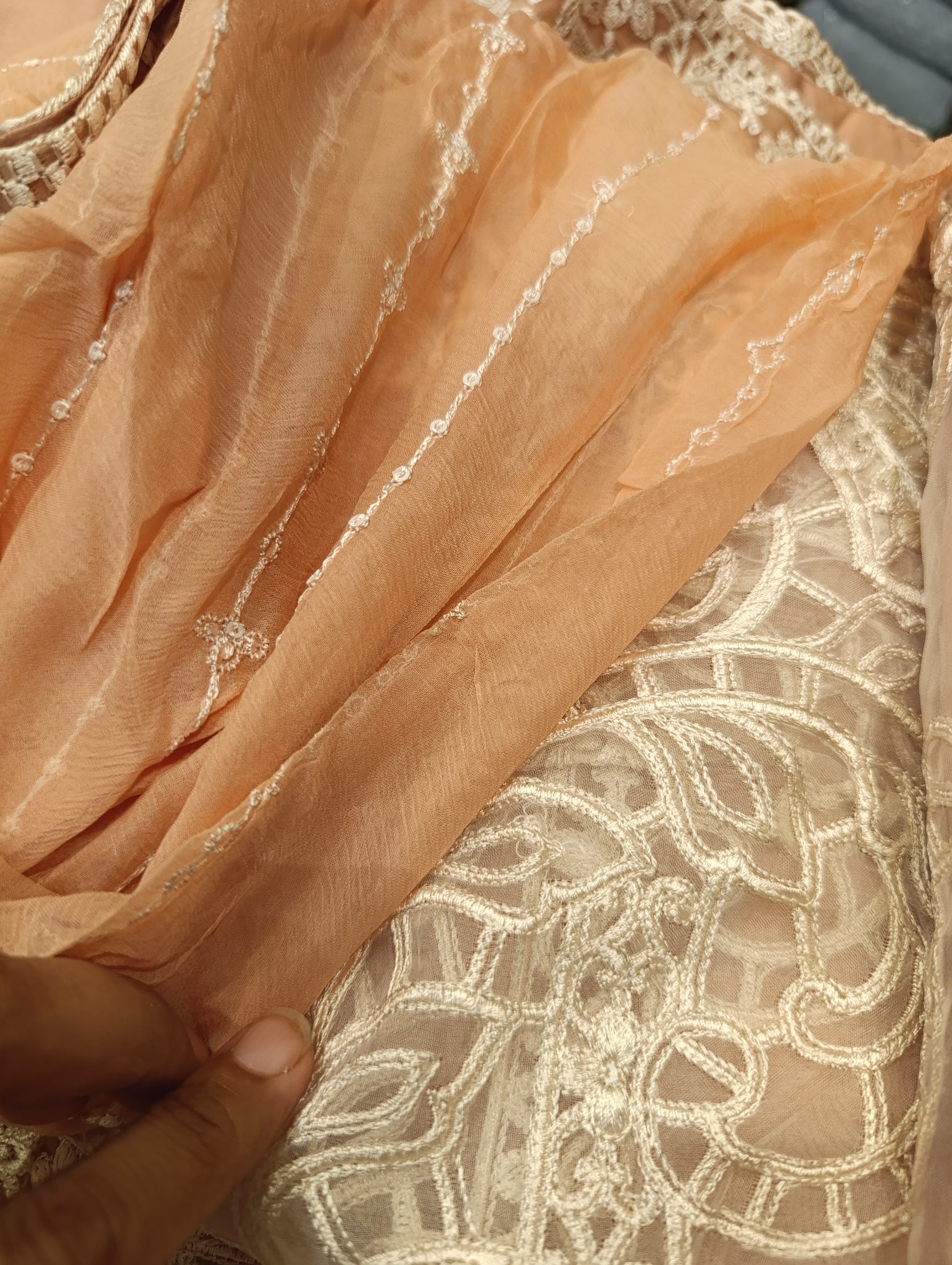 Crafting a stunningly visual composition with pearl beading, cutwork, and thread embroidery for timeless allure; this three-piece embroidered chiffon suit hosts a celestial coffee canvas crafting a captivating fusion with audacious floras and intricate classical elements. The profound design is juxtaposed with dyed wide-leg trousers and an embroidered dupatta elevated with sequins, culminating in a look design to unveil the inner muse within every woman and create an unparalleled statement during the summer soirees.