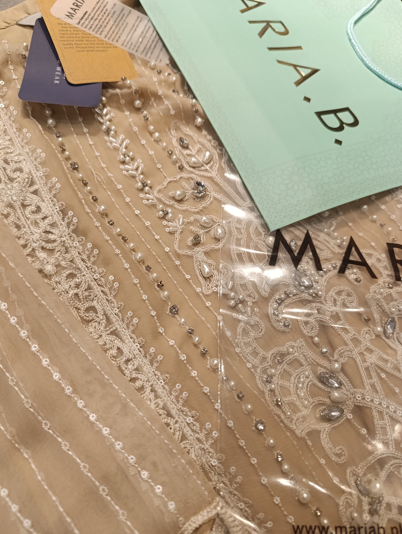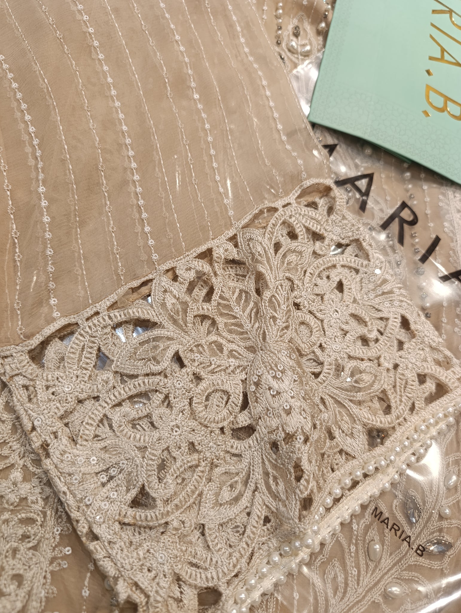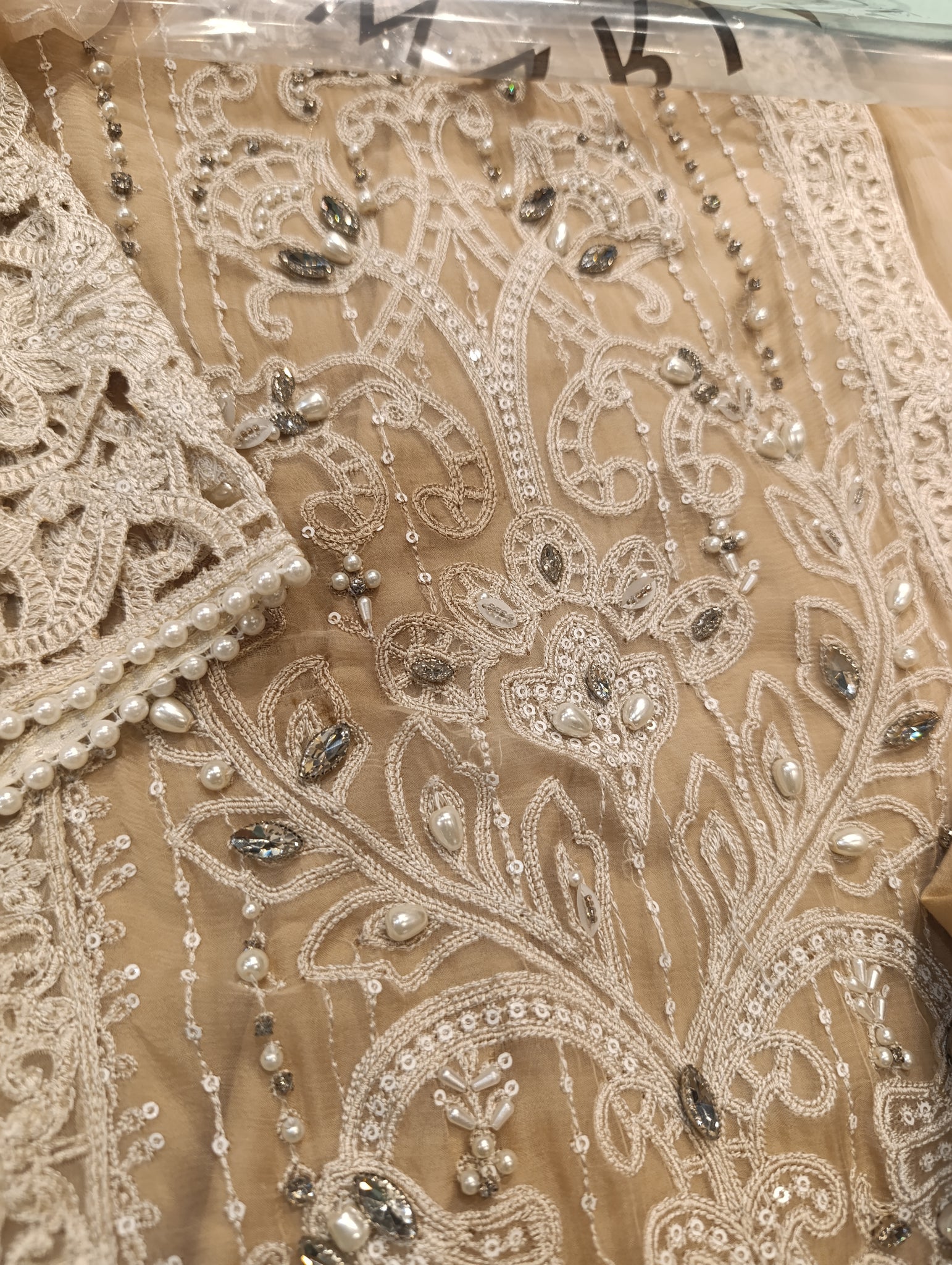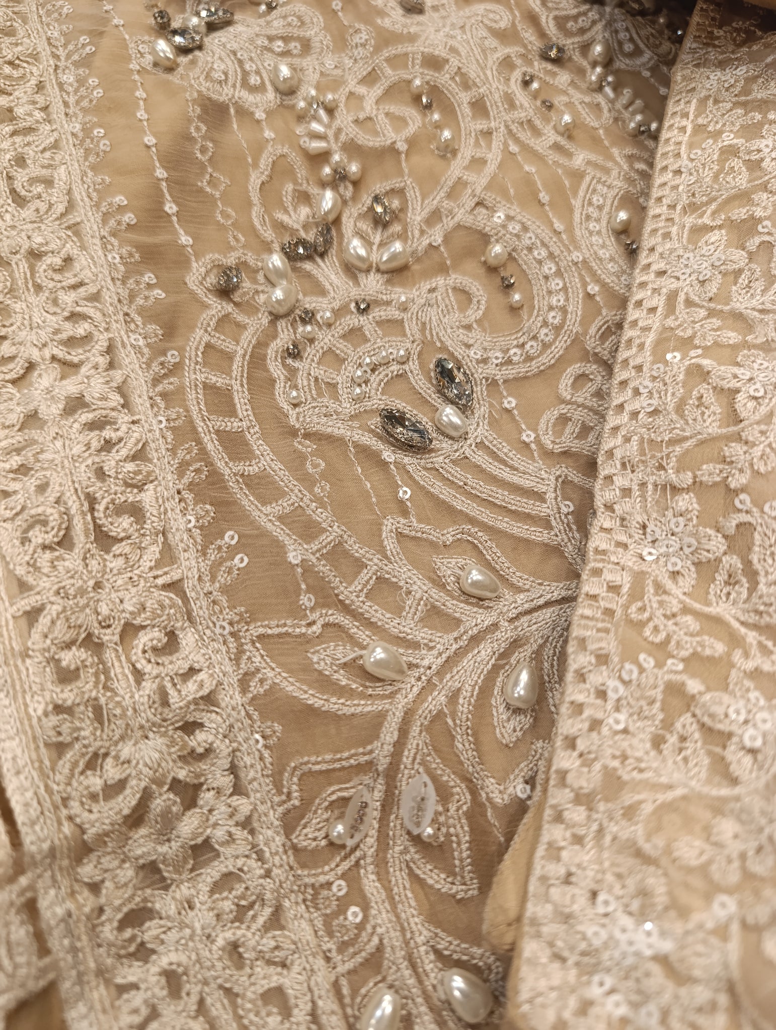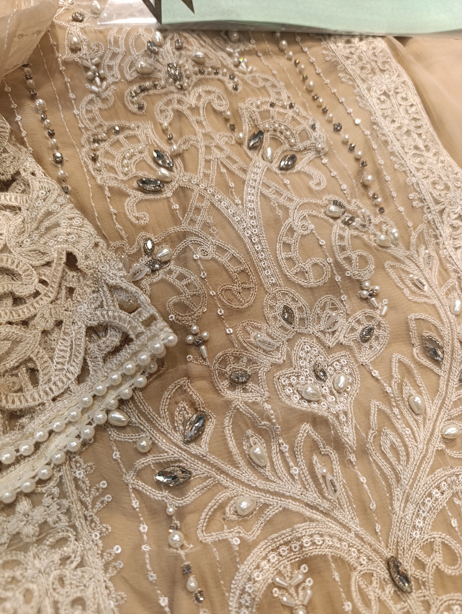 Crafting a stunningly visual composition with pearl beading, cutwork, and thread embroidery for timeless allure; this three-piece embroidered chiffon suit hosts a celestial coffee canvas crafting a captivating fusion with audacious floras and intricate classical elements. The profound design is juxtaposed with dyed wide-leg trousers and an embroidered dupatta elevated with sequins, culminating in a look design to unveil the inner muse within every woman and create an unparalleled statement during the summer soirees.