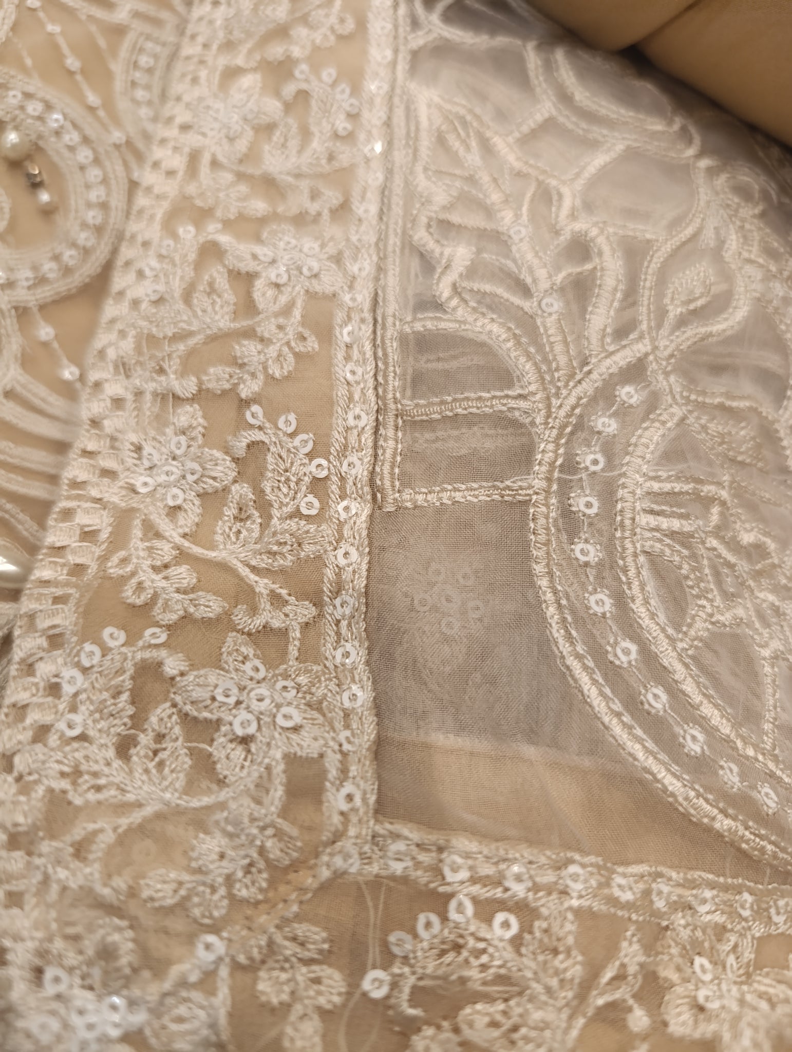Details: All Over Cutwork, Pearl & Thread Embroidered Shirt, Round Embellished Neckline