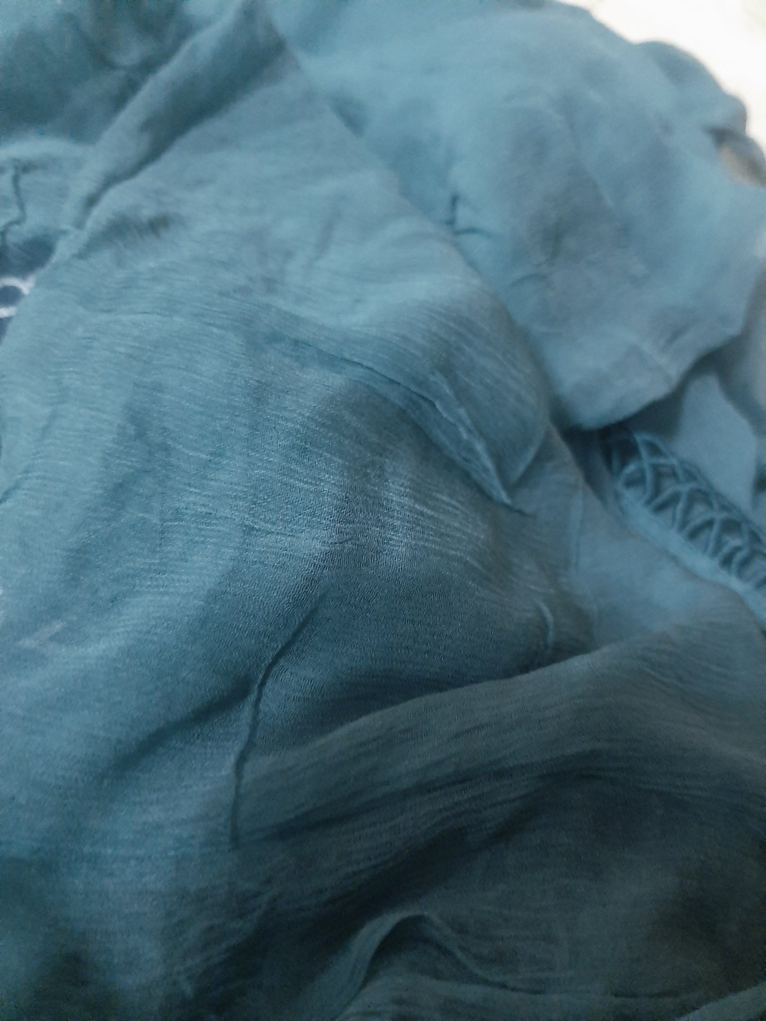 Fully plain dyed chiffon duppta with four sided machine stitched shuttle lace with double fold stitching and fabric brand tag along.