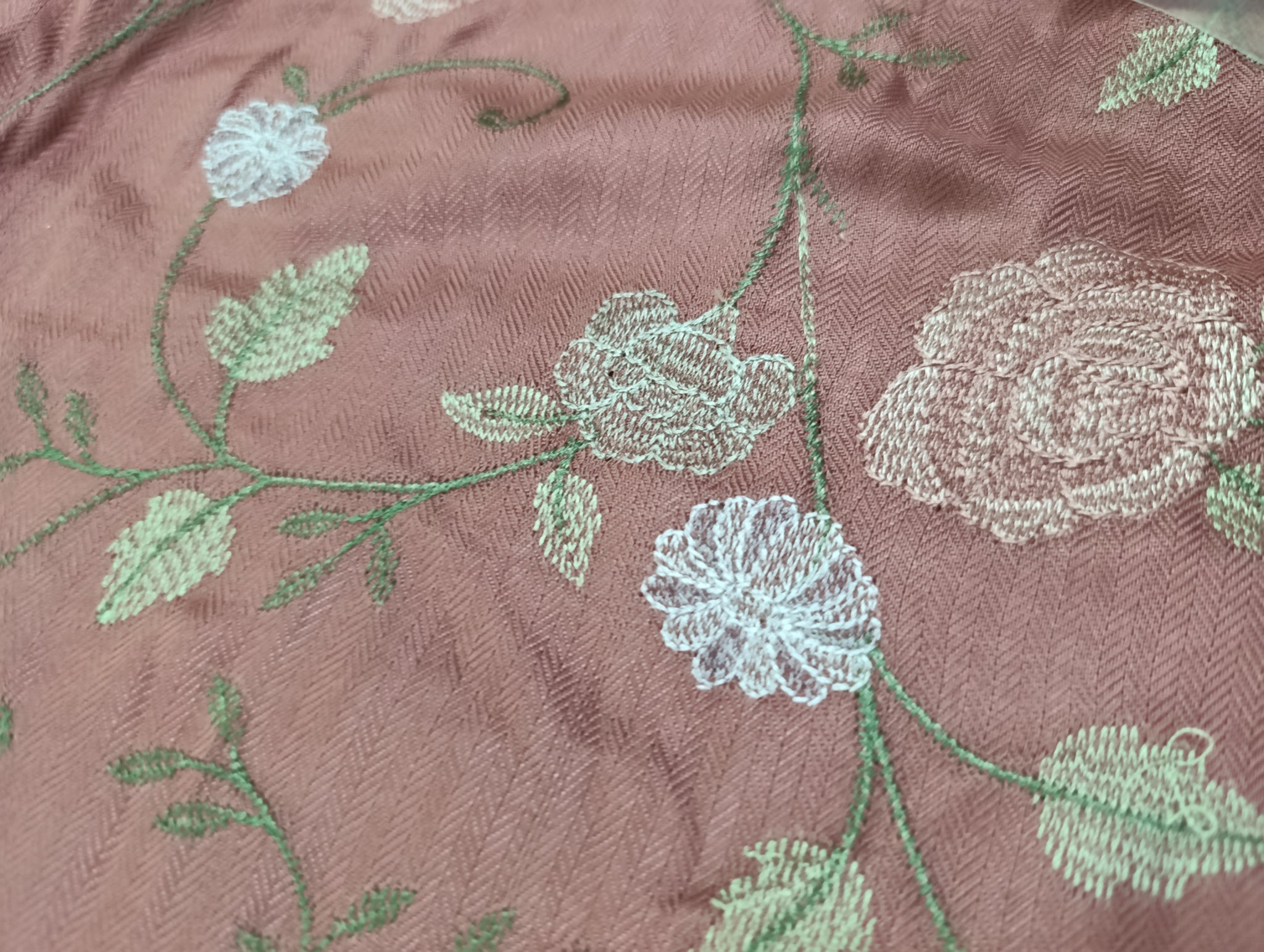 Fully thread embroidered with broad 4 sided border and and regular floral motives on overall fabric. Stitched with four sided border.