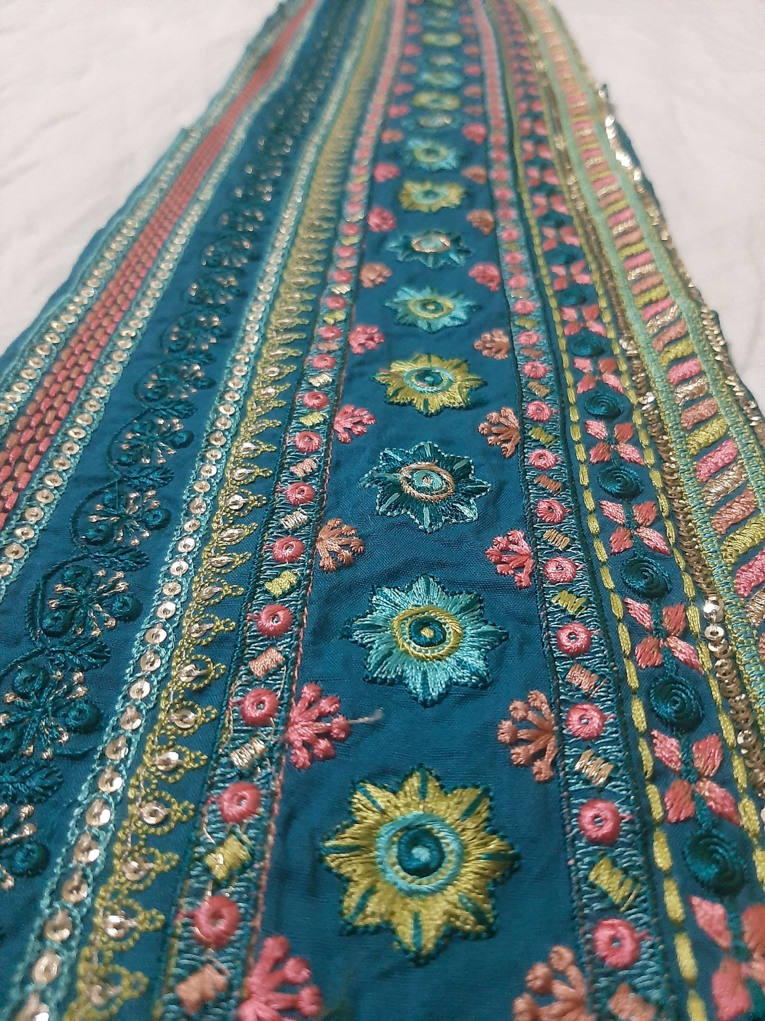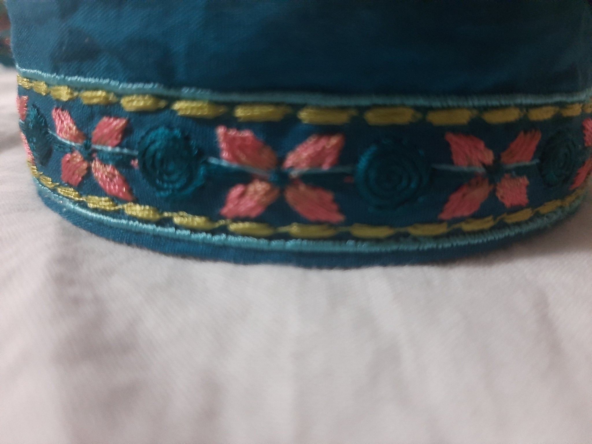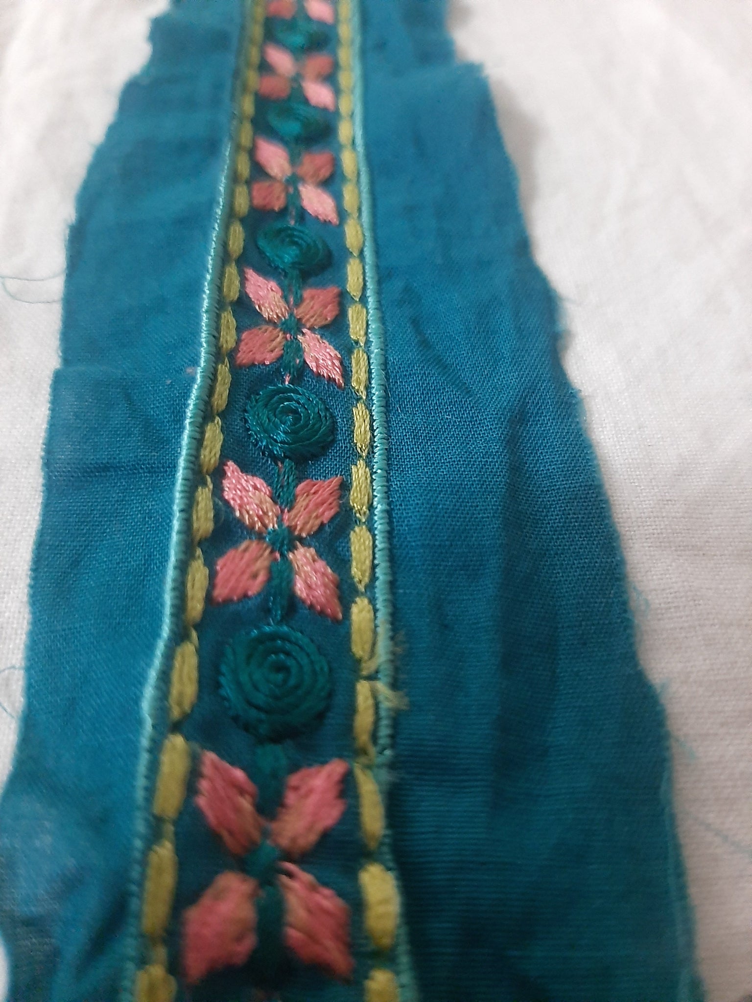 Thin teal blue / zink patch: Semi-stitched: one side machine stitched or kinari folded length 22 inches width 0.75 inches as Neckline teal blue / zink patch: Heavily thread embroidered.