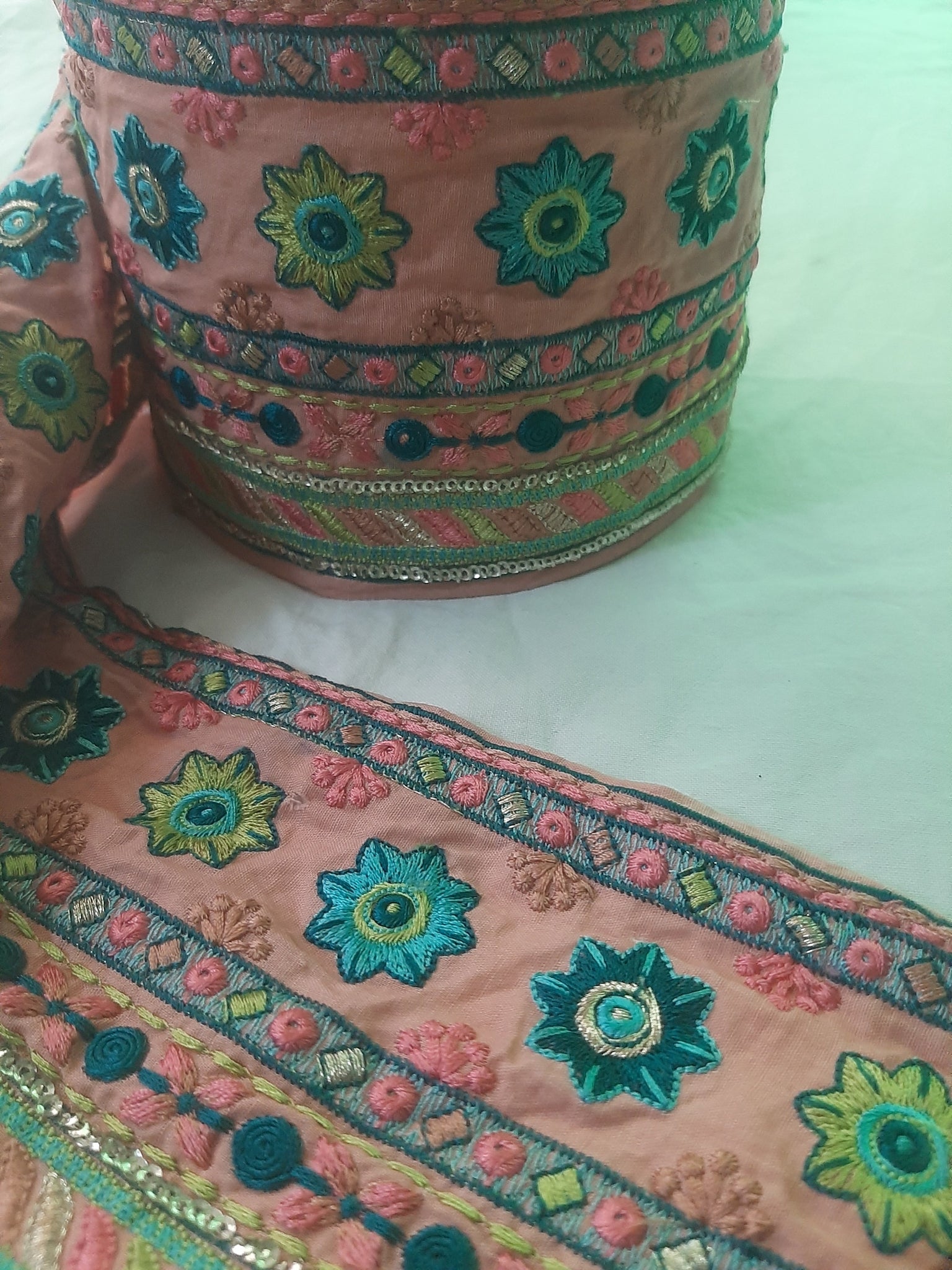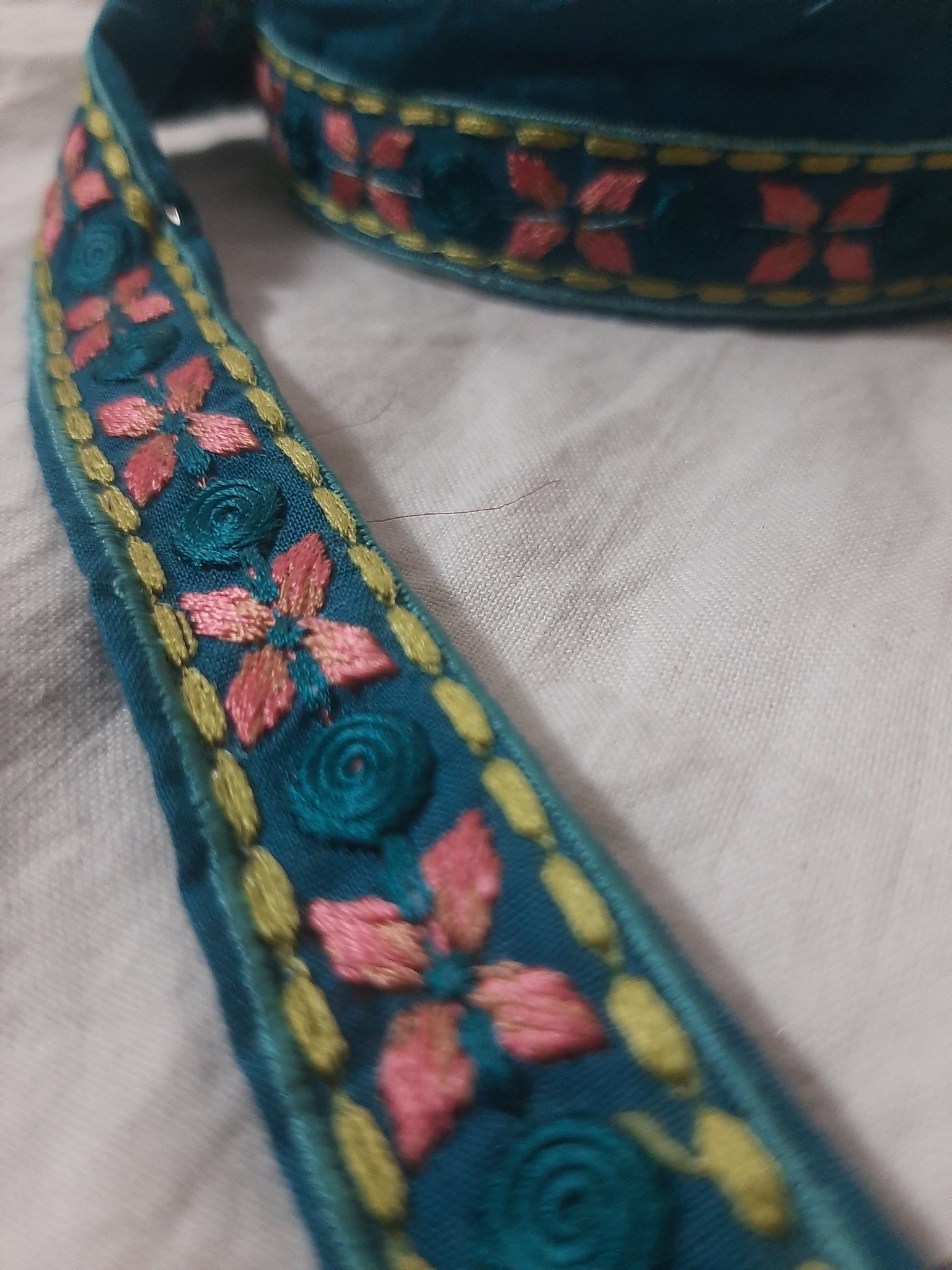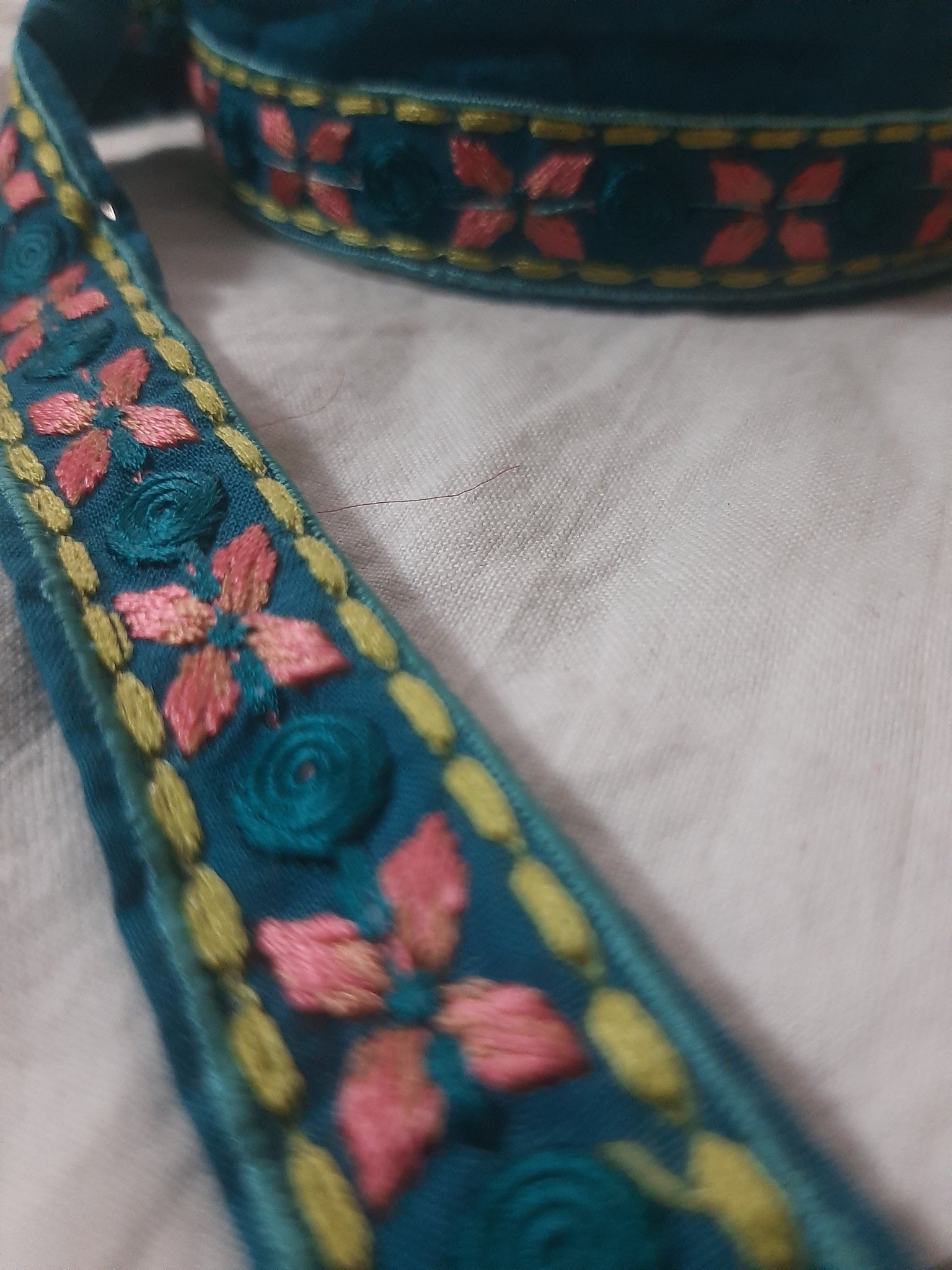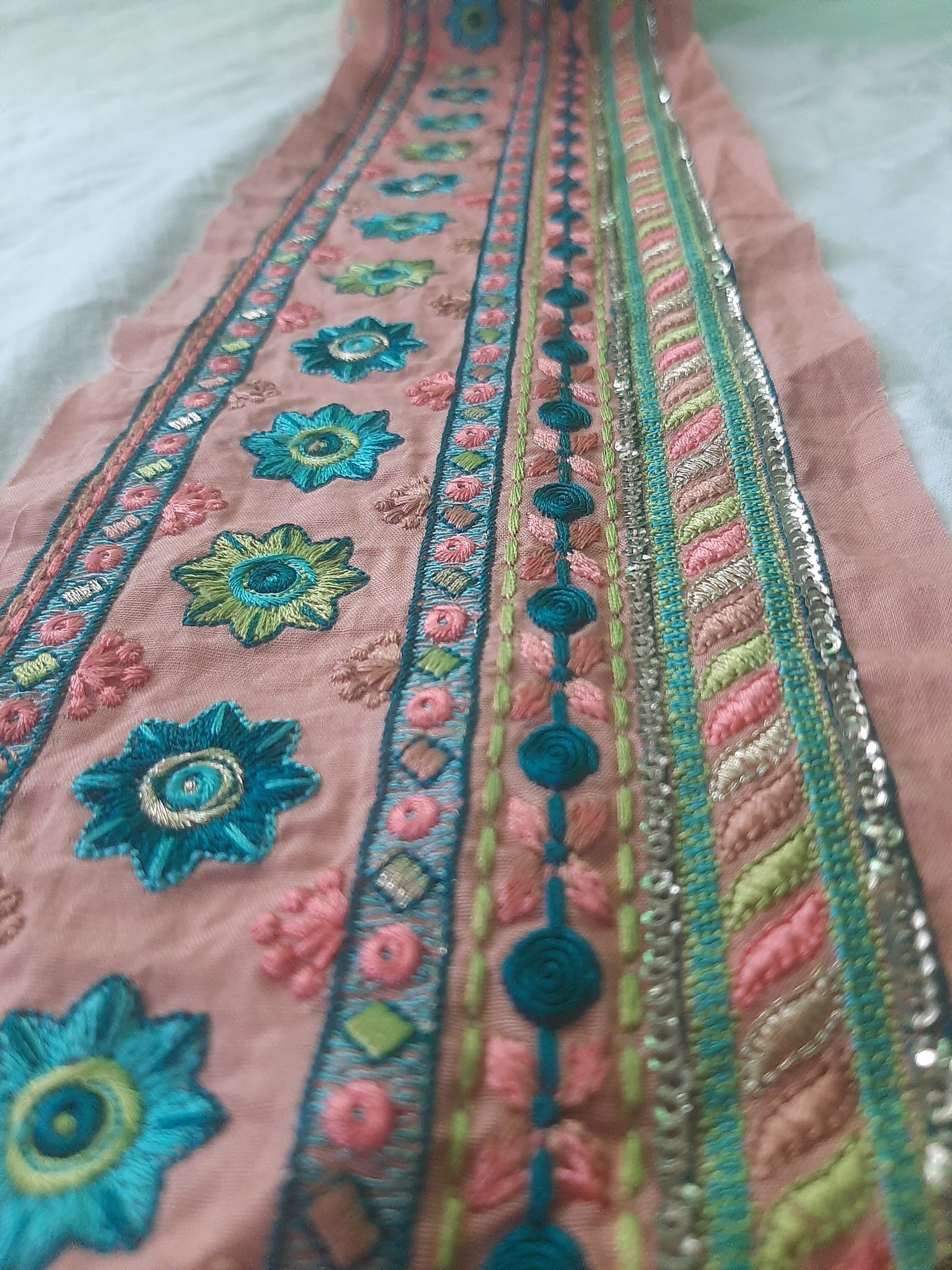Thin teal blue / zink patch: Semi-stitched: one side machine stitched or kinari folded length 22 inches width 0.75 inches as Neckline teal blue / zink patch: Heavily thread embroidered.