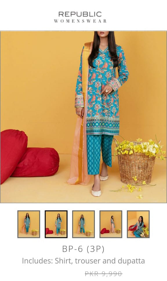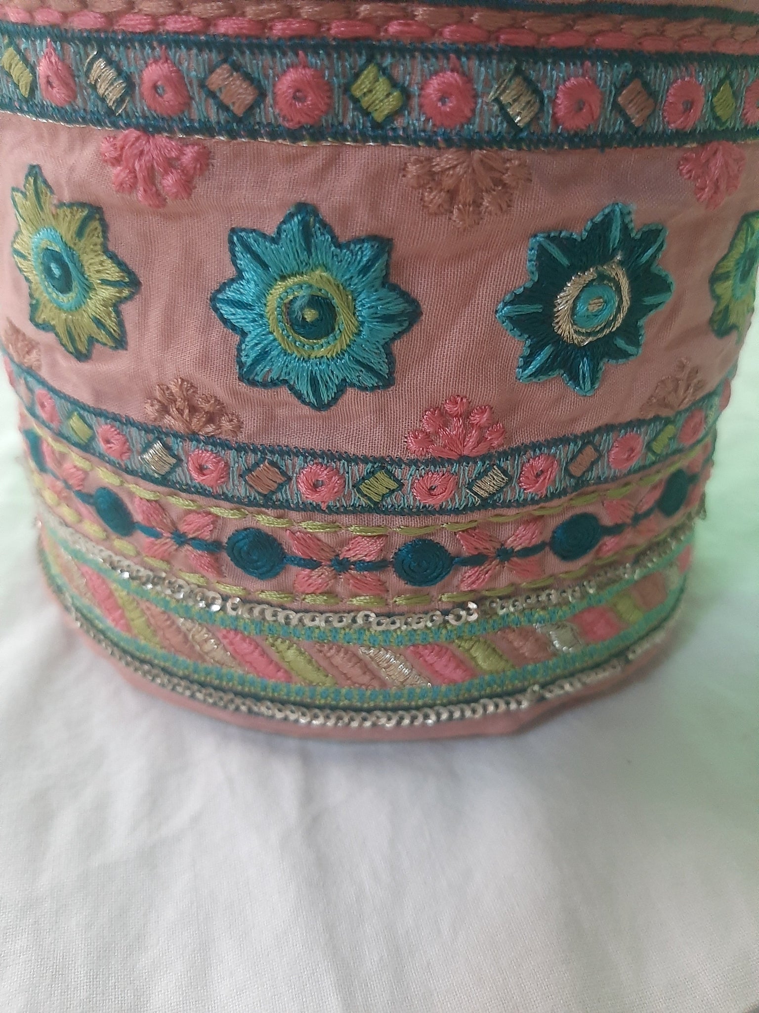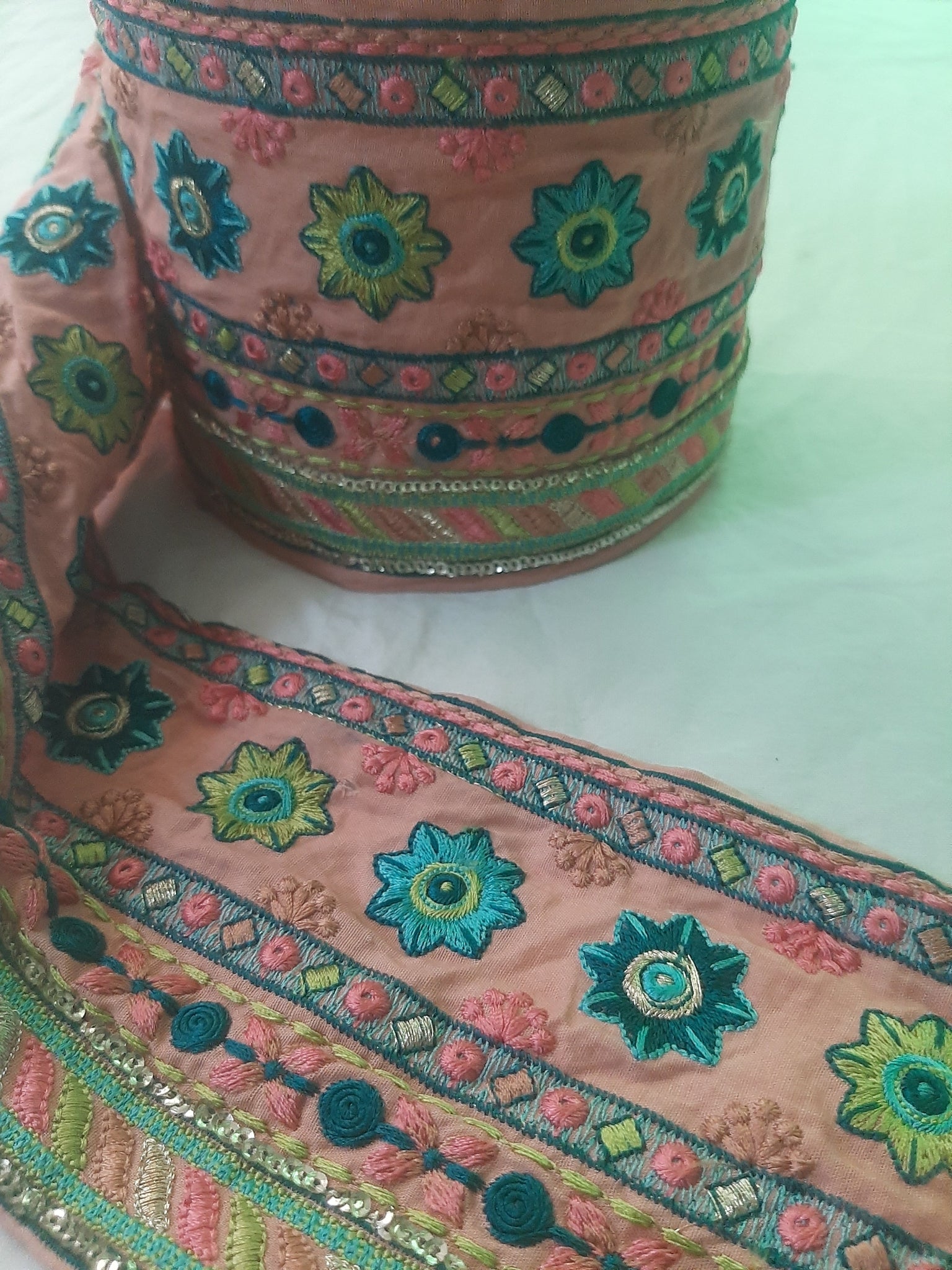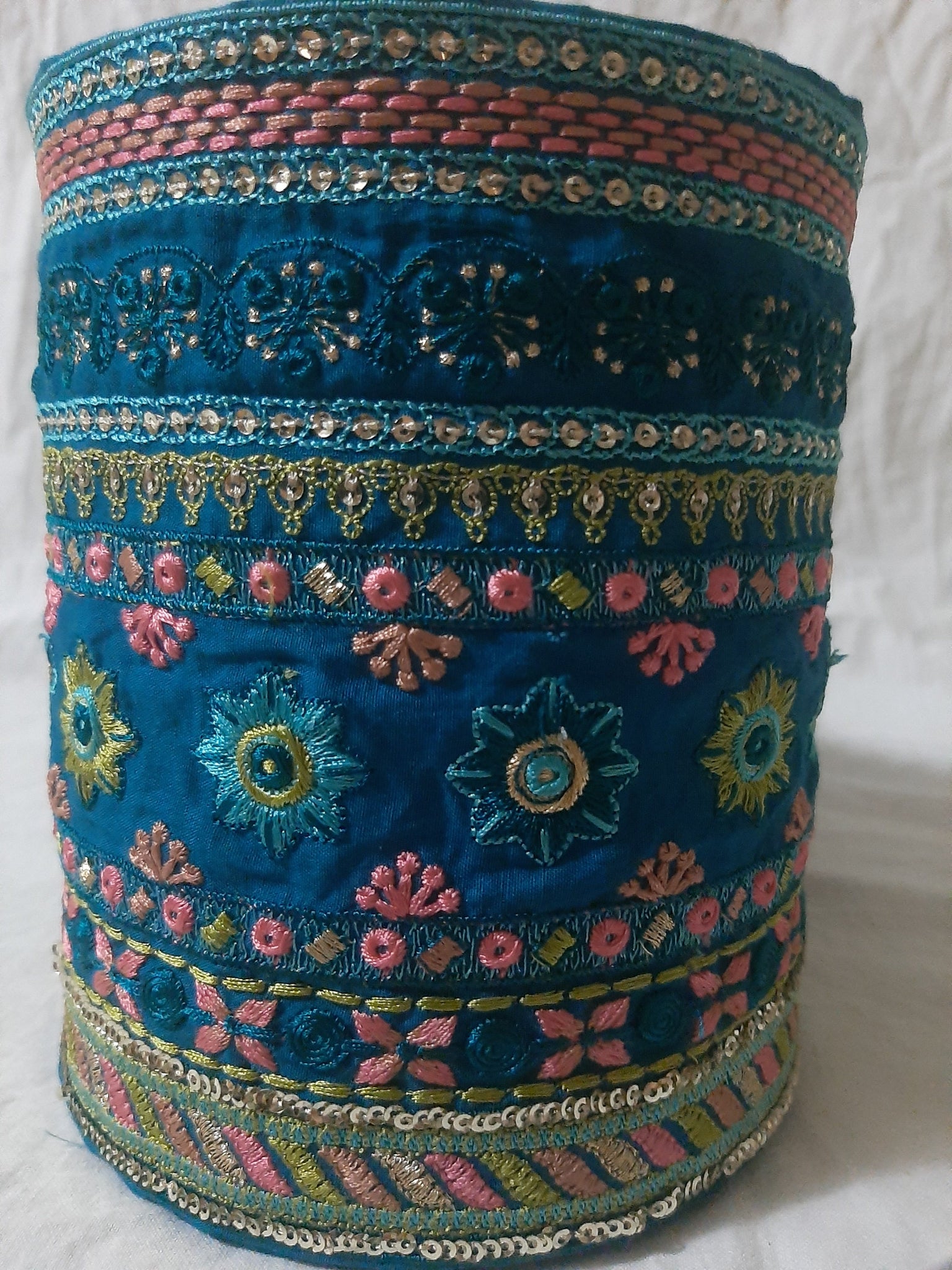 Thin teal blue / zink patch: Semi-stitched: one side machine stitched or kinari folded length 22 inches width 0.75 inches as Neckline teal blue / zink patch: Heavily thread embroidered.